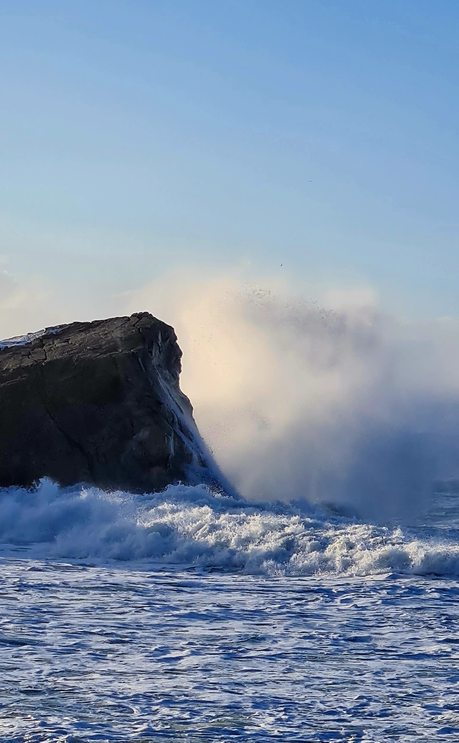 Der Sturm hat uns verschont, aber das Meer präsentiert sich in seiner ganzen Stärke. Riesige Wellen laufen auf den Strand zu. Ein irres Schauspiel!