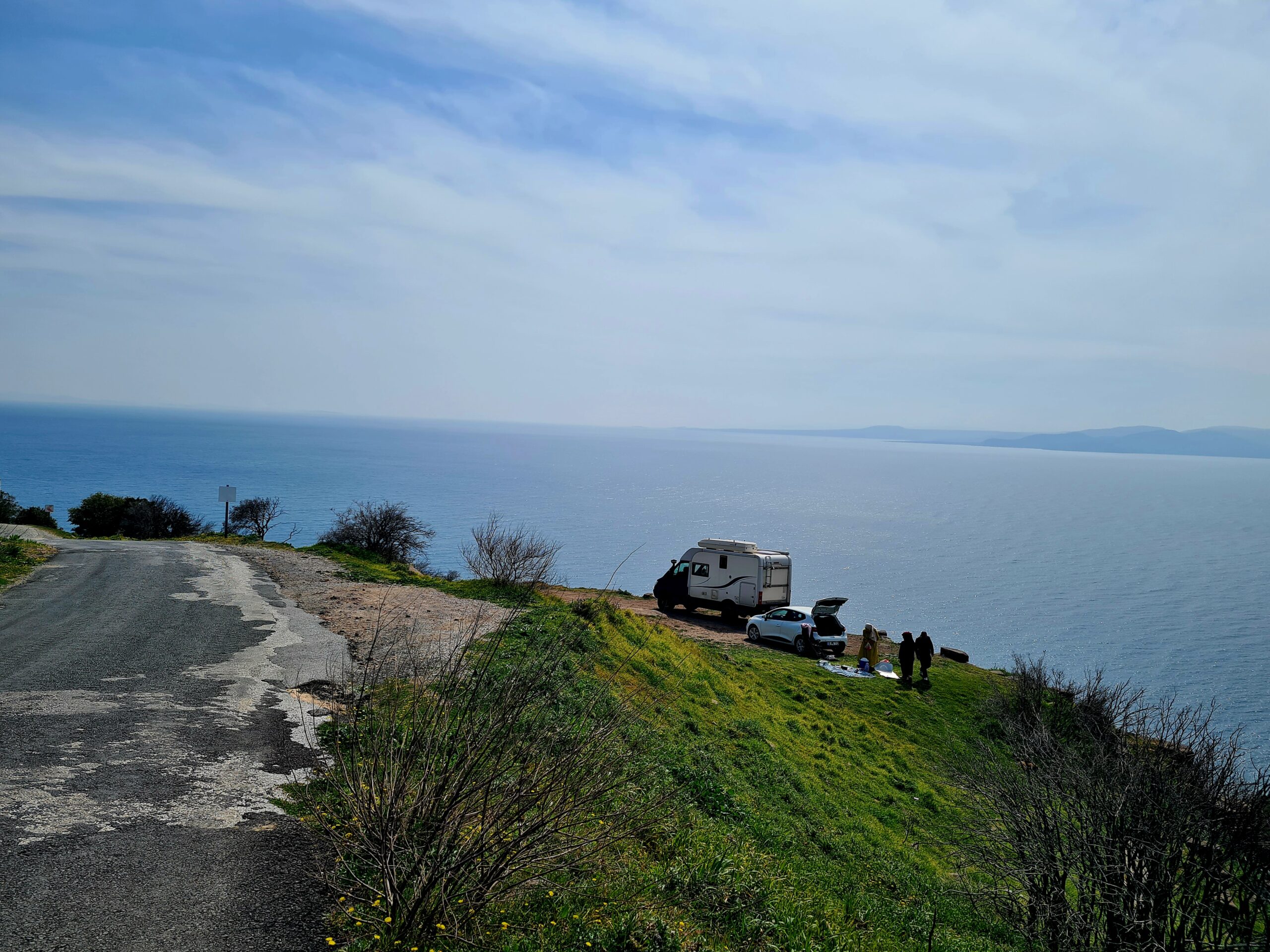 Erstmal machen wir ein Picknick mit Aussicht zur Insel Lesbos.