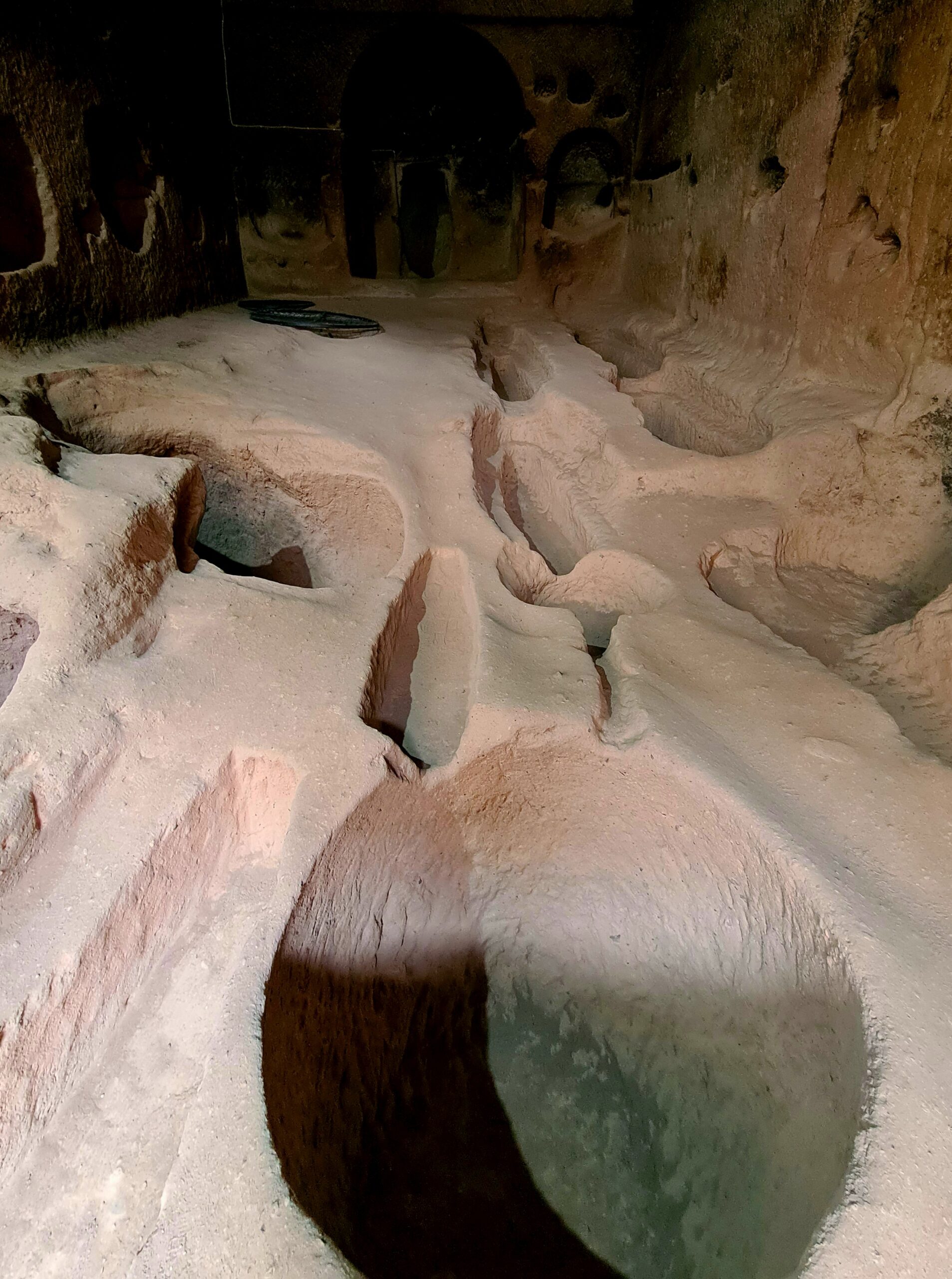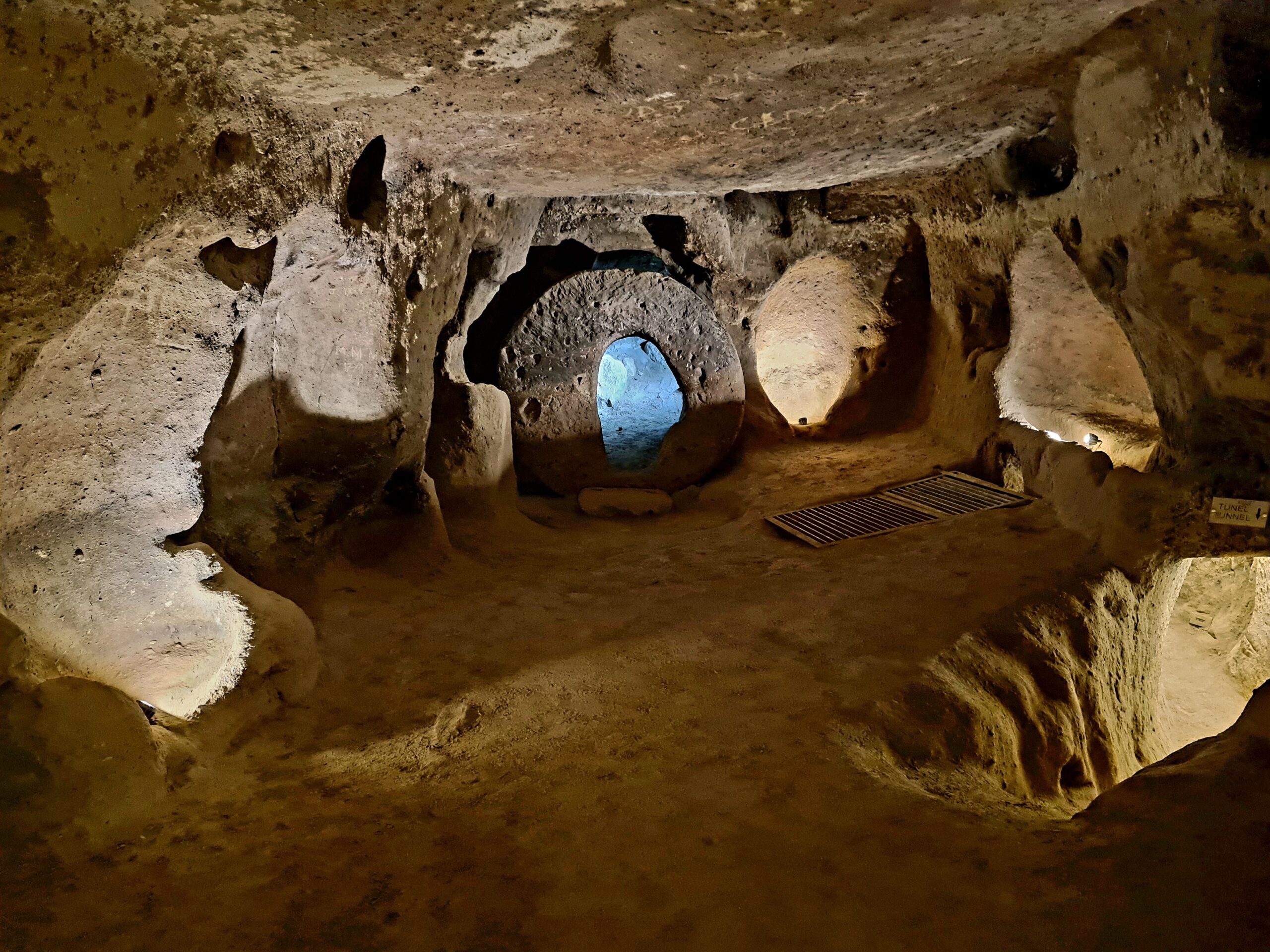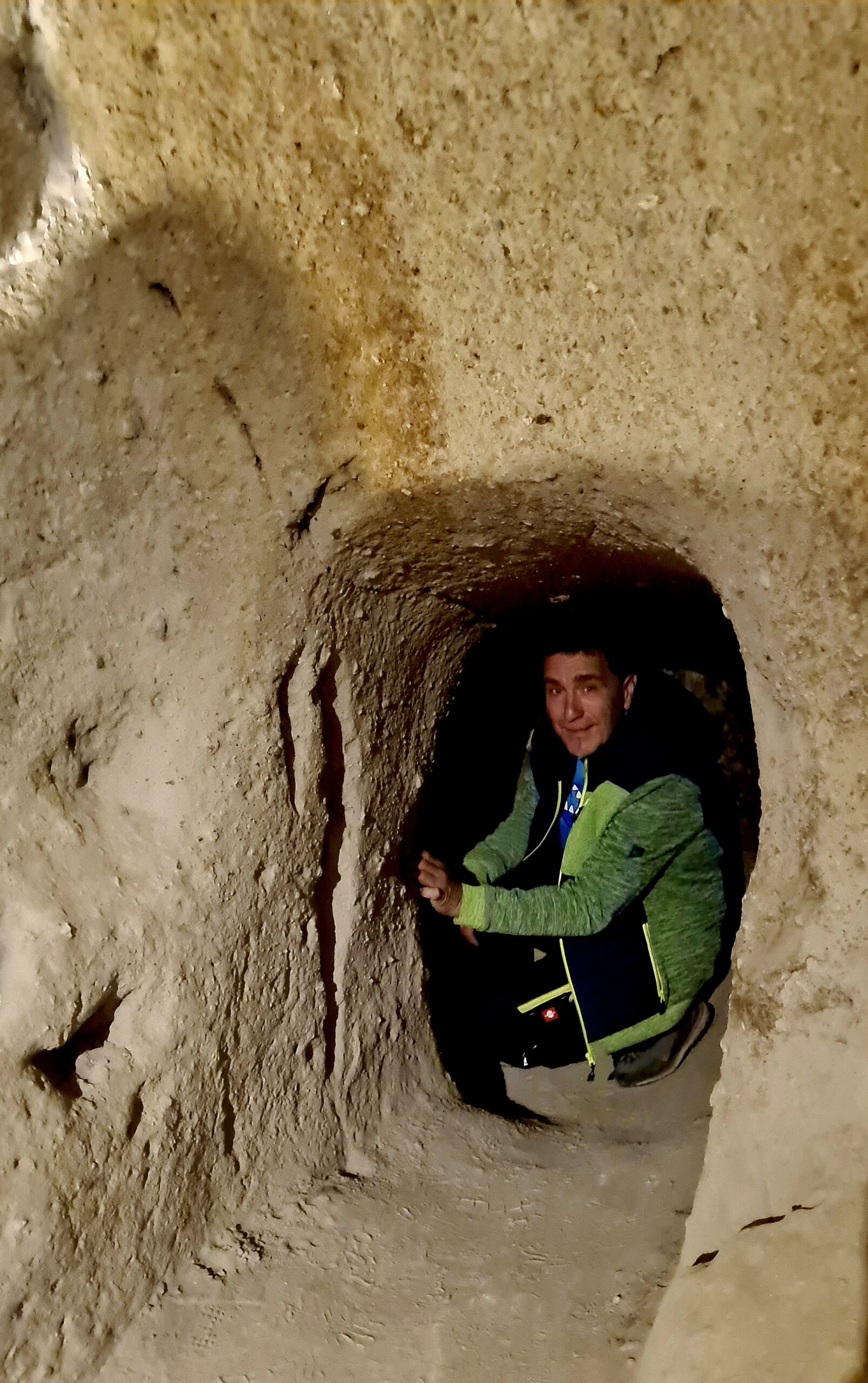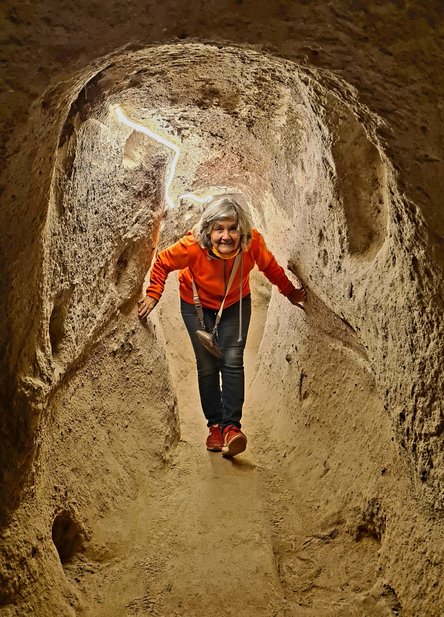 Dann fahren wir weiter zu einer unterirdischen Stadt. Es gibt hier in Kappadokien mindestens 50 unterirdische Städte. Manche haben unterirdisch 18 Stockwerke und können 20 000 Menschen aufnehmen. Es gab ein ausgeklügeltes Kommunikationssystem und Belüftungsschächte. Es ist kaum zu fassen, dass man schon 800 nach Christus solche Projekte umsetzen konnte.