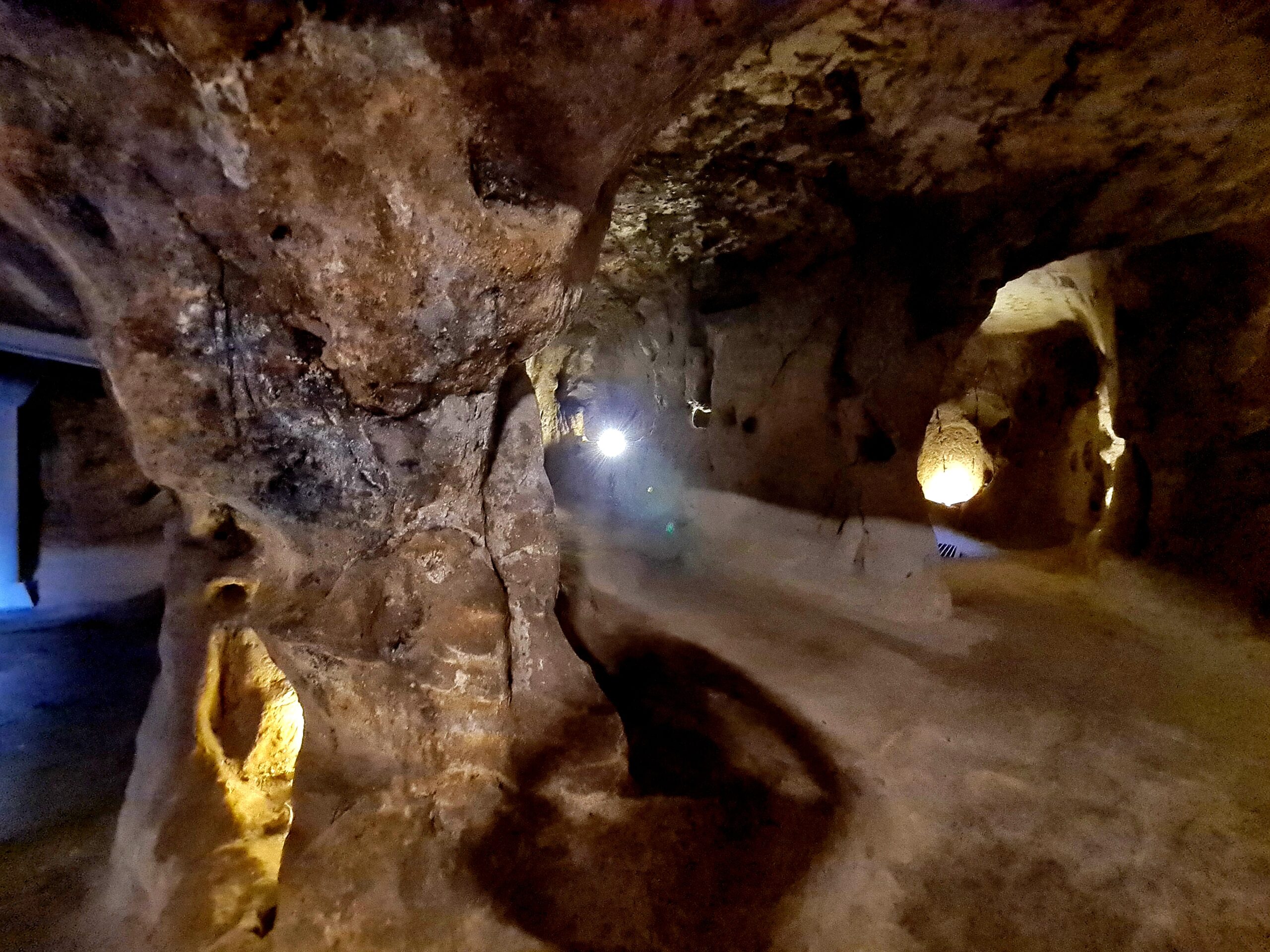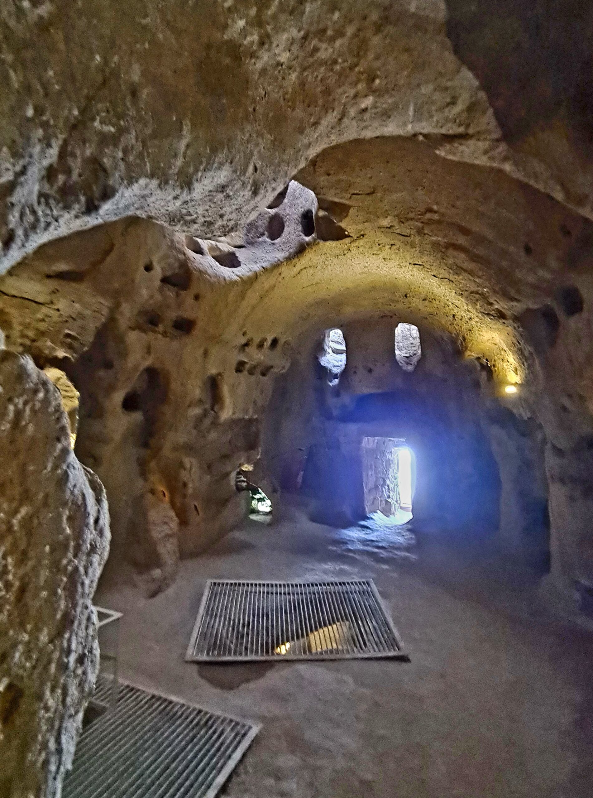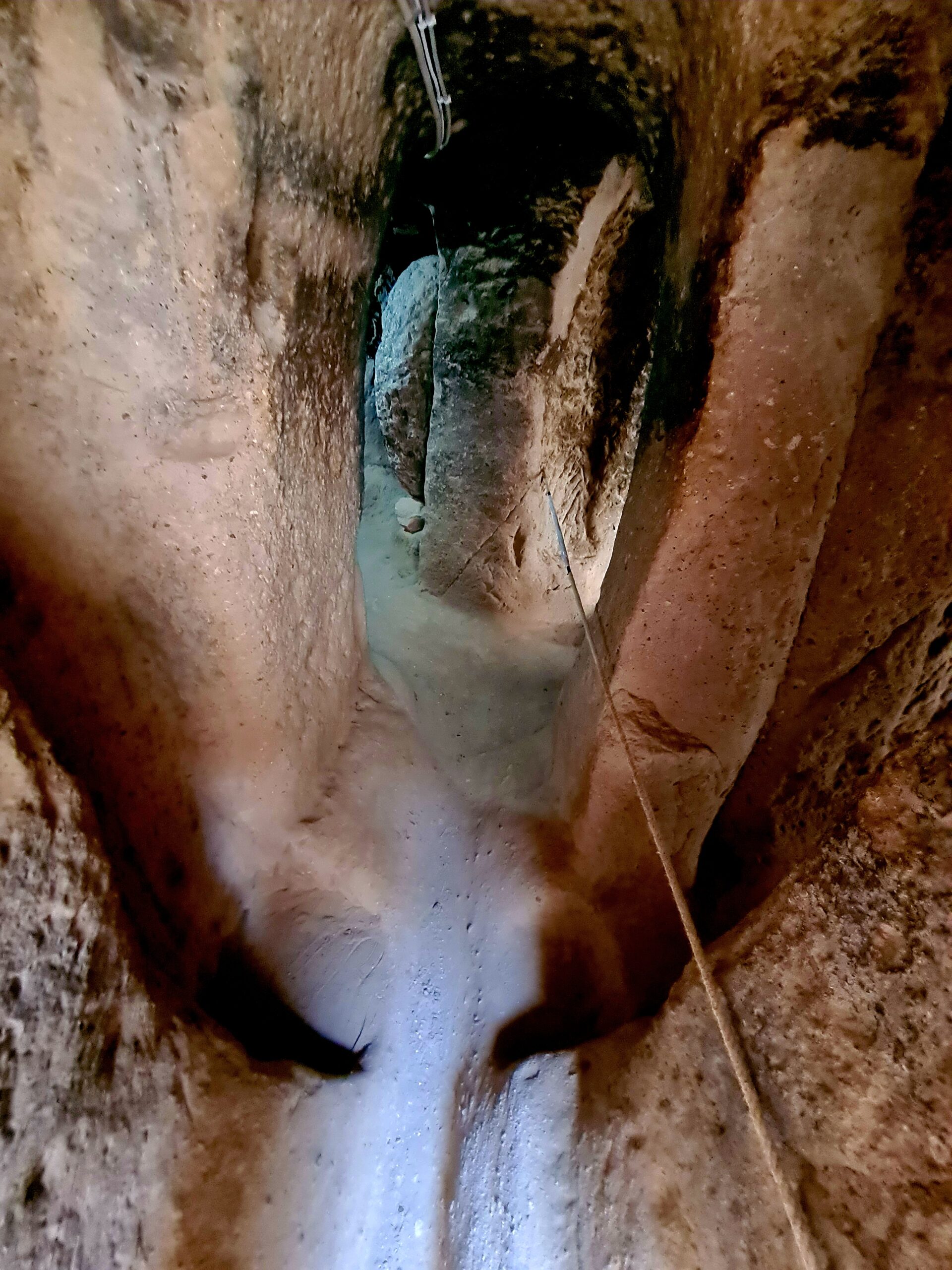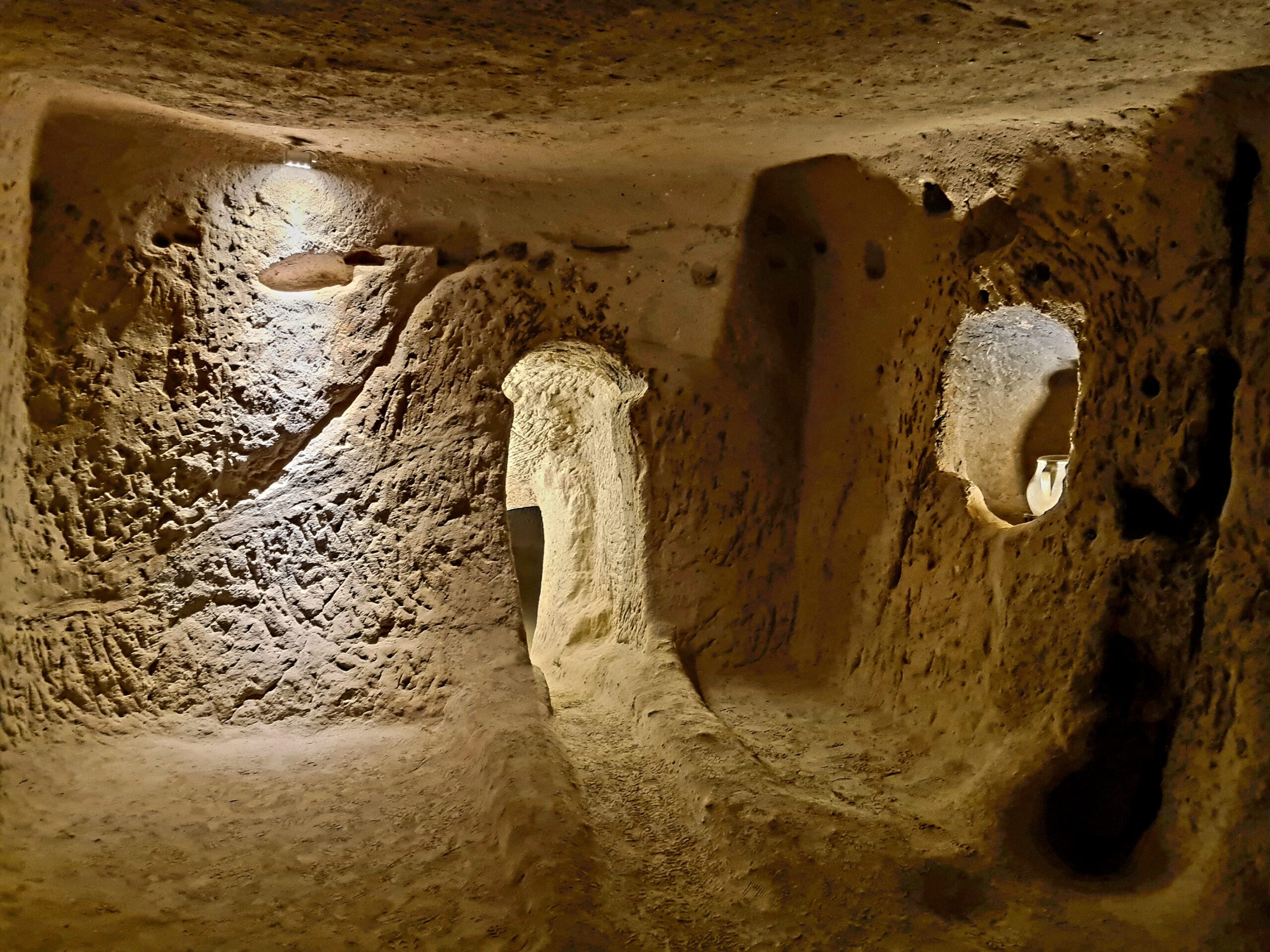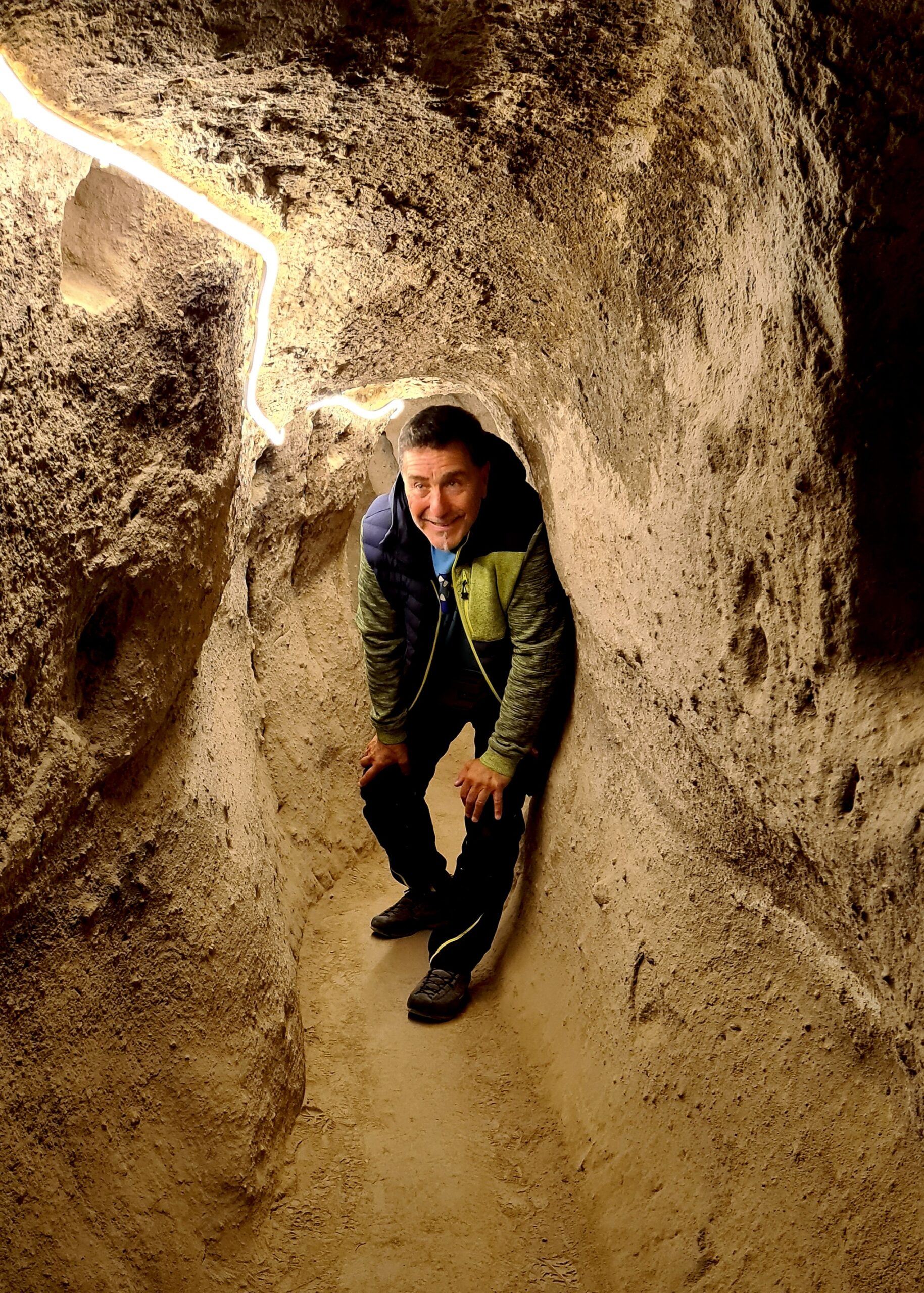 Dann fahren wir weiter zu einer unterirdischen Stadt. Es gibt hier in Kappadokien mindestens 50 unterirdische Städte. Manche haben unterirdisch 18 Stockwerke und können 20 000 Menschen aufnehmen. Es gab ein ausgeklügeltes Kommunikationssystem und Belüftungsschächte. Es ist kaum zu fassen, dass man schon 800 nach Christus solche Projekte umsetzen konnte.