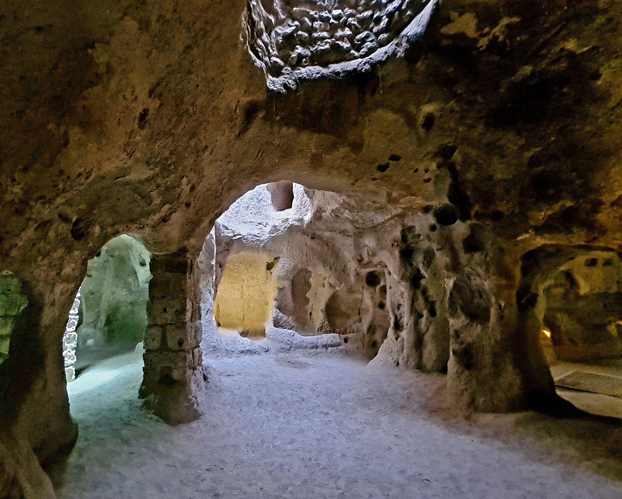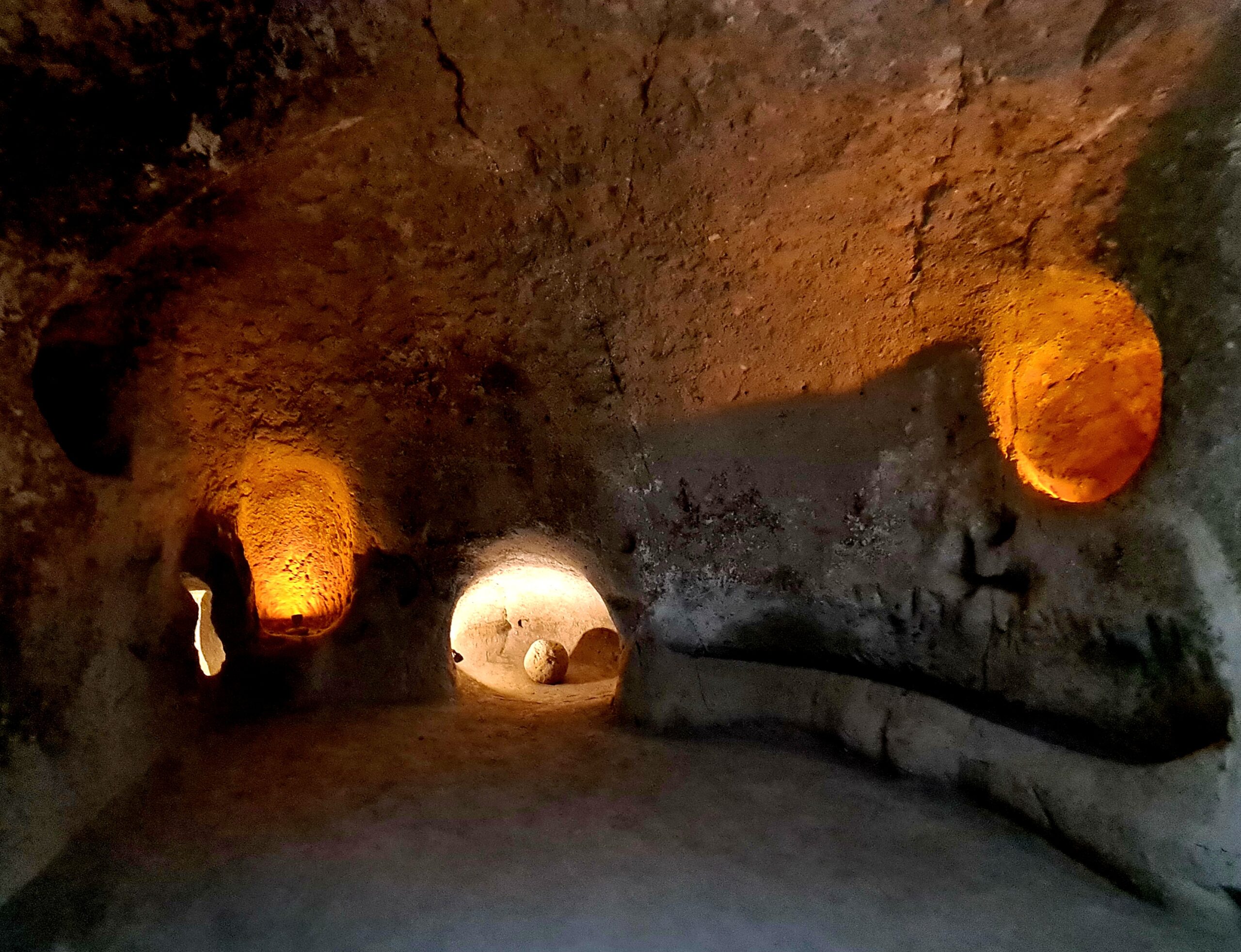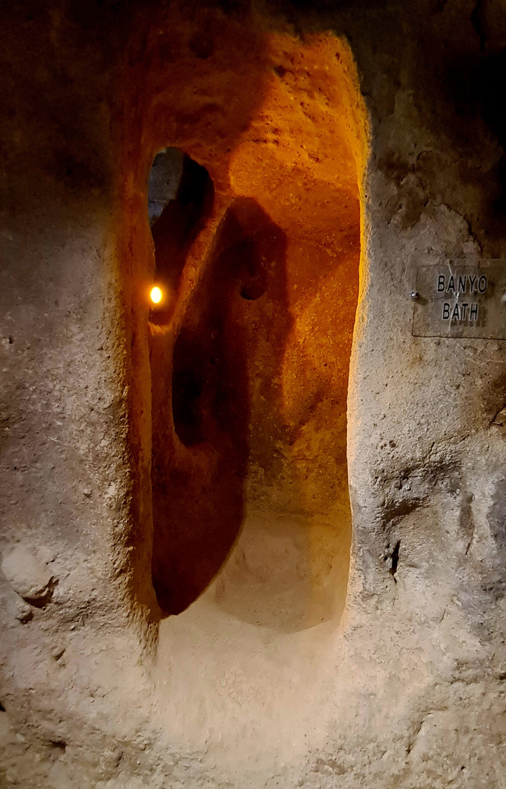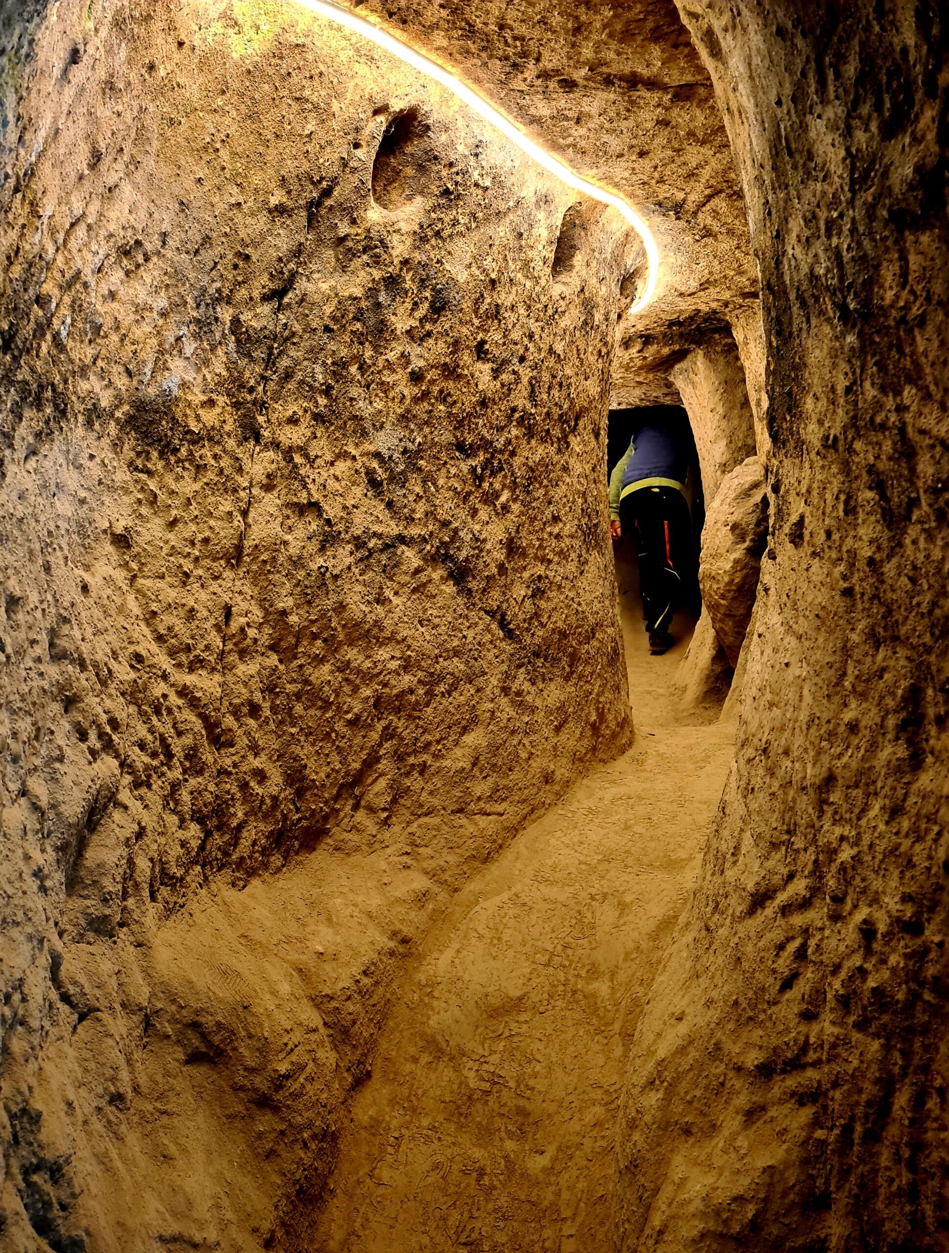 Dann fahren wir weiter zu einer unterirdischen Stadt. Es gibt hier in Kappadokien mindestens 50 unterirdische Städte. Manche haben unterirdisch 18 Stockwerke und können 20 000 Menschen aufnehmen. Es gab ein ausgeklügeltes Kommunikationssystem und Belüftungsschächte. Es ist kaum zu fassen, dass man schon 800 nach Christus solche Projekte umsetzen konnte.