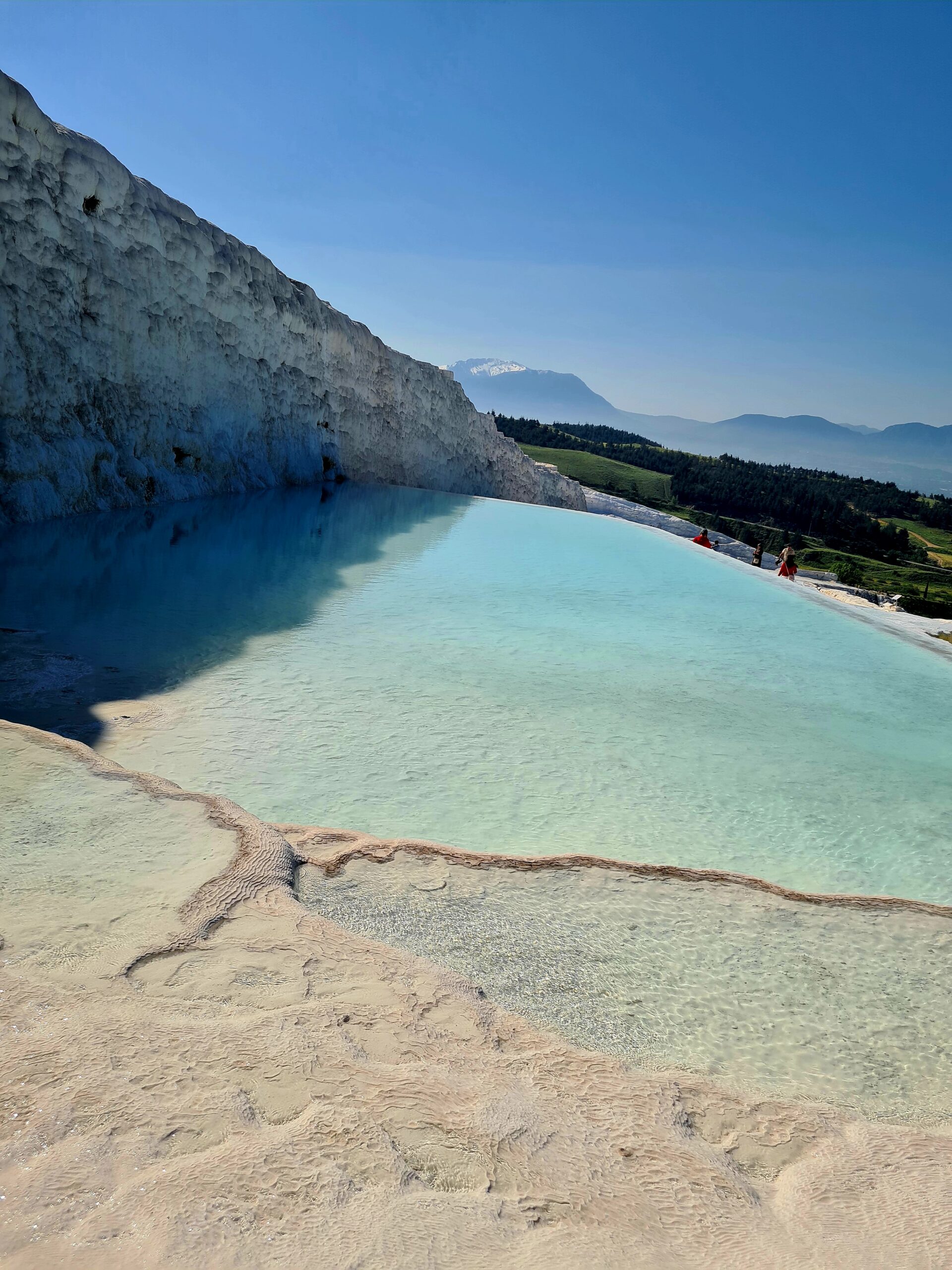 Man sieht die weißen Terrassen und dahinter
