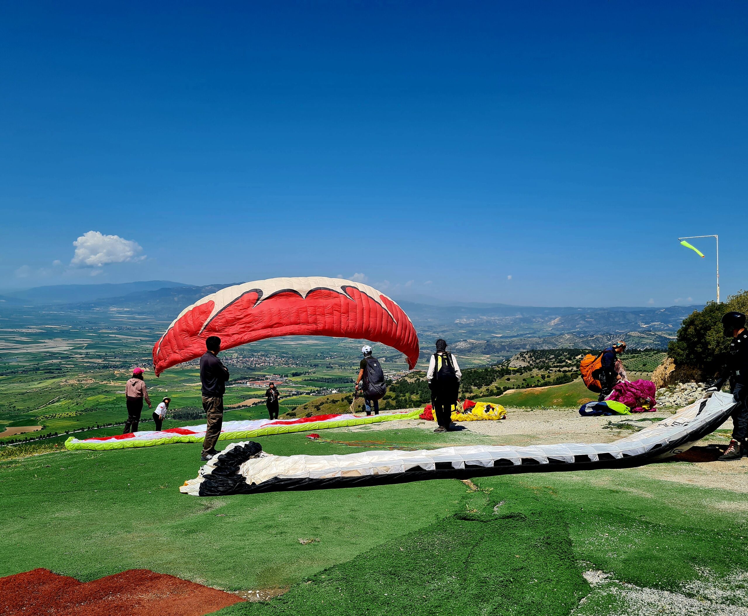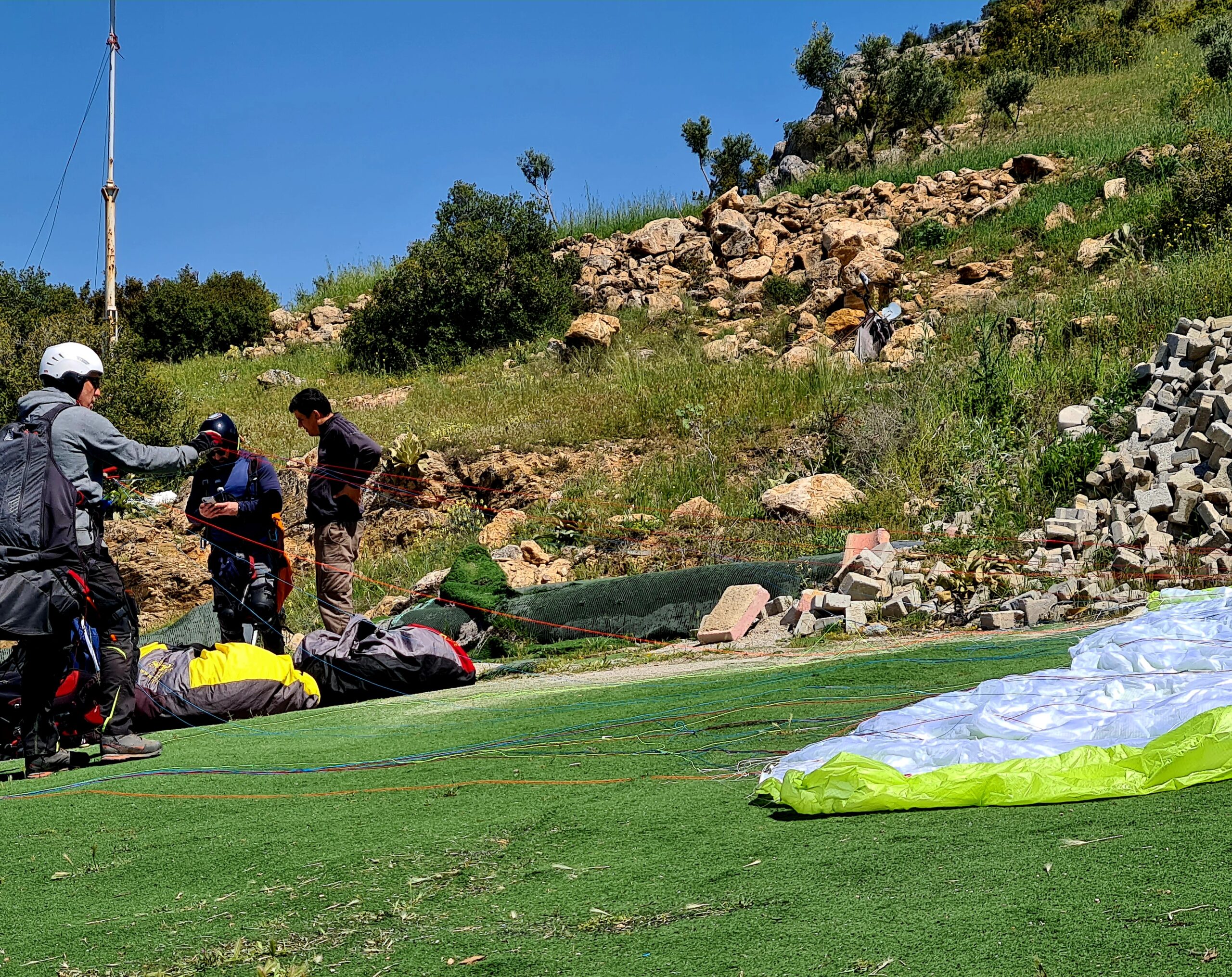 Und dann geht’s los: Schirm auslegen, Gurtzeug anlegen, Helm auf.