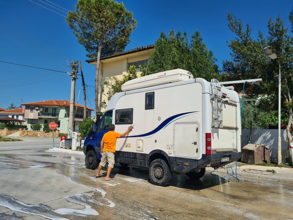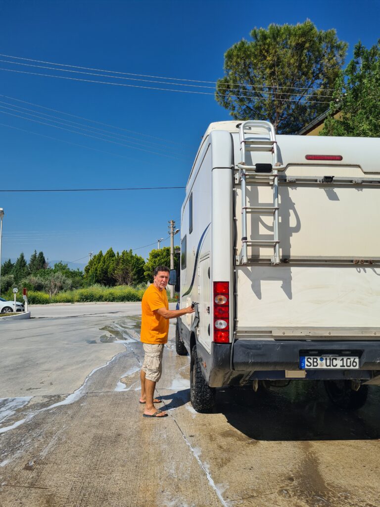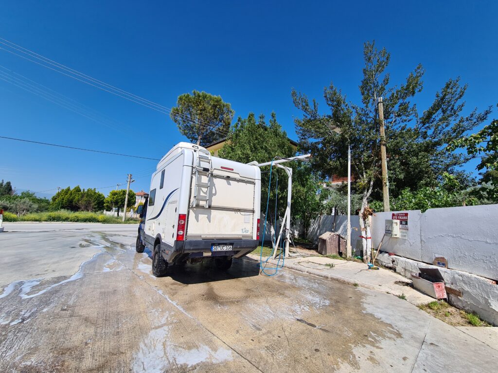 Hier legen wir uns jetzt aufs Ohr, eingezwängt zwischen türkischen Wohnmobilen, die Nähe lieben.