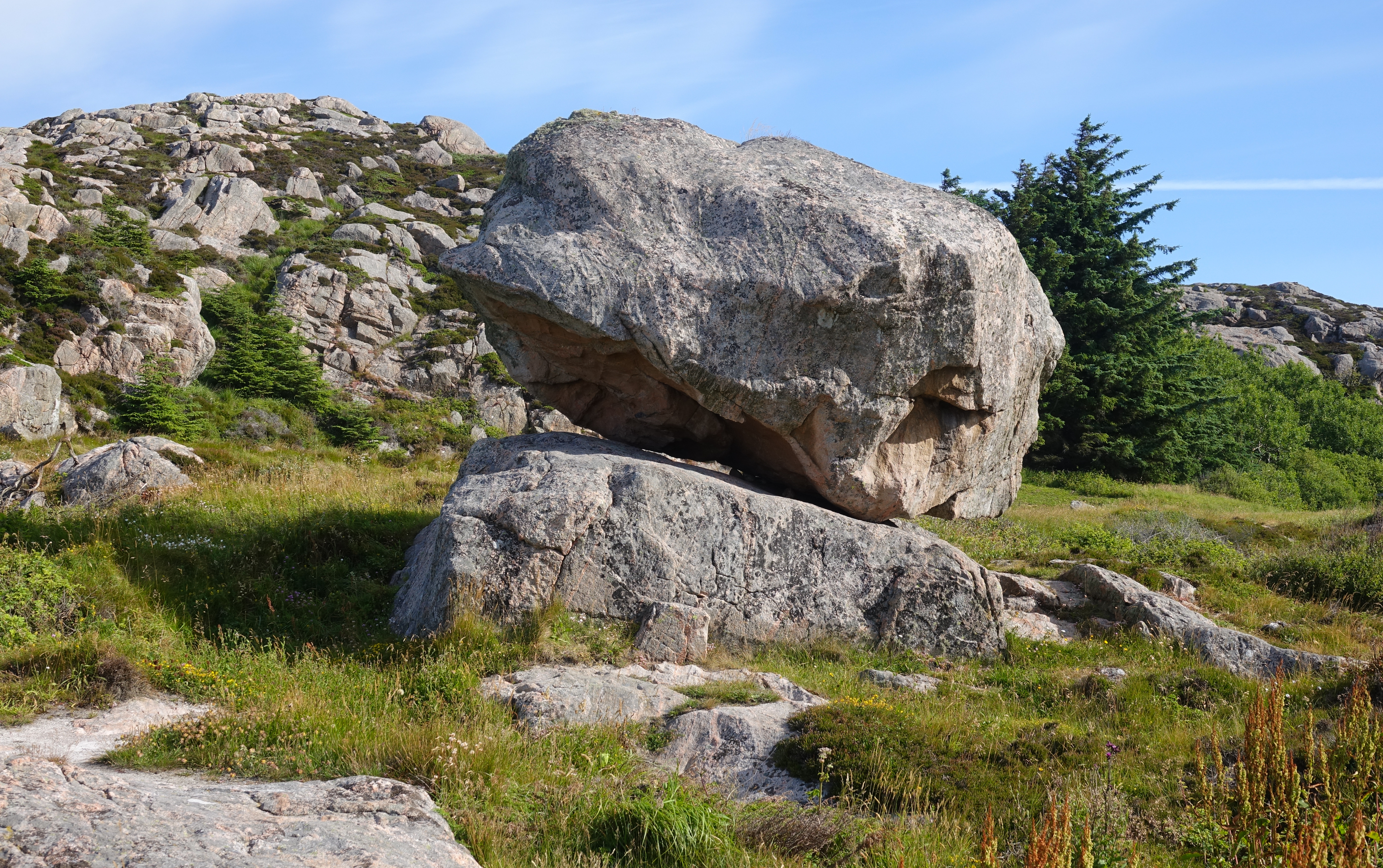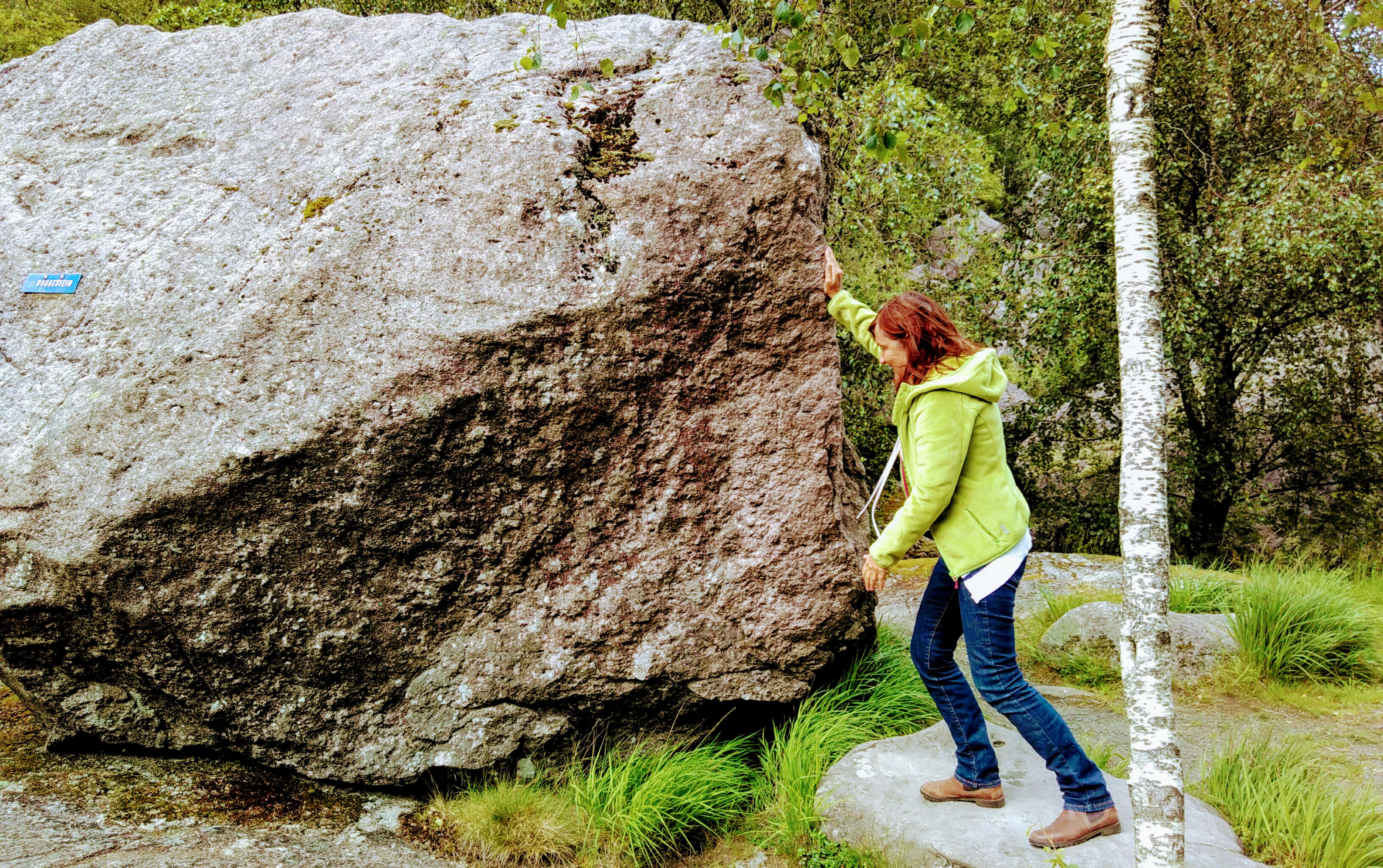 Als Zwischenstation wählen wir Linepollen mit einem Badeplatz und dem Riesenfelsblock Ruggestein. Dieser wird erst einmal von Carmen gerockt.