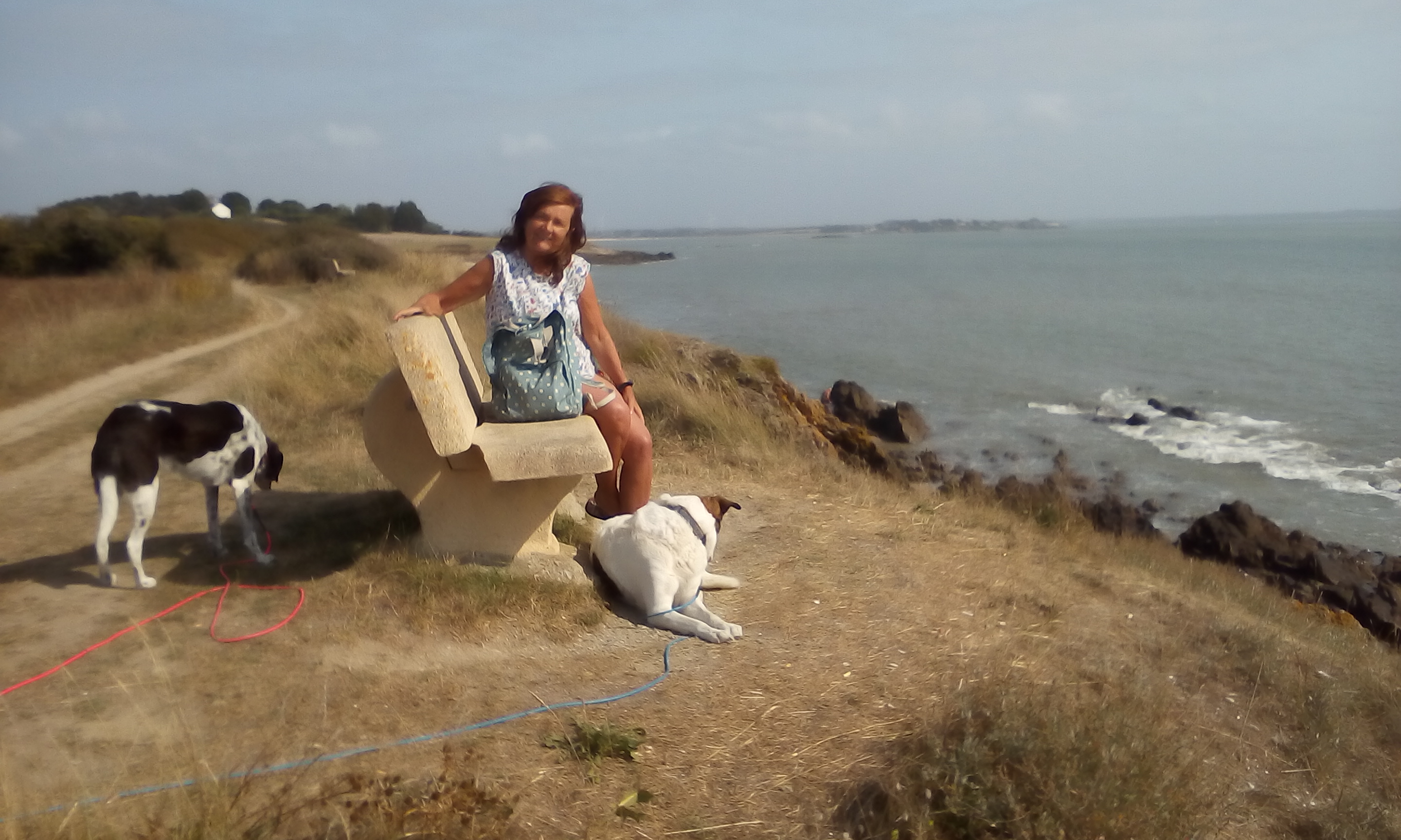 Wir wandern noch mit den Hunden auf dem GR 34. Immer wieder laden Bänke mit schöner Aussicht zum Entspannen ein. So macht selbst Carmen das Wandern Spaß.