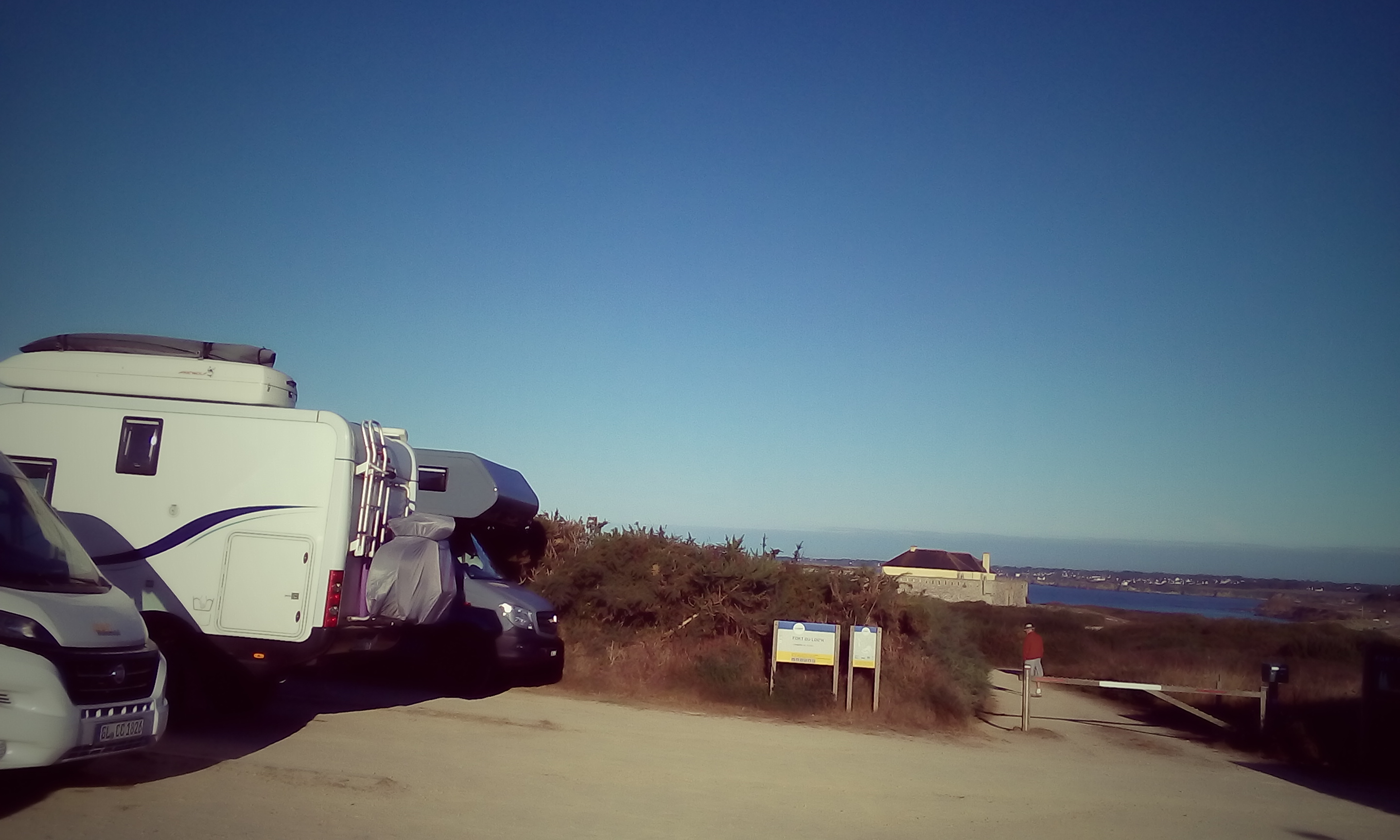 Heute morgen ist der Himmel wieder strahlend blau. Von unserem Stellplatz sieht man das Fort und das Meer.