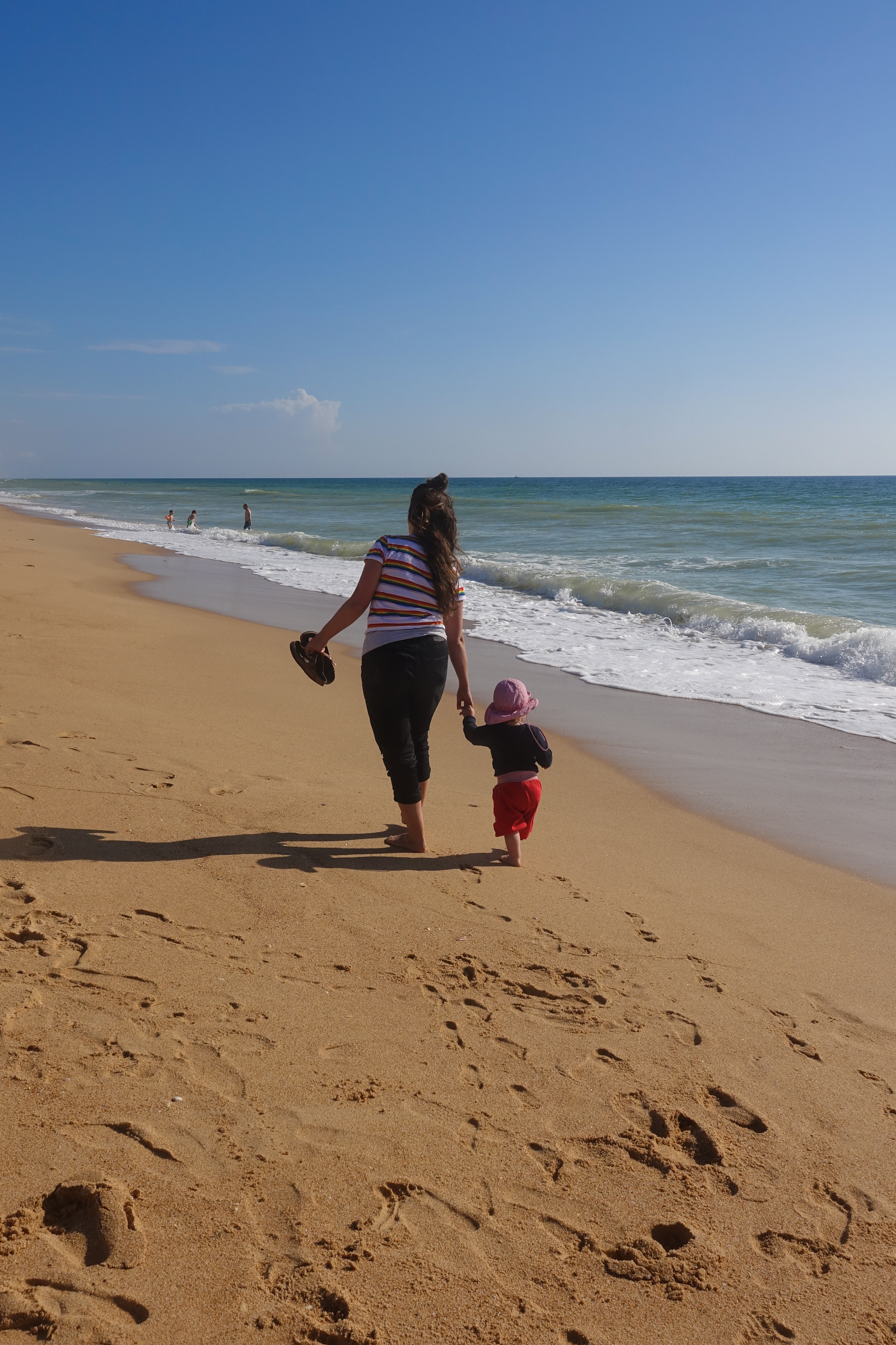 Das kleine Monster erkundet den Strand von Quarteira. Sicherheitshalber wird das kleine Monster von einem Herdenschutzhund begleitet.