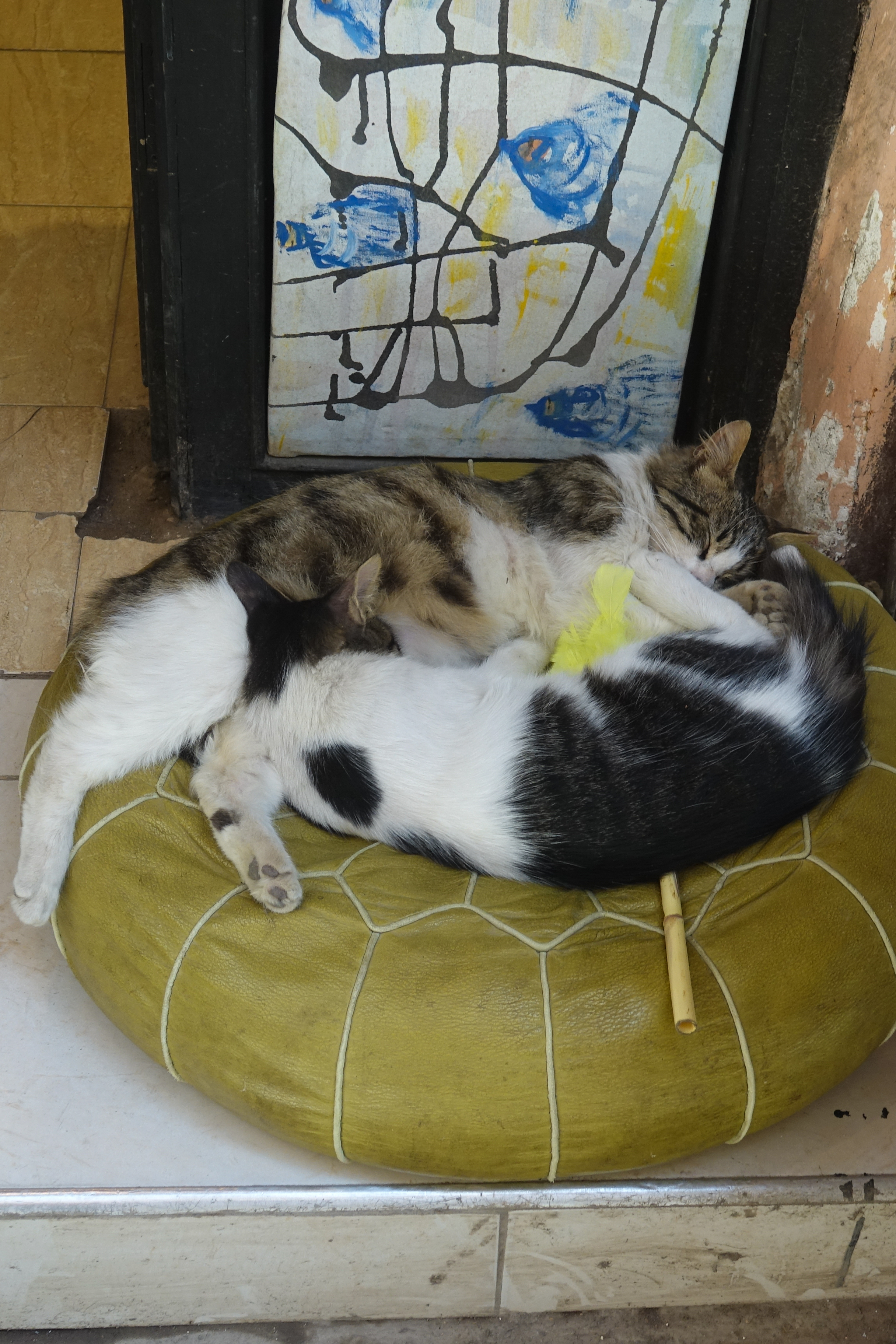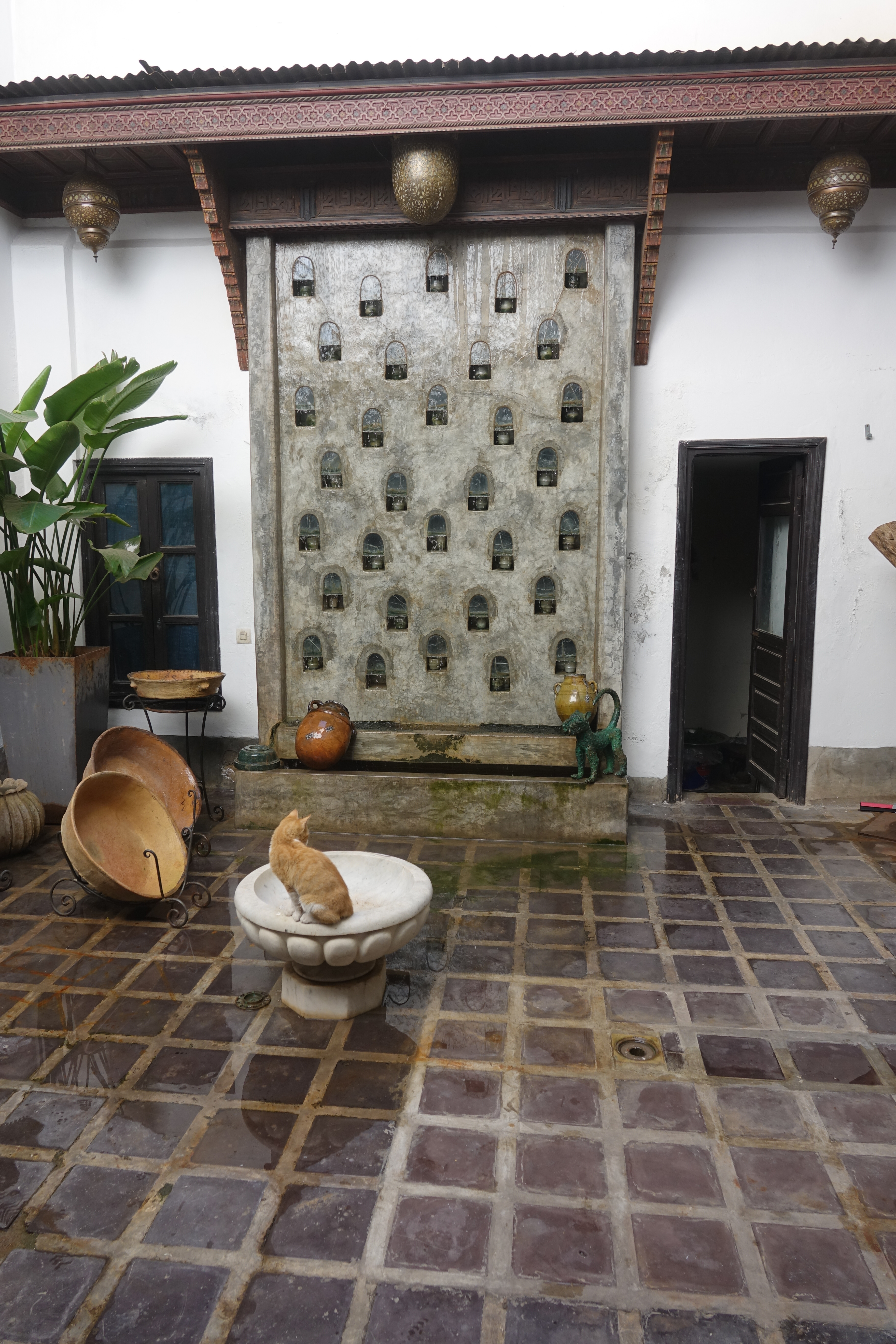 Katzen haben hier in Marokko Narrenfreiheit, sie dürfen in Geschäften auf Dekorationsgegenständen und Springbrunnen herumturnen, ohne dass sie vertrieben werden.