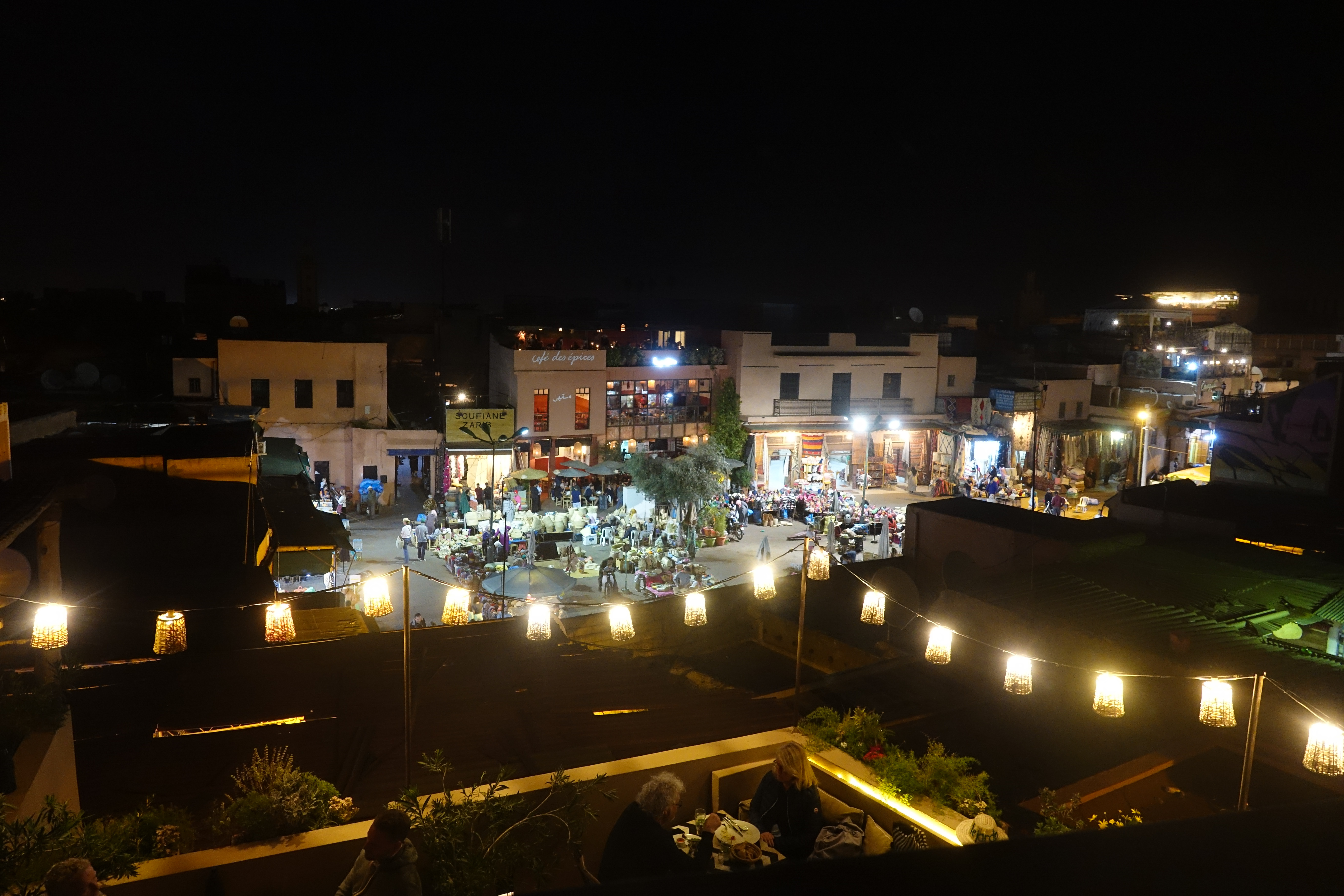 Bei Einbruch der Dunkelheit verändert sich das Straßenbild nocheinmal vollständig. Von der Dunkelheit, die wir in manchen marrokanischen Bergdörfen erlebt haben, ist hier in Marrakesch nichts mehr zu spüren.