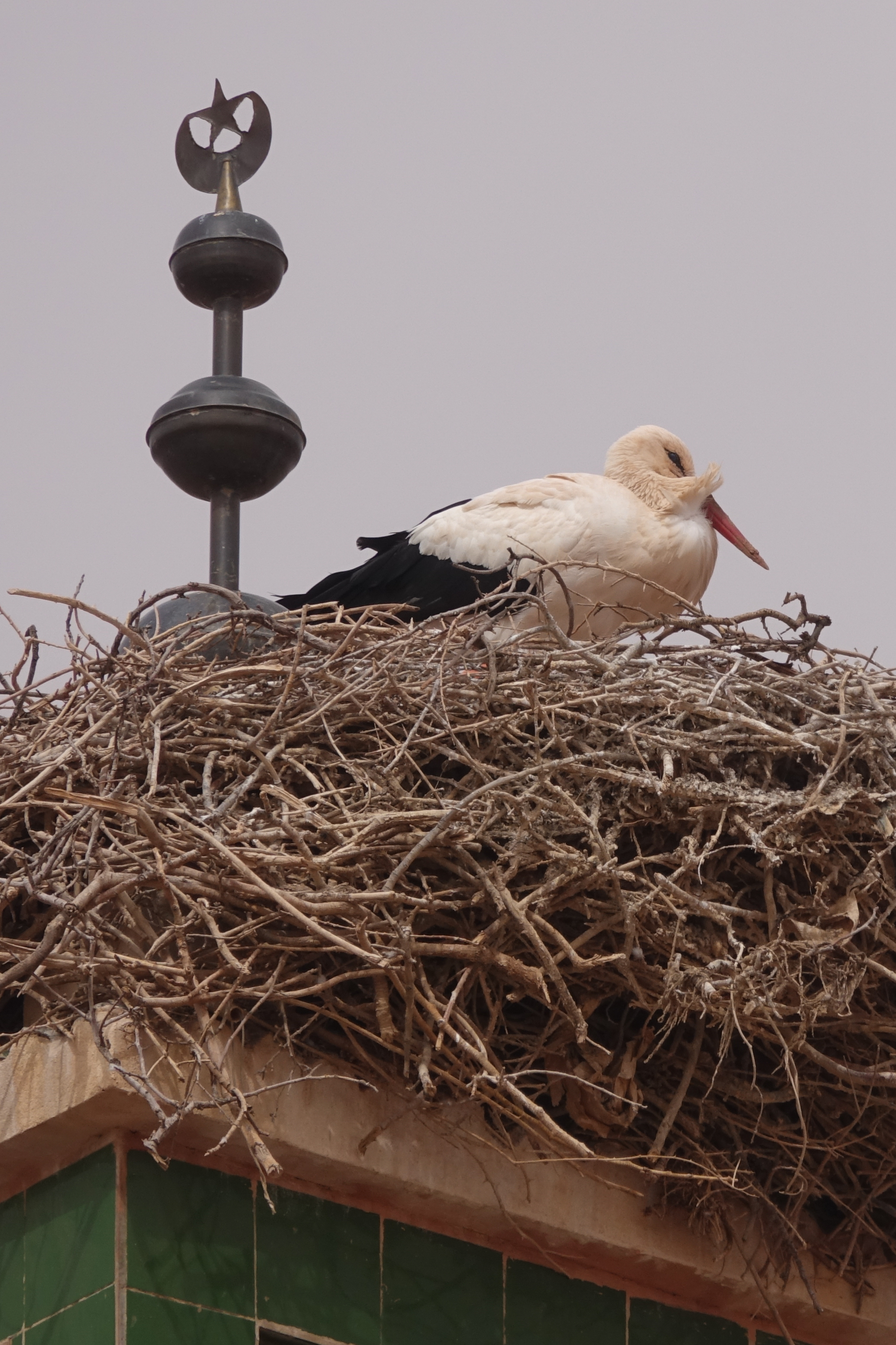 Auf dem Minarett der Moschee hat sich ein Storchenpaar eingenistet.