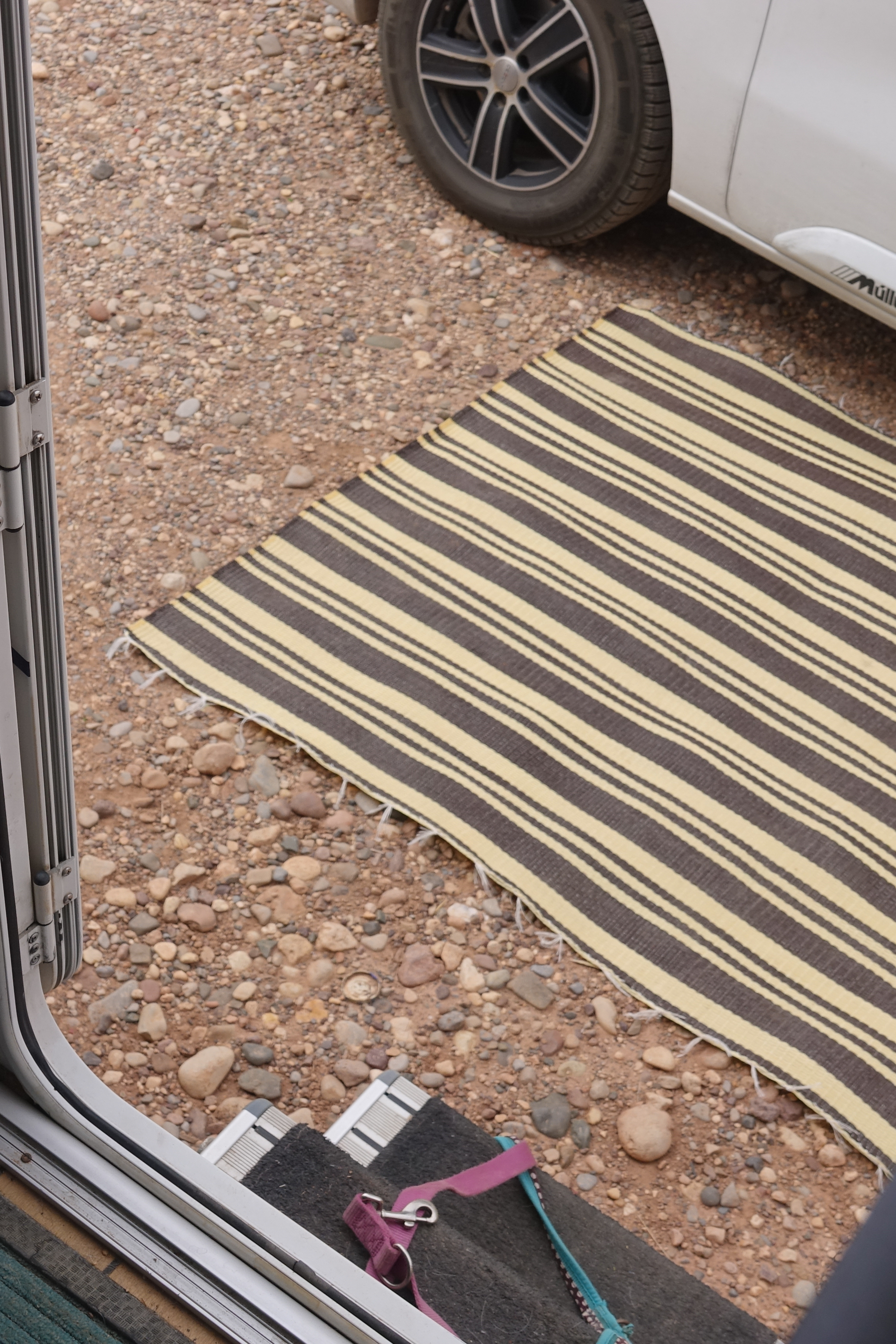 Um 14 Uhr verabschieden wir uns von unserem Camp, obwohl unser Wohnmobilnachbar uns einen Teppich vor Elsa gelegt hat, so dass wir jetzt keinen eigenen mehr brauchen. Unsere Hunde fanden es gut.