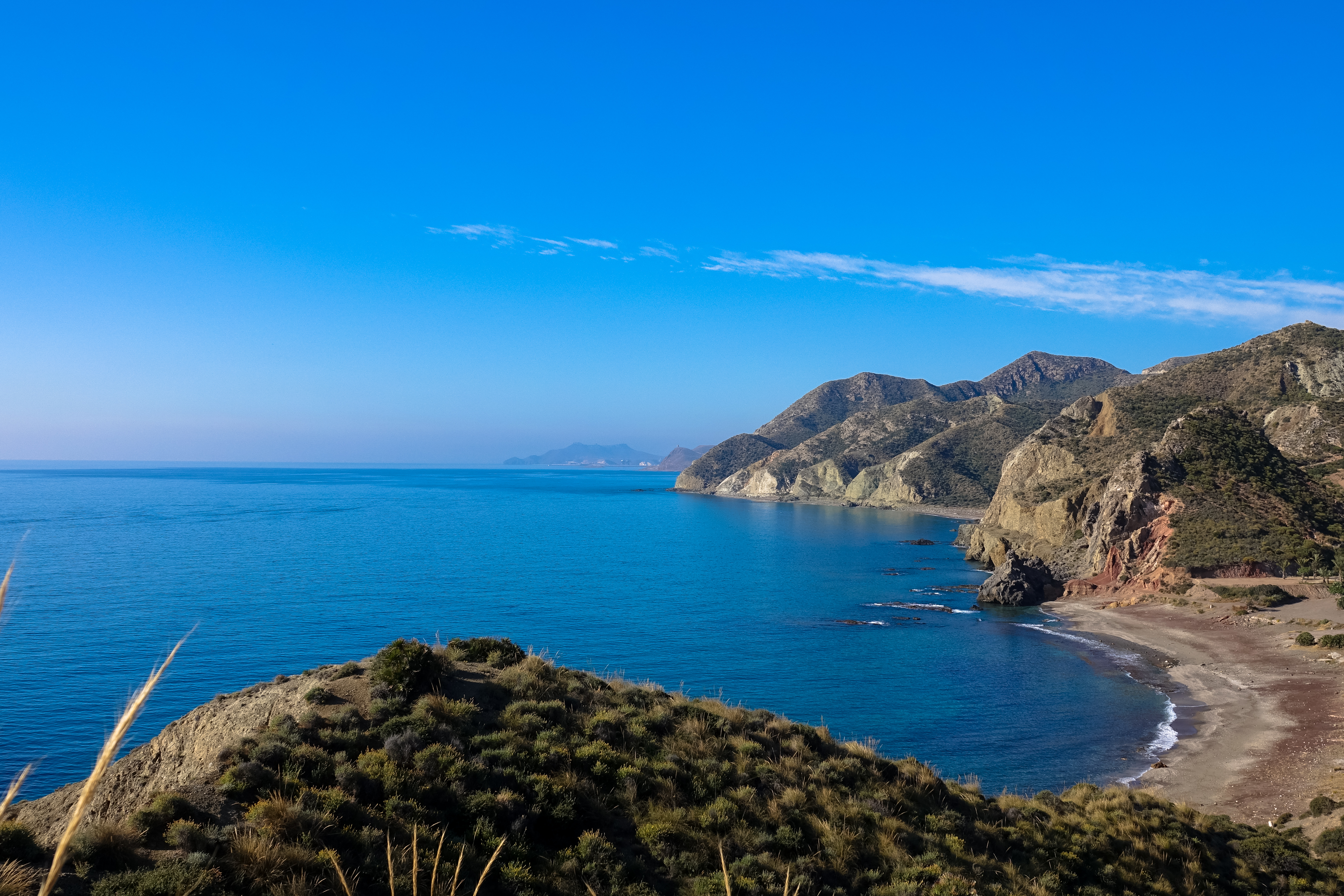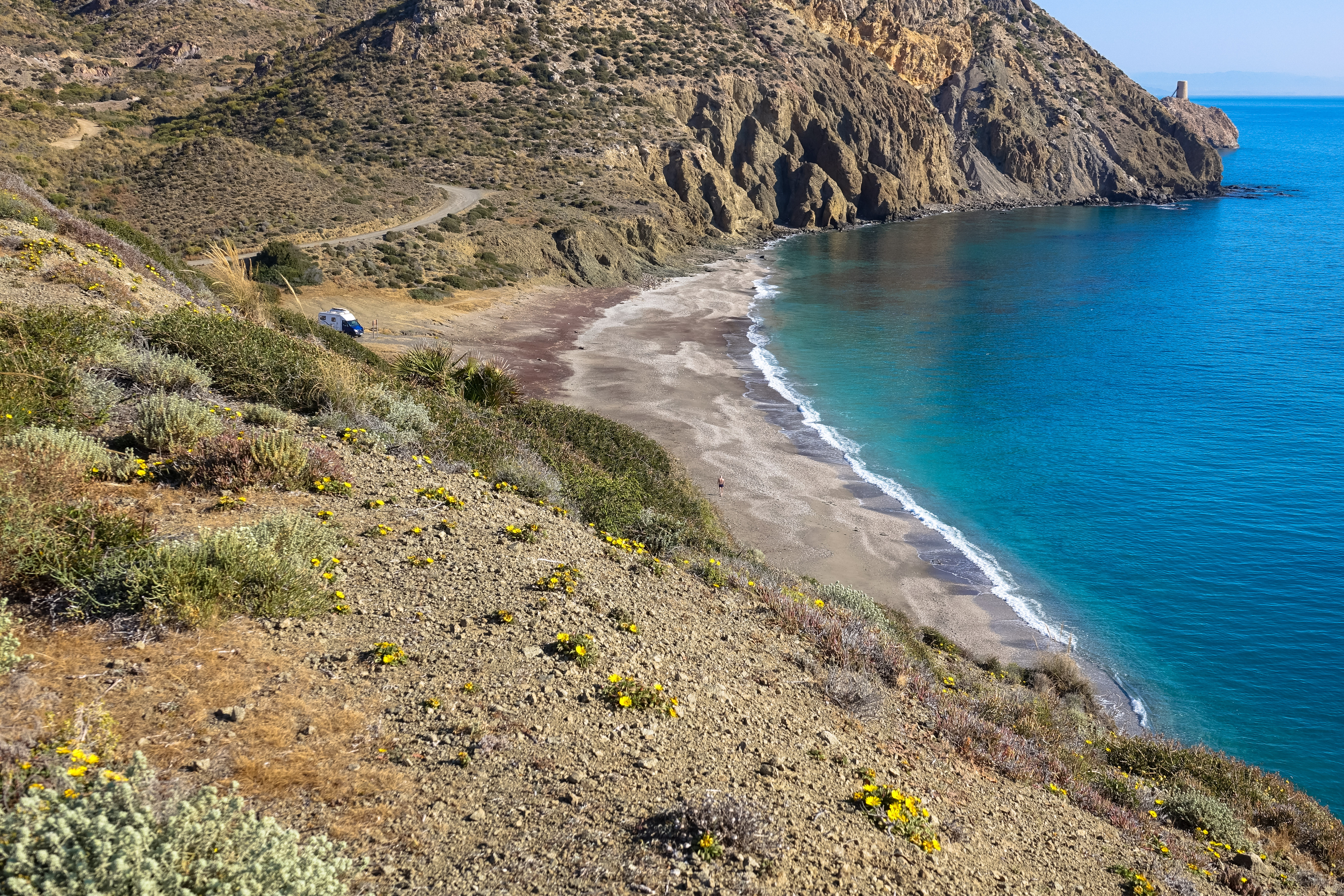 Bei San Juan de los Terreros endet Andalusien und die Provinz Murcia beginnt. Wir spazieren noch einmal mit den Hunden zum Playa las Higuericas, an dem man auch übernachten könnte. Hätten wir besser mal gemacht!
