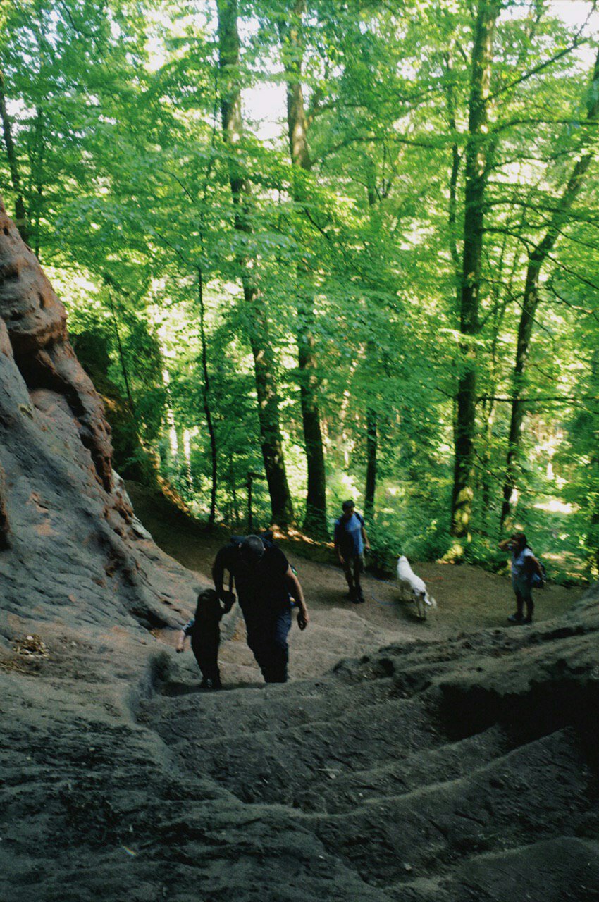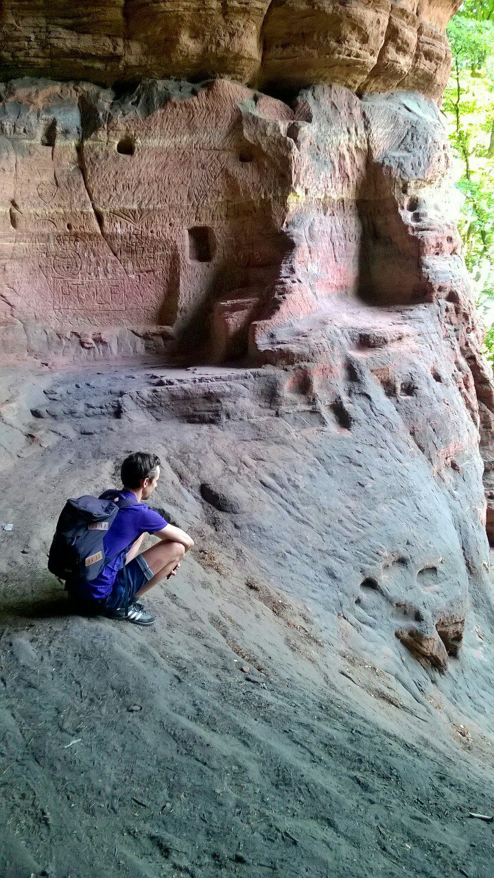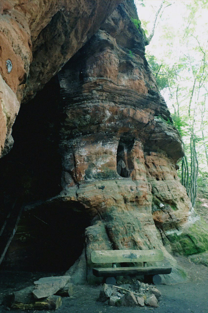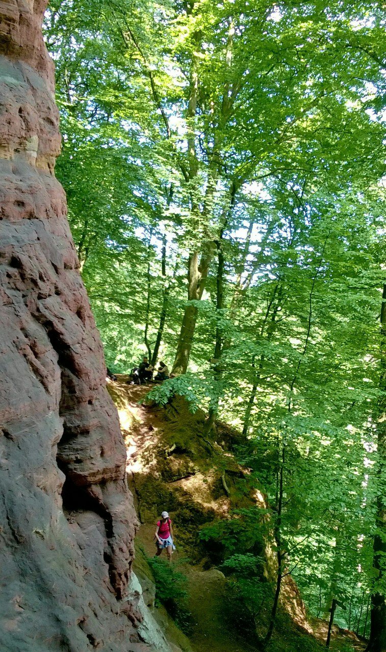 Anschließend wandern wir zu einer spätrömischen Langmauer, die teilweise restauriert ist, aber wirklich interessant ist sie nicht. Angeblich haben die Römer mit einer sehr langen Mauer ihre landwirtschaftlichen Nutzflächen begrenzt. Spannender ist da schon die Genovevahöhle, die durch Auswaschungen und Frostsprengung entstanden ist und dort picknicken wir erst einmal.