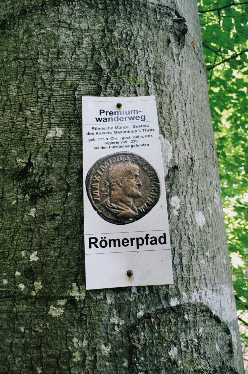 Diese römische Münze wurde genau hier im Steinbruch gefunden und ist jetzt das Leitsymbol des Wanderwegs.