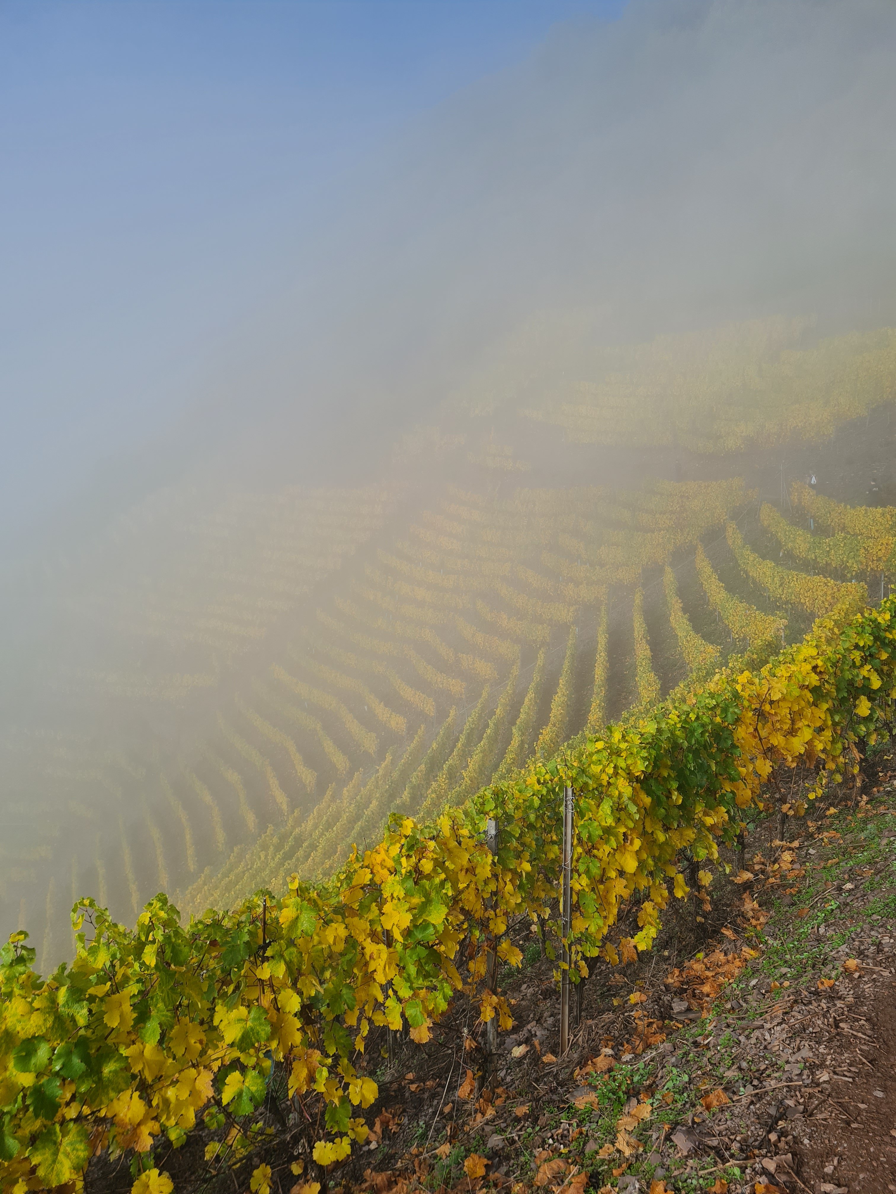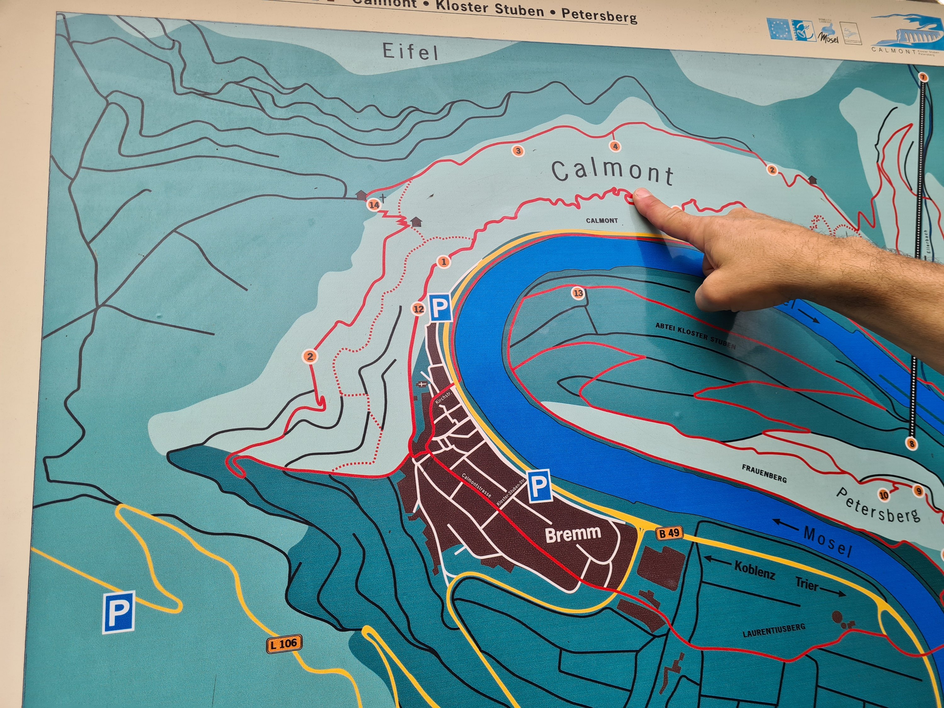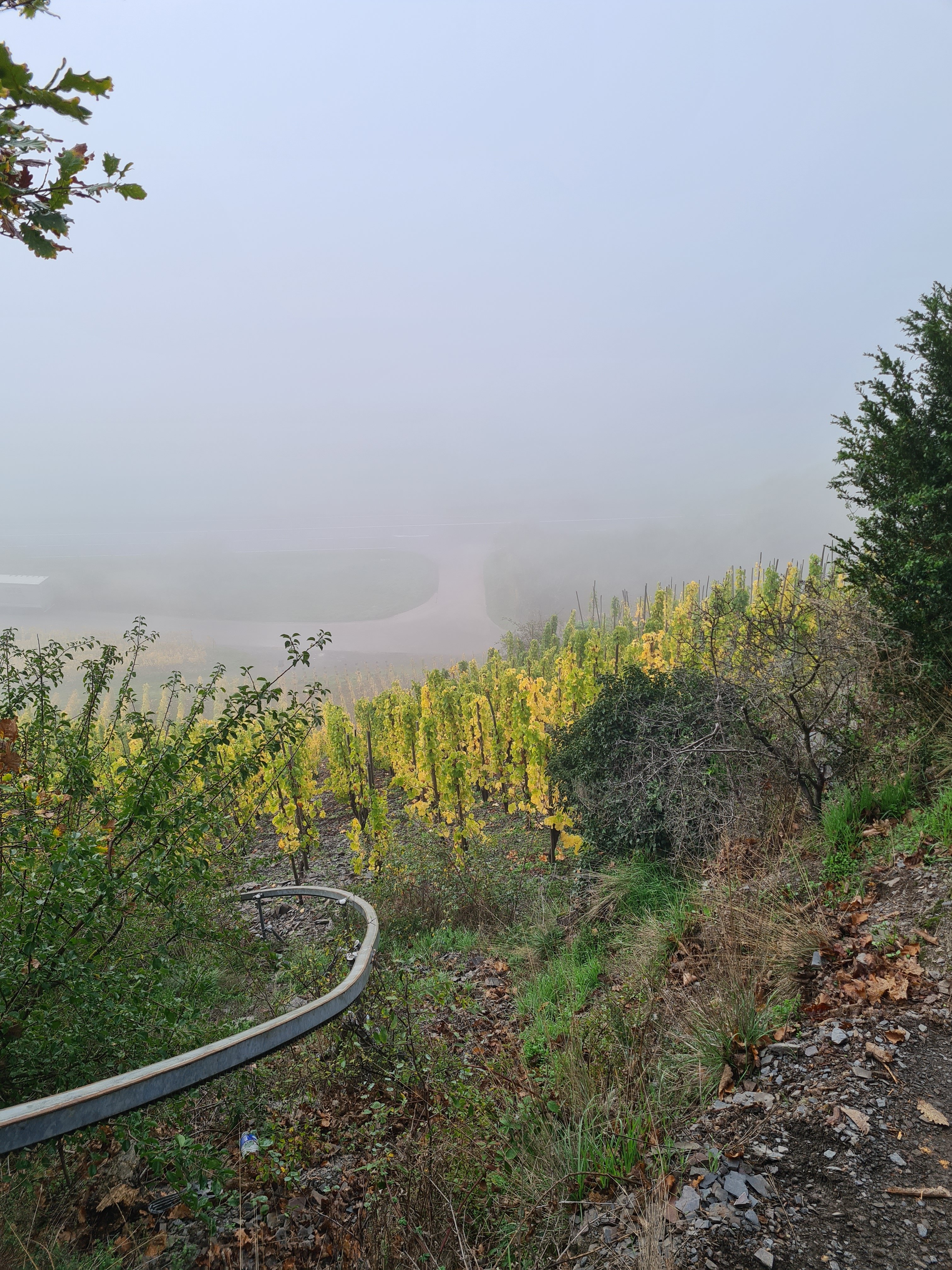 Der Calmontsteig steht schon lange auf unserer Liste, wegen der fantastischen Ausblicke, die man von dort aus hat. Leider sieht man heute zumindest hier im Tal der Mosel nichts. Es ist total neblig. Trotzdem wandern wir erst einmal los. Falls man dann wirklich nichts mehr sieht, können wir ja immer noch umkehren.