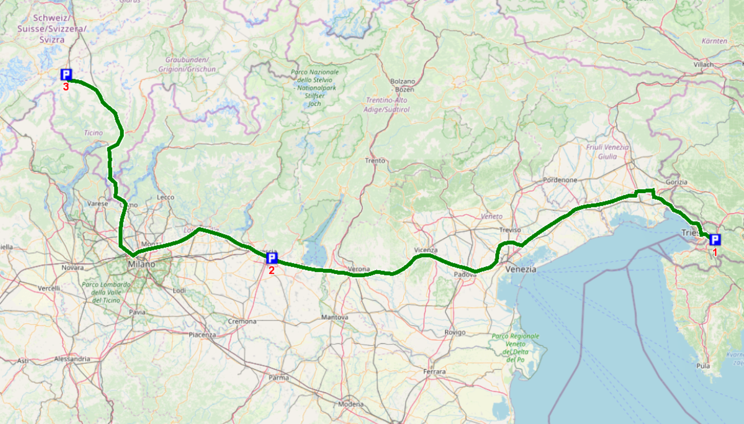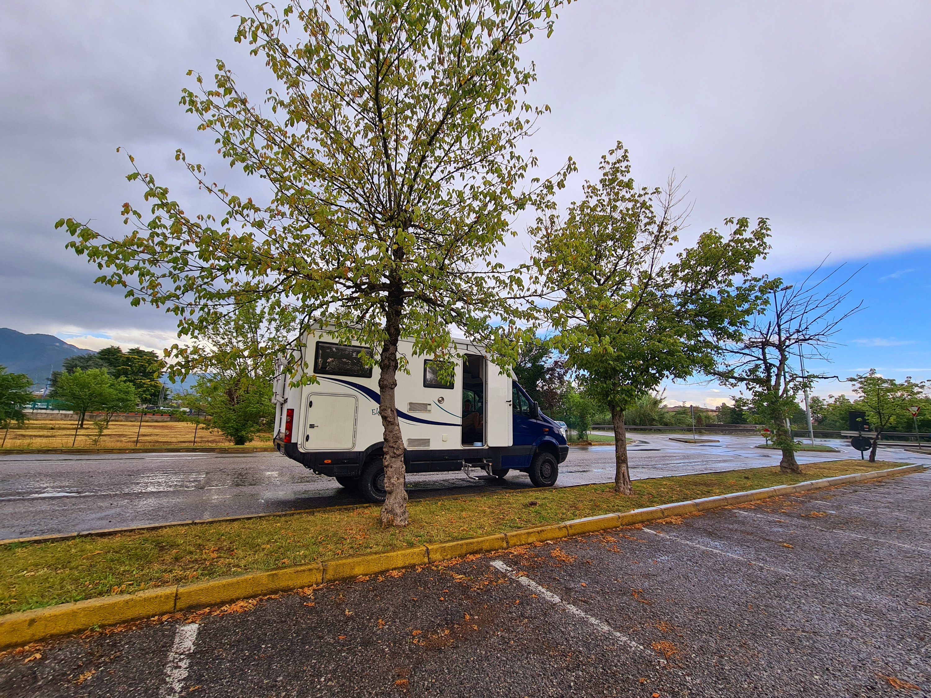 Der Stellplatz in Slowenien ist ein idealer Durchreise-Platz mit Ver- und Entsorgung, Bäckerei und Pizza to go. Es war auch ruhig über Nacht und daher starten wir gut gestärkt zu einer langen Reiseetappe von 600 km. Wir wollen wieder richtig kuscheln und deshalb auf dem Pass übernachten. Das Reisewetter ist total angenehm mit 19 Grad. Durch einen Stau haben wir um 15 Uhr erst die Hälfte geschafft und machen eine Mittagspause bei Brescia.