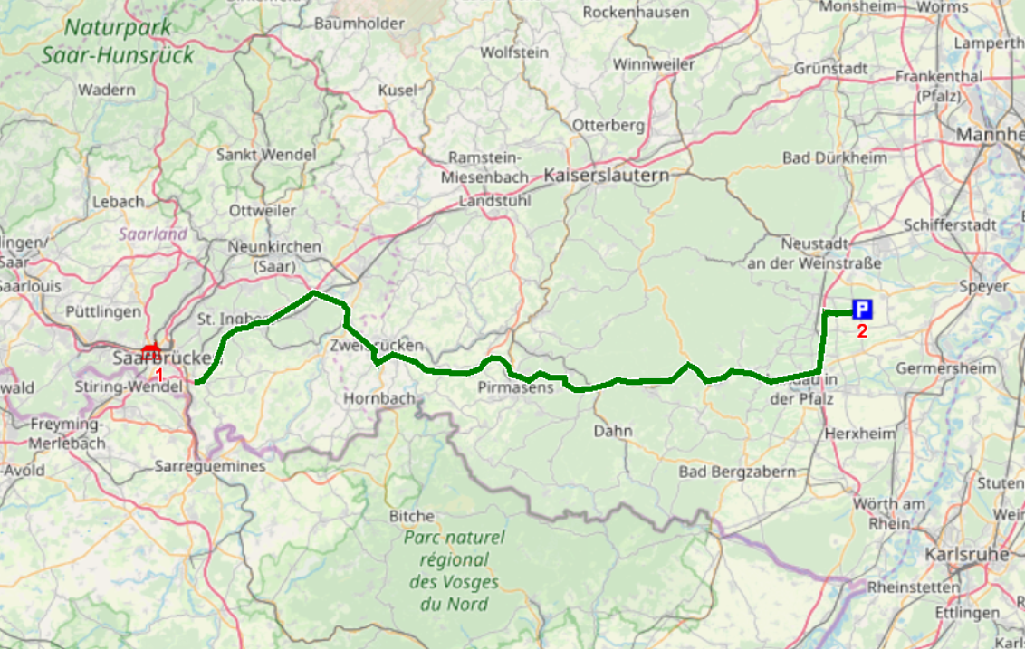Letzes Jahr gab es an Ostern noch ein Beherbungsverbot, das auch für Wohnmobil-Stellplätze galt. Dieses Jahr sind die Inzidenzen zwar wesentlich höher, aber reisen ist wieder erlaubt. Deshalb wollen wir zum Rhein bei Speyer. Wir haben unser Paddelboot auf dem Dach und wollen heute erst einmal zu einem Winzer östlich von Landau. Morgen sind dann Speyer und das Paddelrevier nur noch einen Steinwurf entfernt.