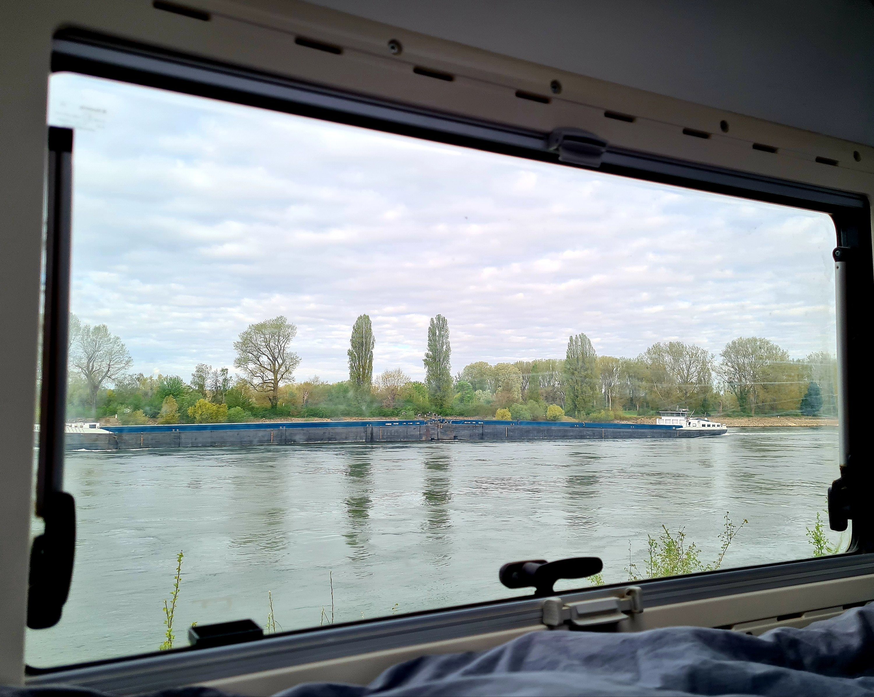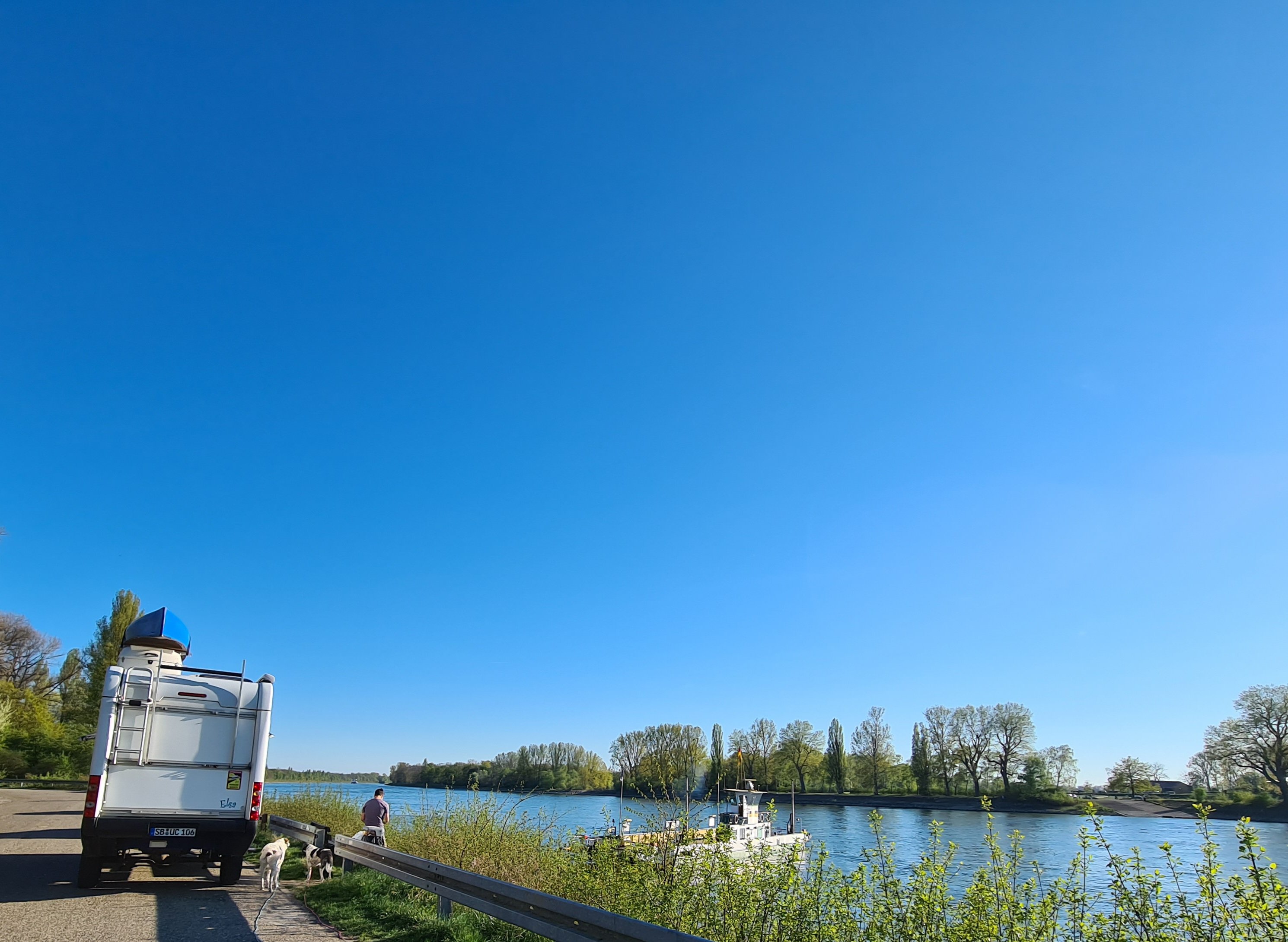 Wir haben an der Kollerfähre sehr ruhig übernachtet und wachen mit wunderbarer Sicht auf den Rhein auf. Dieser Stellplatz ist ein wenig umstritten: Manche finden es toll, andere stören die Schiffsgeräusche und in lauen Sommernächten treffen sich hier auch Jugendliche zum Feiern.