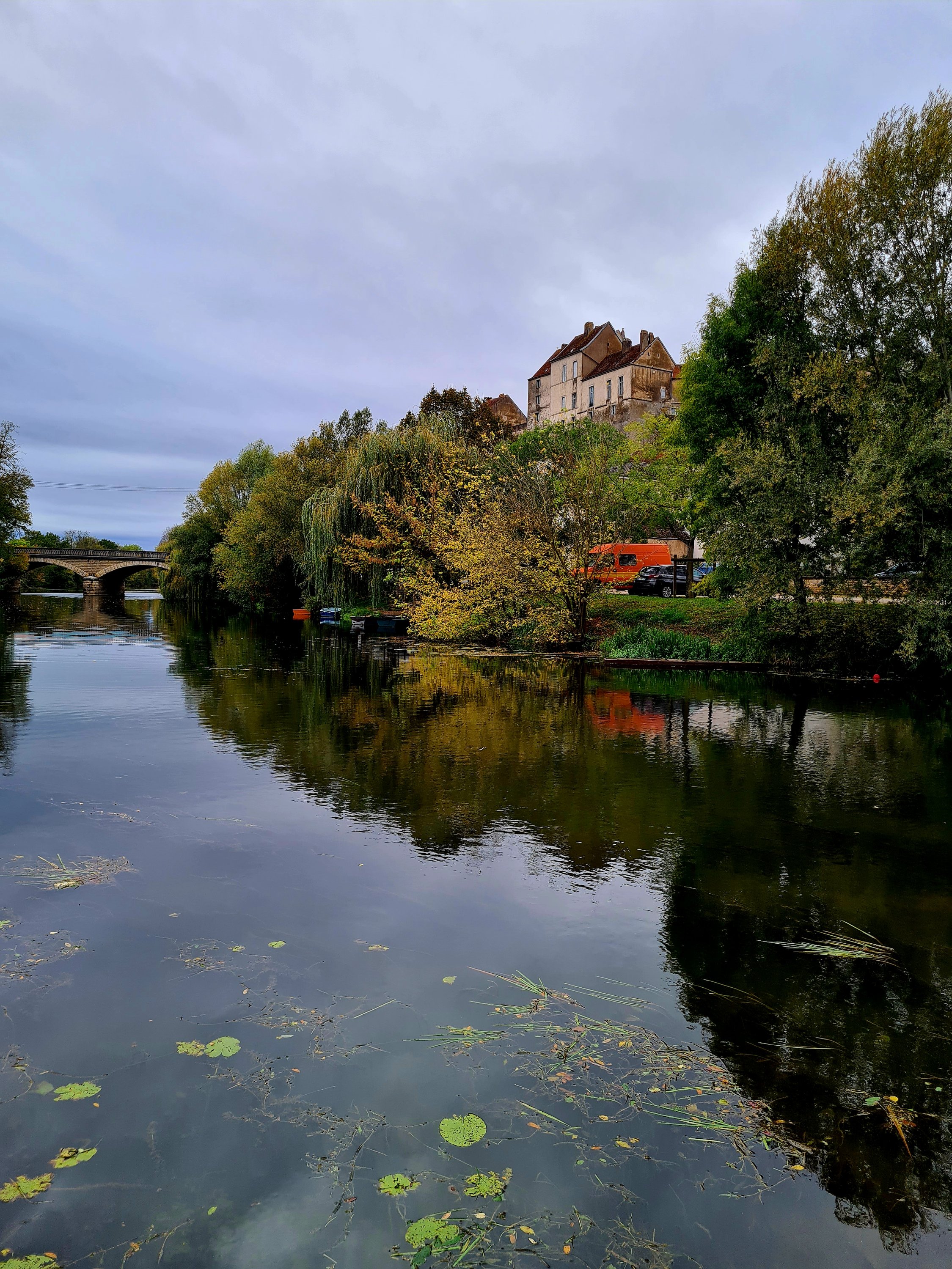 In der Mittagspause haben wir zwar eine erstklassige Aussicht auf die Saône, aber der versprochene Sonnenschein fehlt.