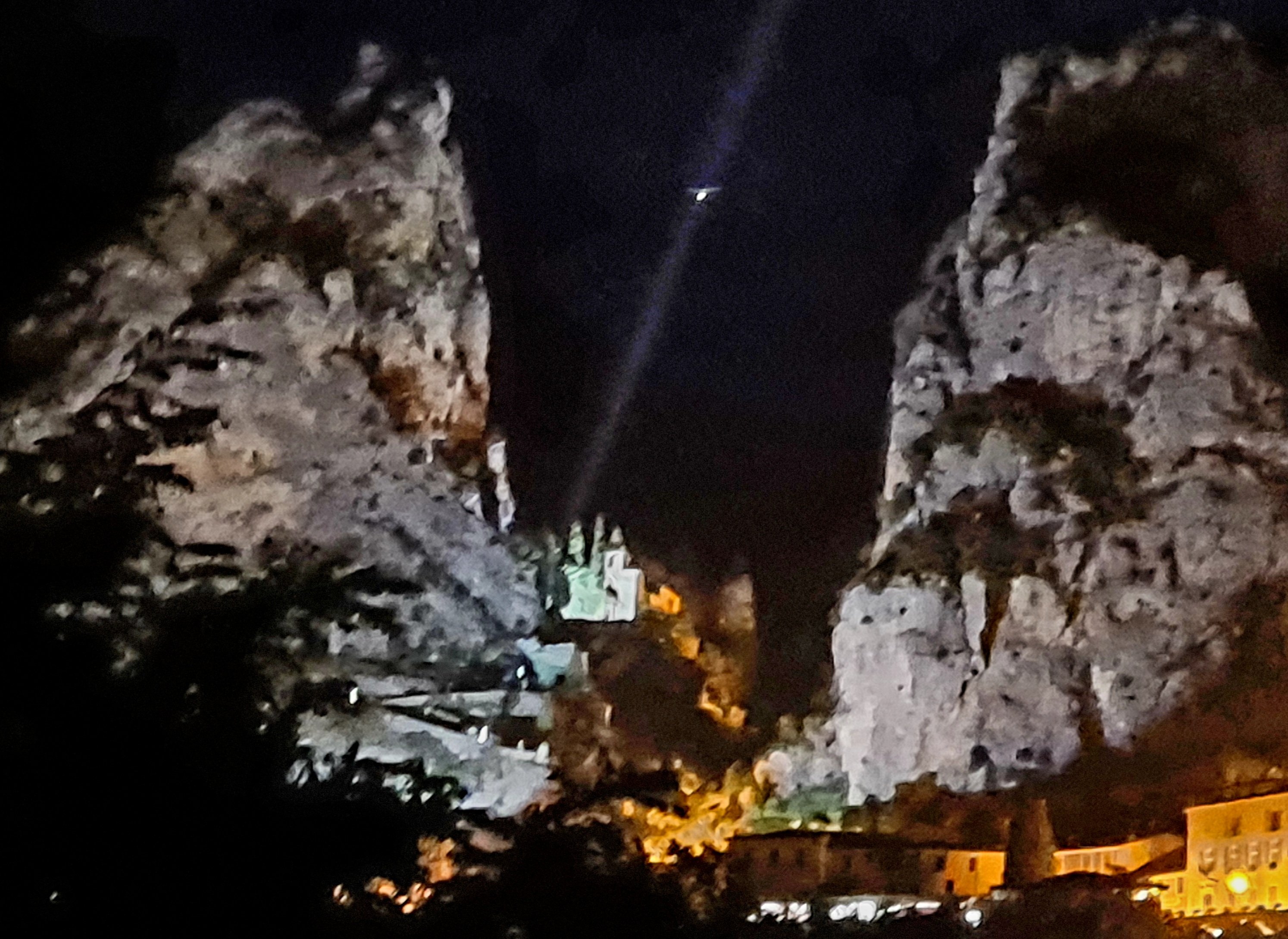 Abends ist der Ort mit den Felsen grandios angestrahlt