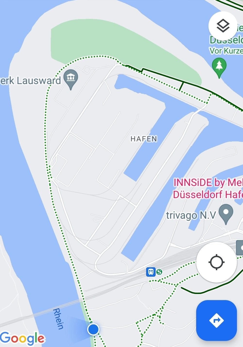Vom blauen Punkt bis zum Baum und wieder zurück, entlang der grünen Linie.