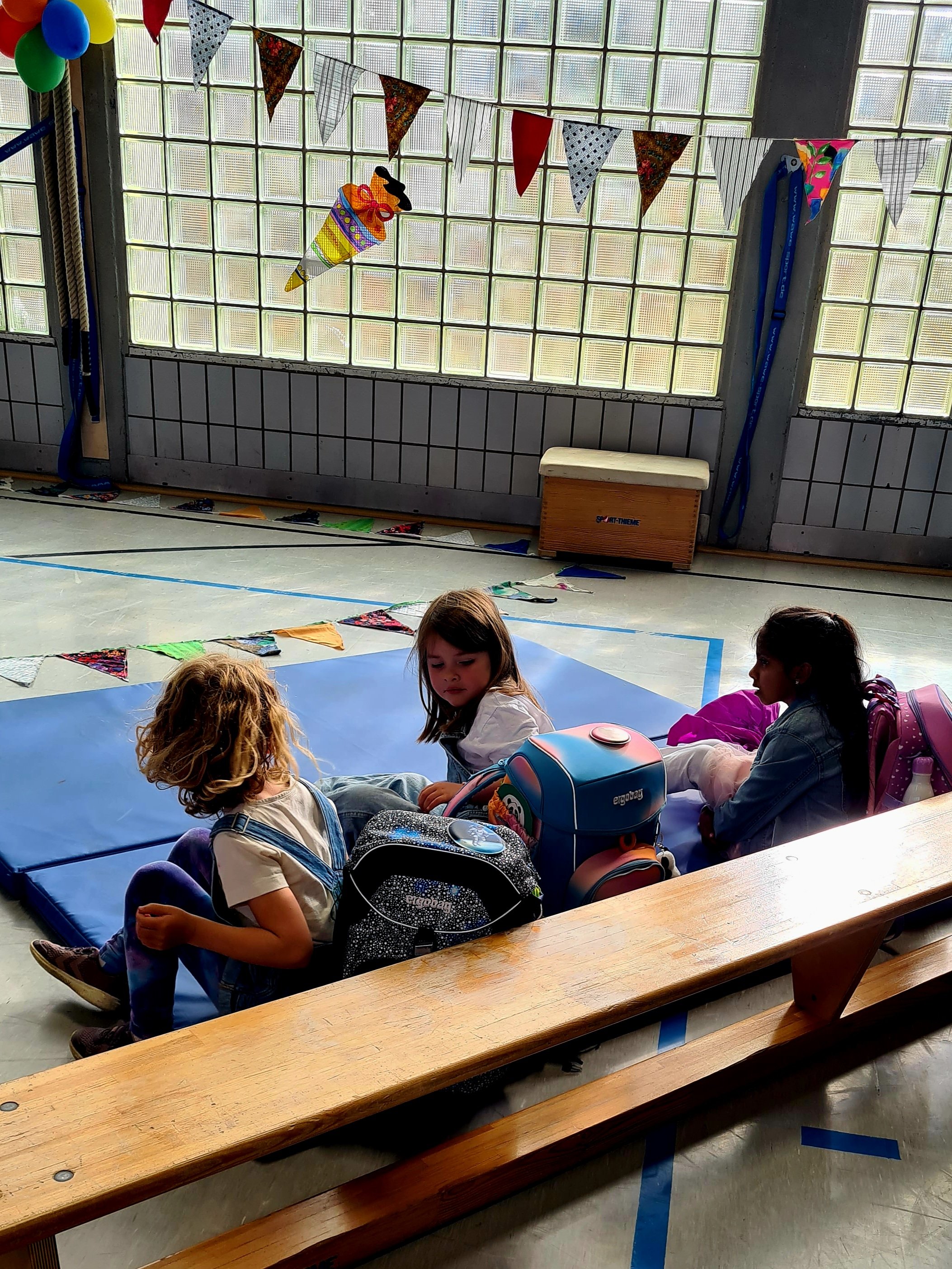 Alle warten in der Turnhalle geduldig, bis sie aufgerufen werden. Mali und Nora sind in der Pandaklasse.
