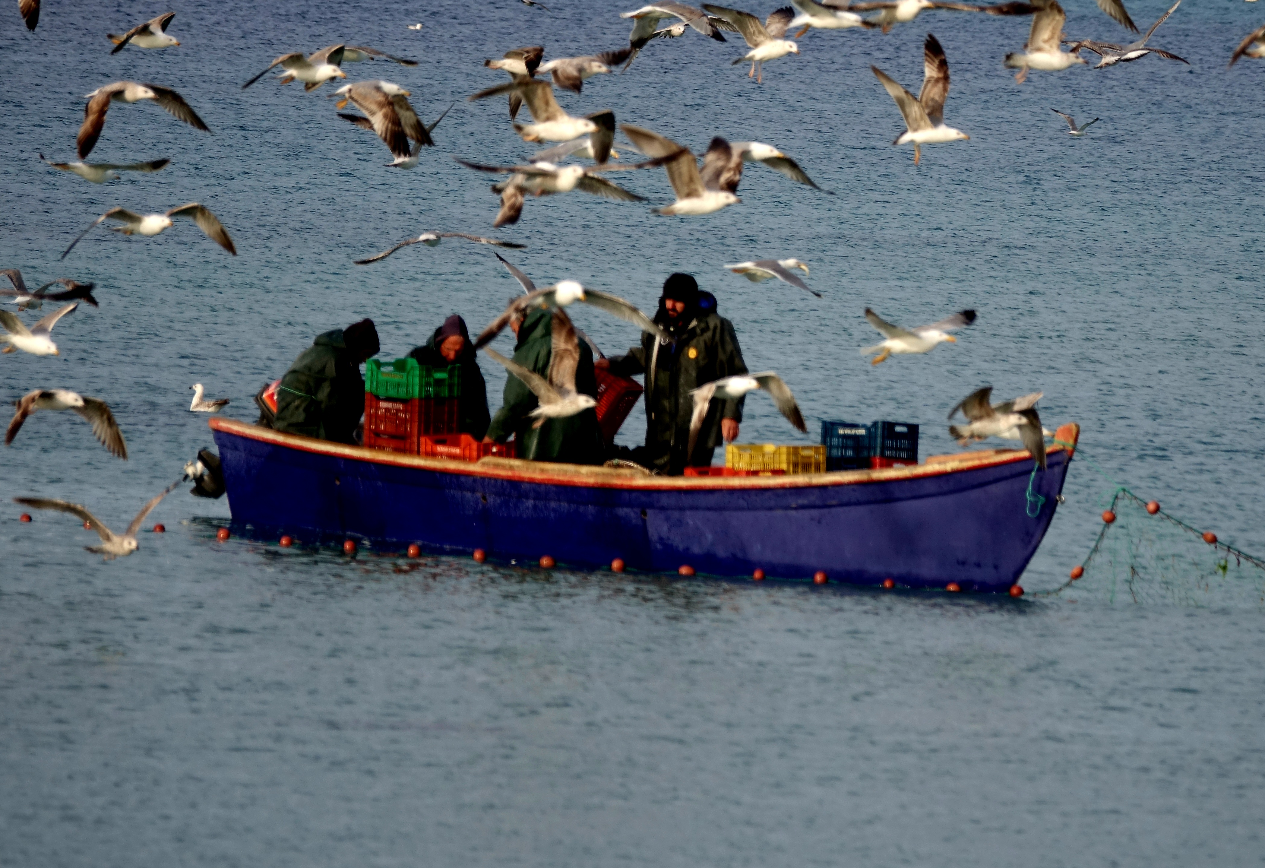 Der Grund für diese ganze Aufregung in der Vogelpopulation waren die Fischer, die ihre Netze geleert haben. Da kann es natürlich immer sein, dass etwas für hungrige Schnäbel abfällt.
