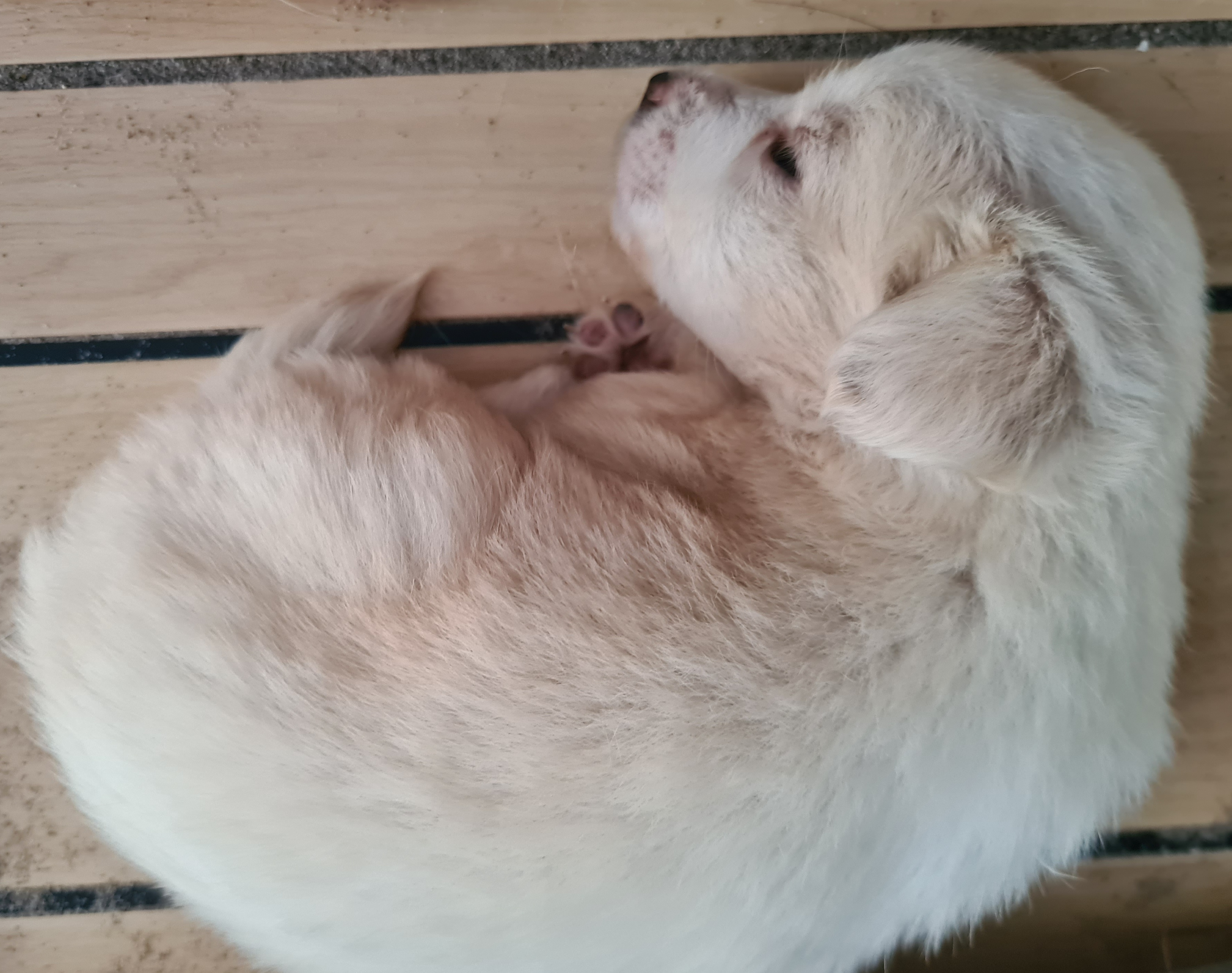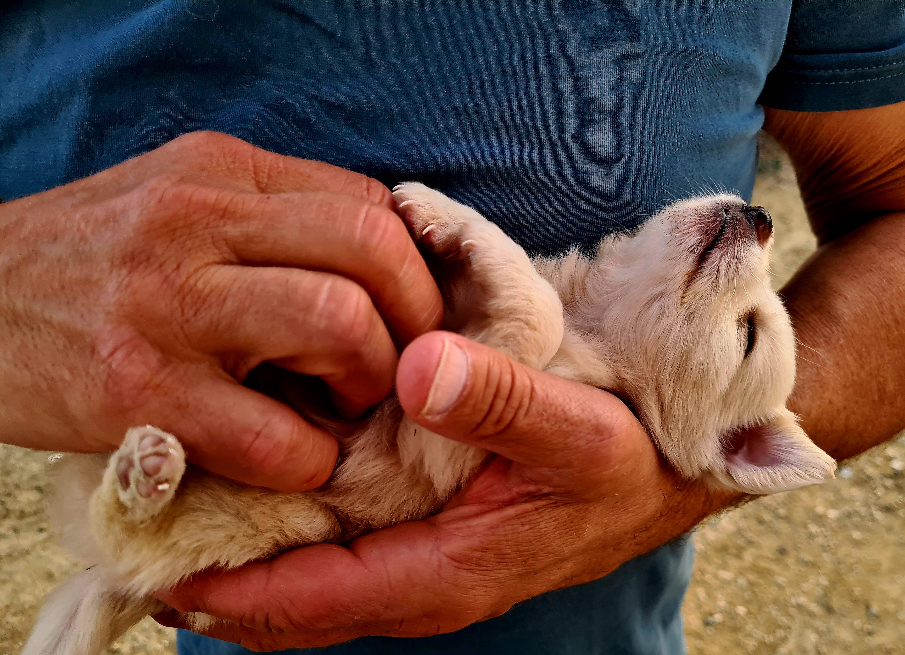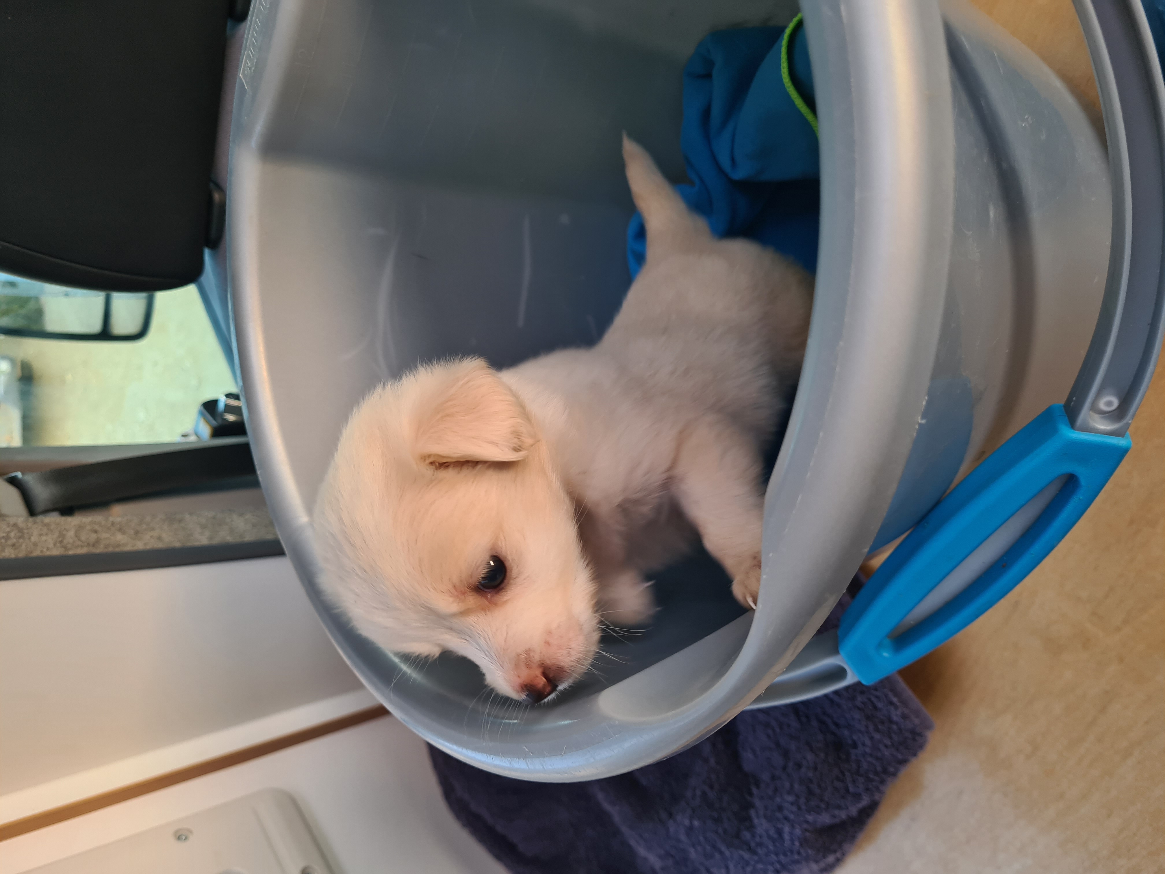 Um 16 Uhr verabschieden wir uns von Julia, Martin und Rudi und kaum haben wir Asphalt unter den Rädern, umfährt Uwe etwas Weißes auf der Landstraße und sieht im Spiegel, dass es sich bewegt. Wir halten an und werden von verzweifeltem Fiepen empfangen. Ein winziger, weißer Hundewelpe! Hätten wir ihn in der Dämmerung auf der Straße gelassen, wäre er sicher überfahren worden. Also packen wir das kleine Häufchen Elend kurzerhand ein. Eine Lösung können wir später noch finden. Wir holen uns Rat bei Tiere in Not und anderen Tierfreunden und hoffen auf eine ruhige Nacht mit einem Baby.