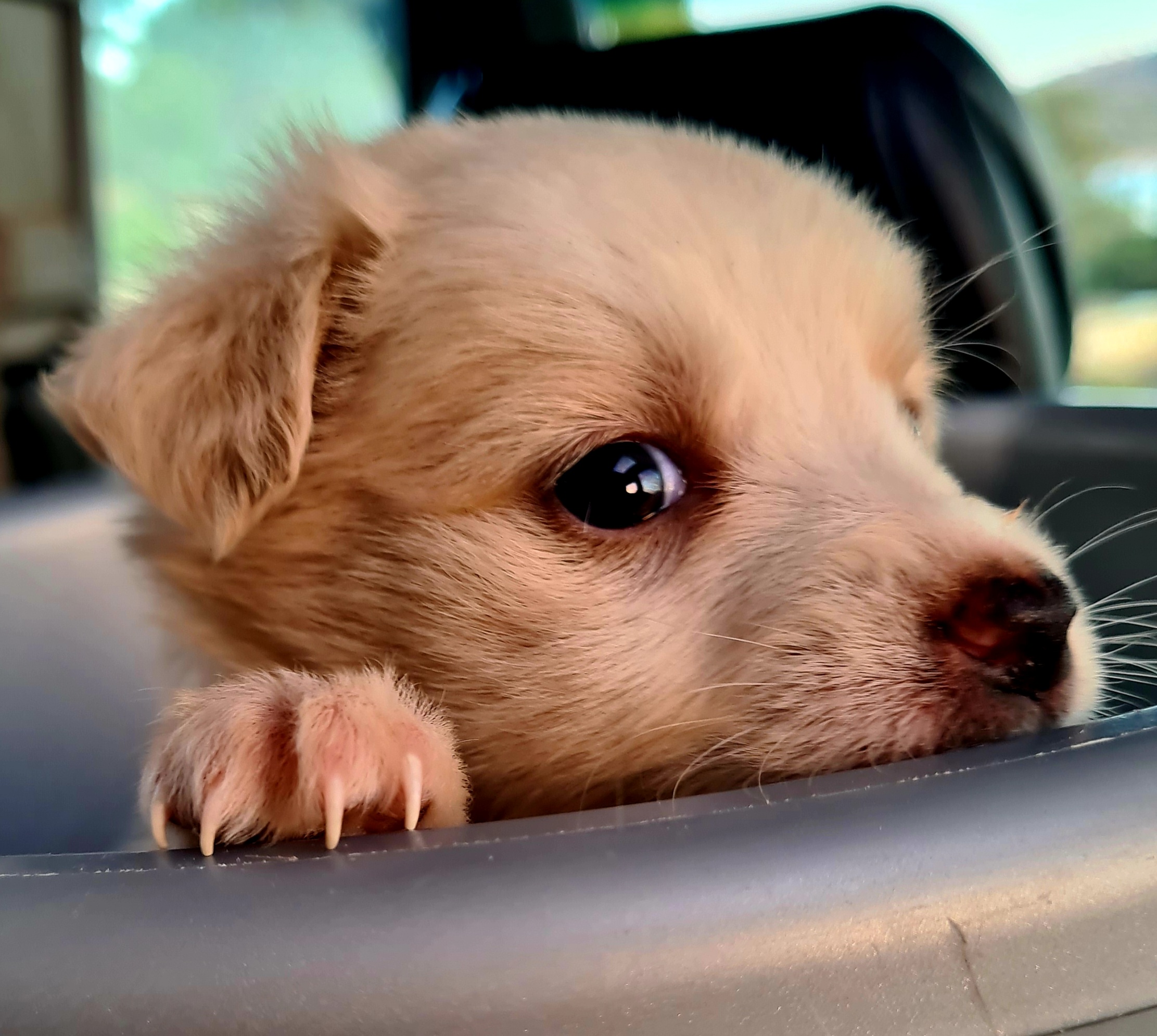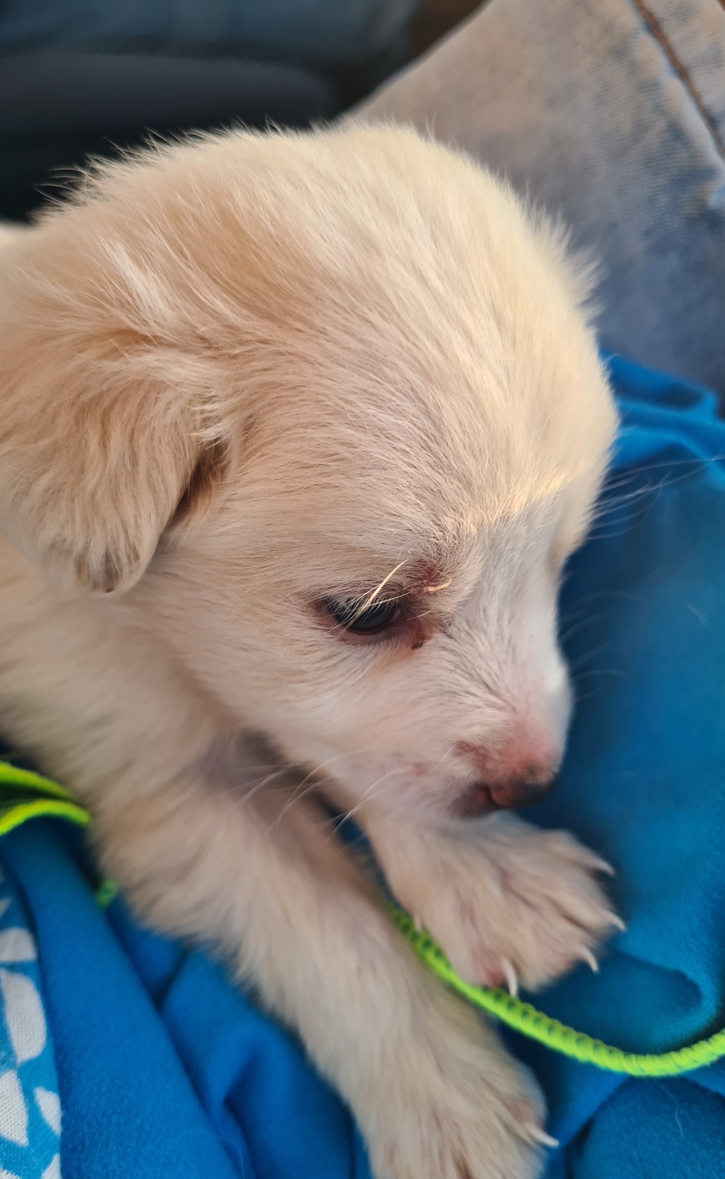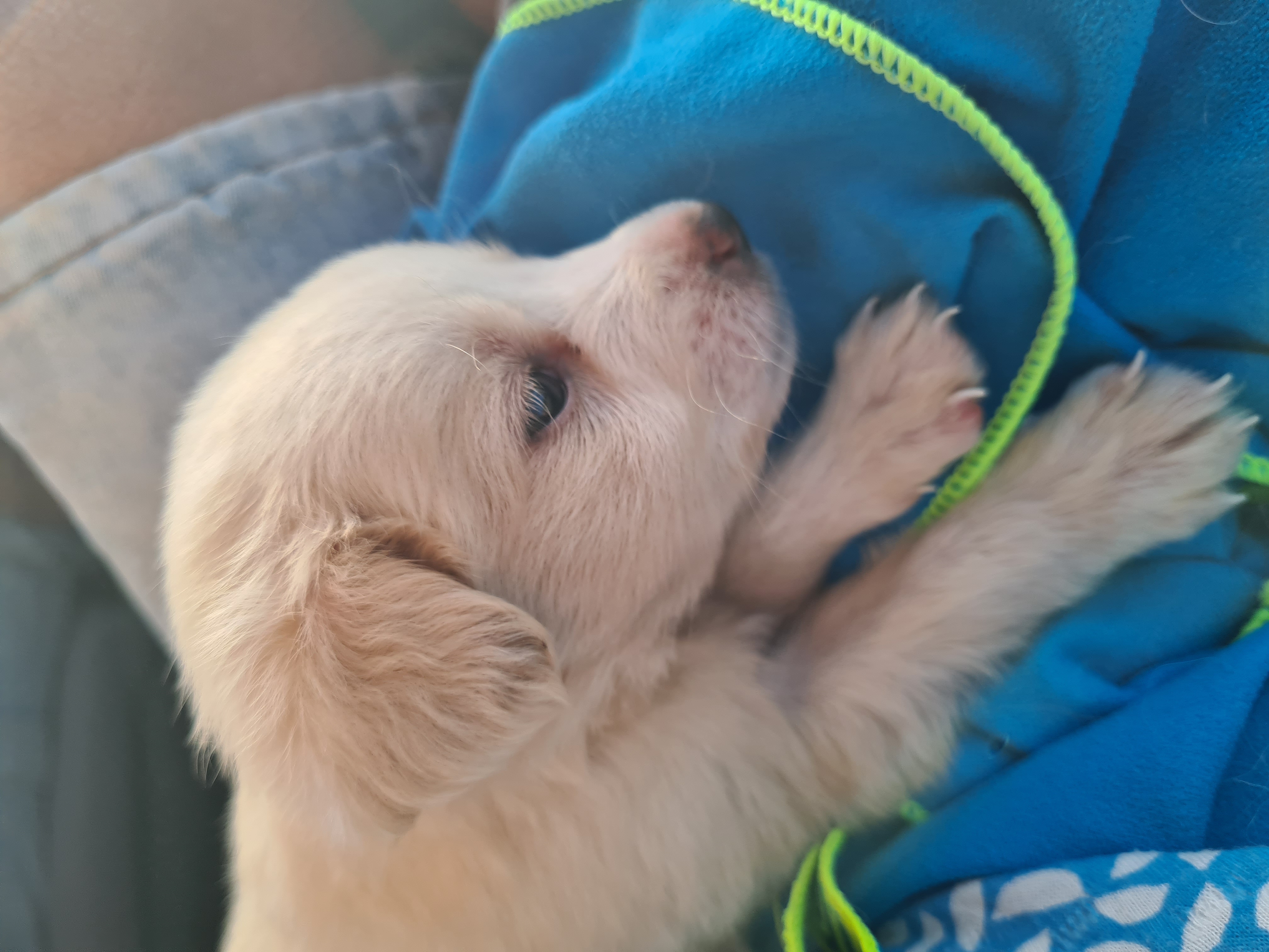 Um 16 Uhr verabschieden wir uns von Julia, Martin und Rudi und kaum haben wir Asphalt unter den Rädern, umfährt Uwe etwas Weißes auf der Landstraße und sieht im Spiegel, dass es sich bewegt. Wir halten an und werden von verzweifeltem Fiepen empfangen. Ein winziger, weißer Hundewelpe! Hätten wir ihn in der Dämmerung auf der Straße gelassen, wäre er sicher überfahren worden. Also packen wir das kleine Häufchen Elend kurzerhand ein. Eine Lösung können wir später noch finden. Wir holen uns Rat bei Tiere in Not und anderen Tierfreunden und hoffen auf eine ruhige Nacht mit einem Baby.
