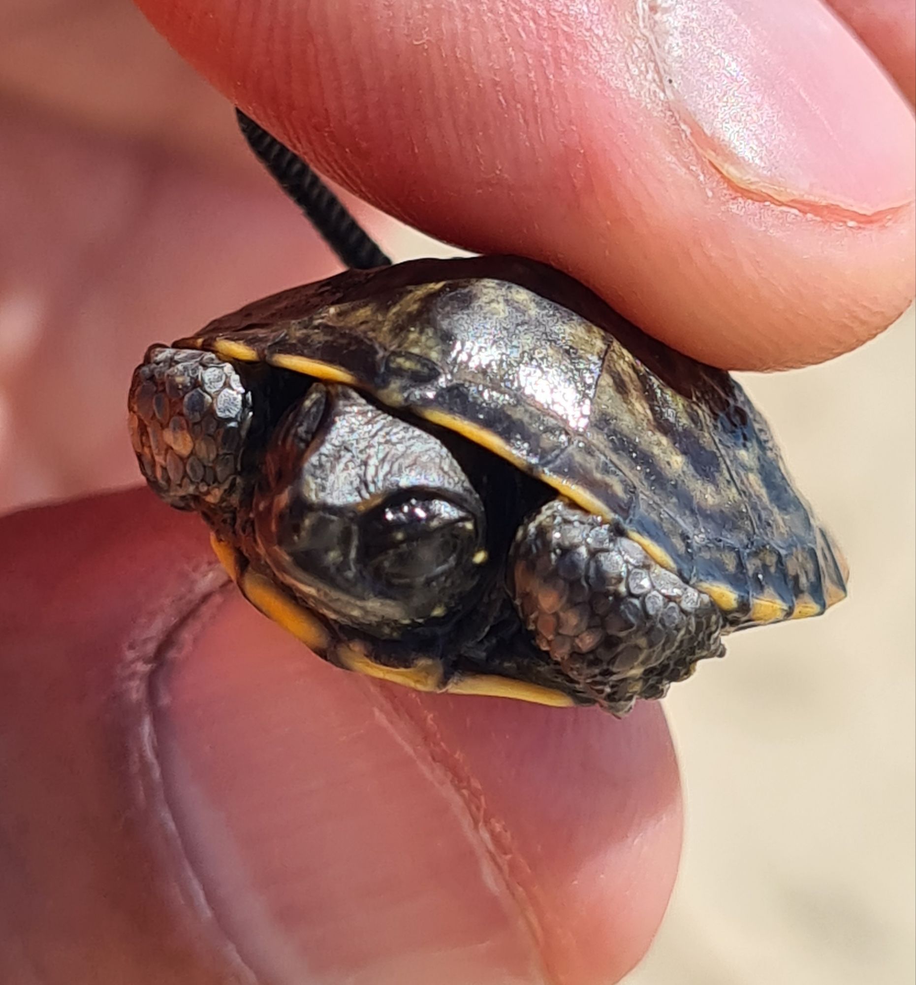 Wir wussten leider nicht genau, ob wir sie ins Wasser bringen sollten, weil es sich um eine Wasserschildkröte handelt oder ob sie sich mehr darüber freut, wenn wir sie ins Gras setzen, weil es eine Landschildkröte ist.