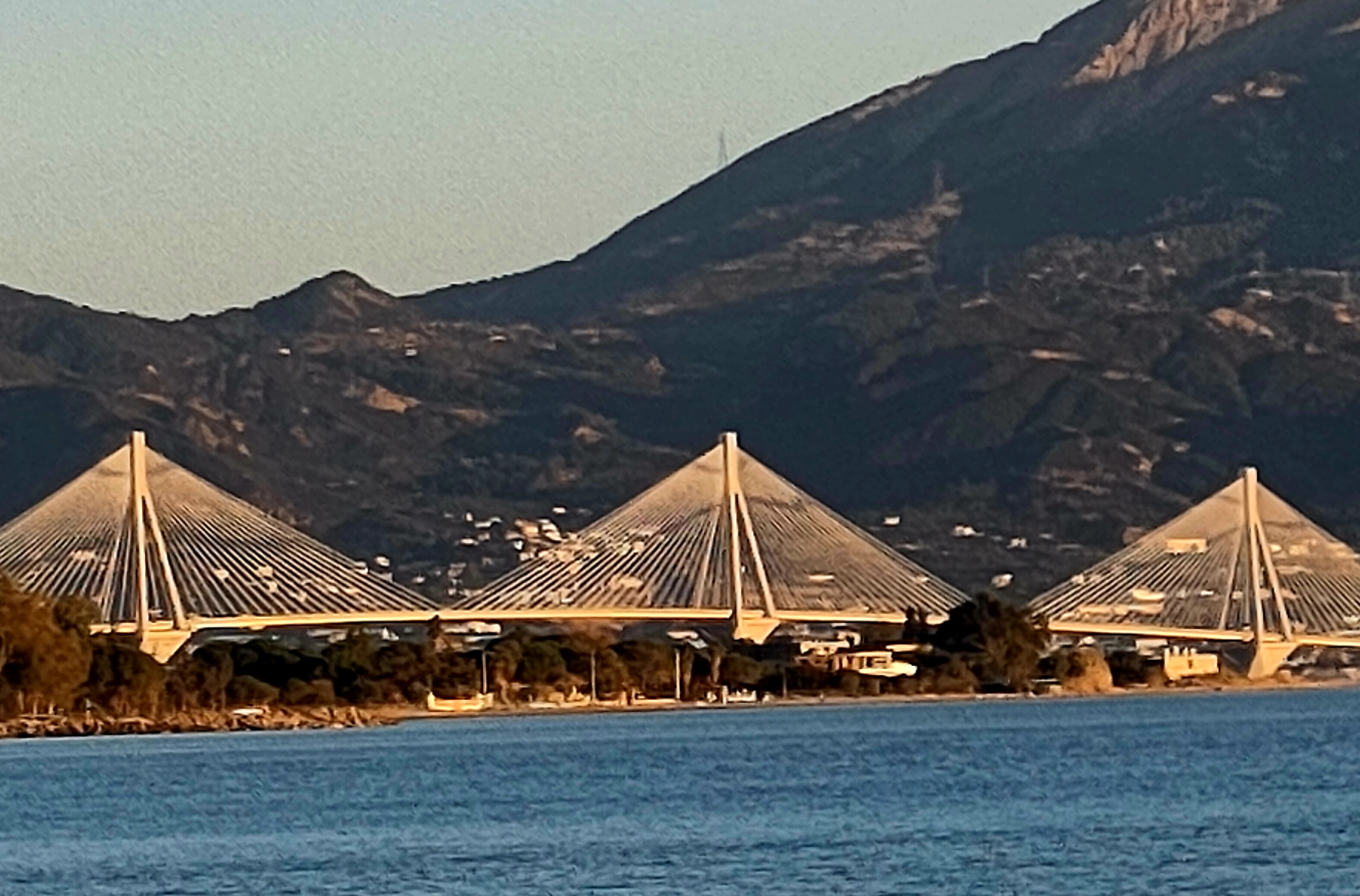 Die Pyramiden sind die Spannseile der Brücke, sieht aber auf dem Bild tatsächlich so aus, als wären es Geisterpyramiden.