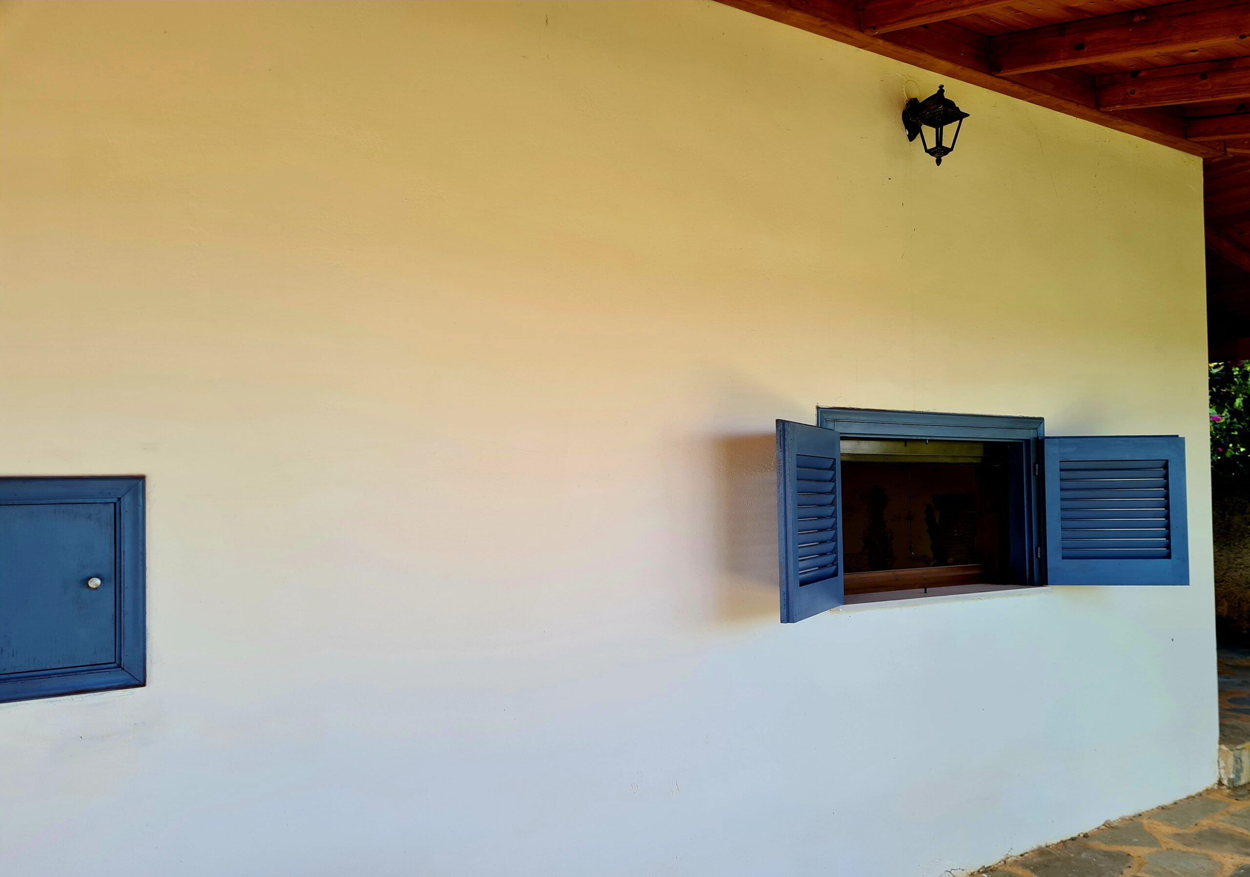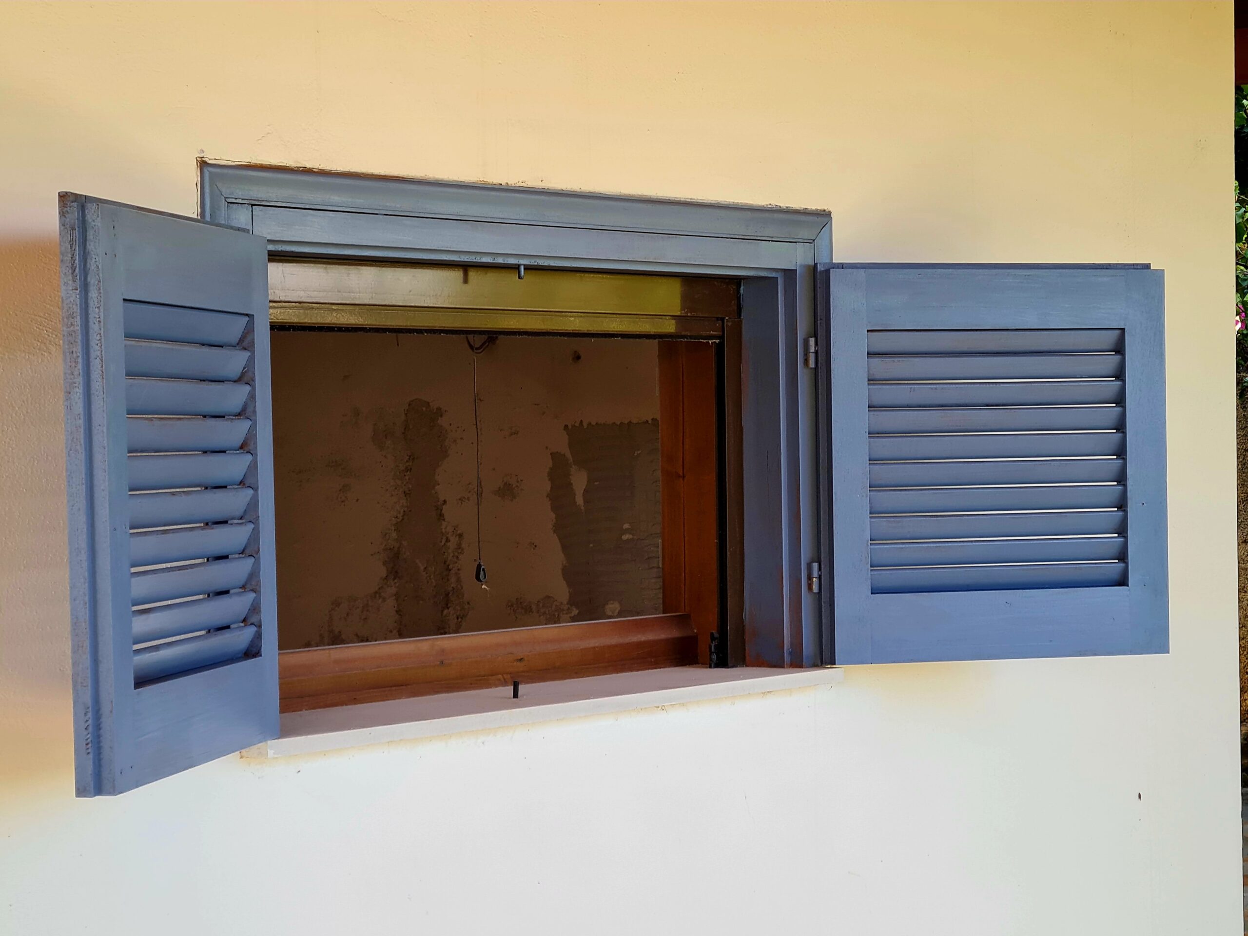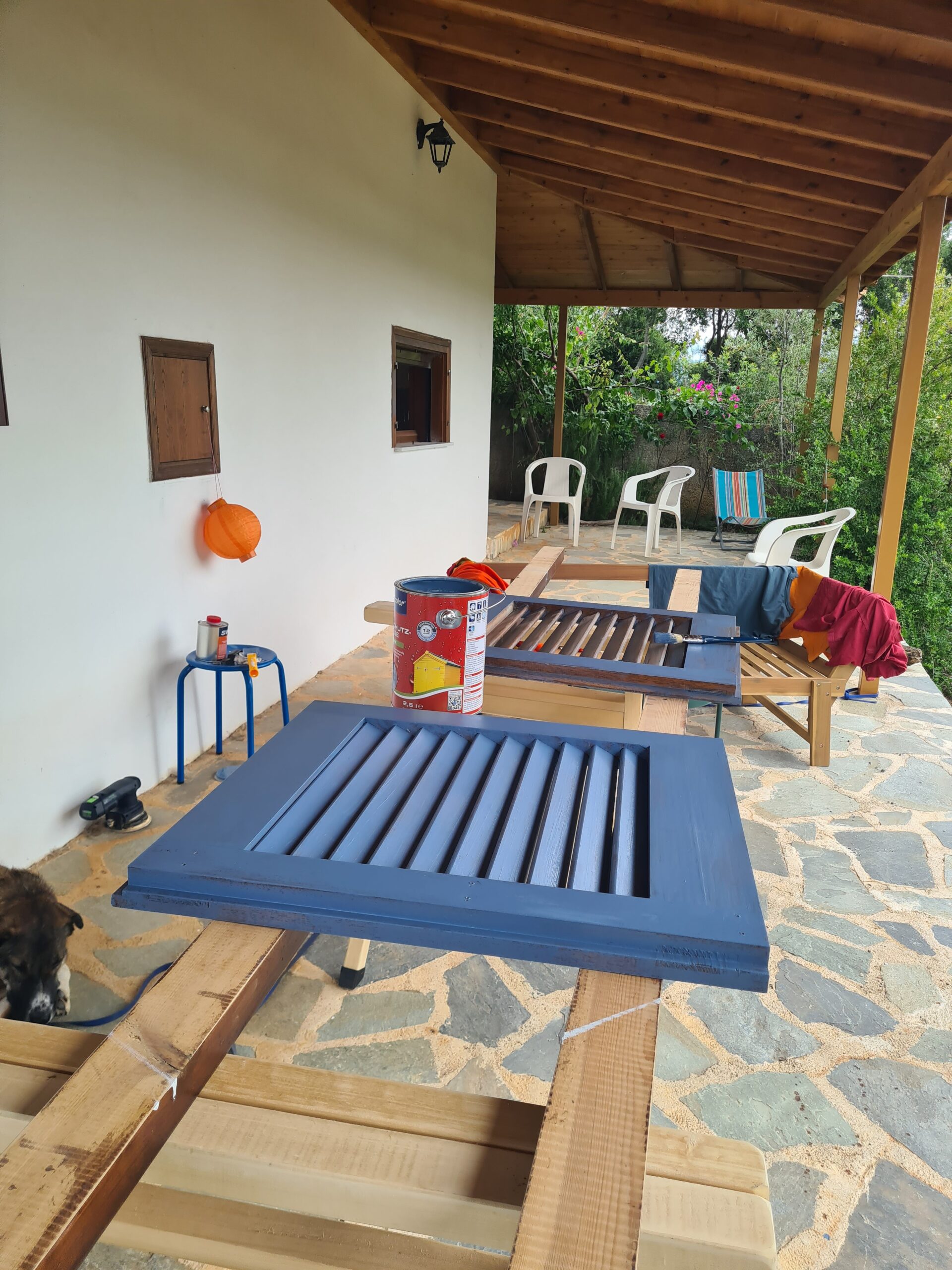 Zum Arbeiten im Haus ist das Wetter in Ordnung und weil die weiße Farbe aufgebraucht ist, kann Carmen endlich blau streichen. Die Klappläden sollen nämlich blau werden. Blaue Läden und Fenster sind zwar eher auf den Kykladen üblich, aber wir können uns das auch hier gut vorstellen. Natürlich nicht so leuchtend Kykladenblau! Wir haben uns für ein Taubenblau entschieden, damit wir die Nachbarschaft nicht zu sehr aufschrecken.
