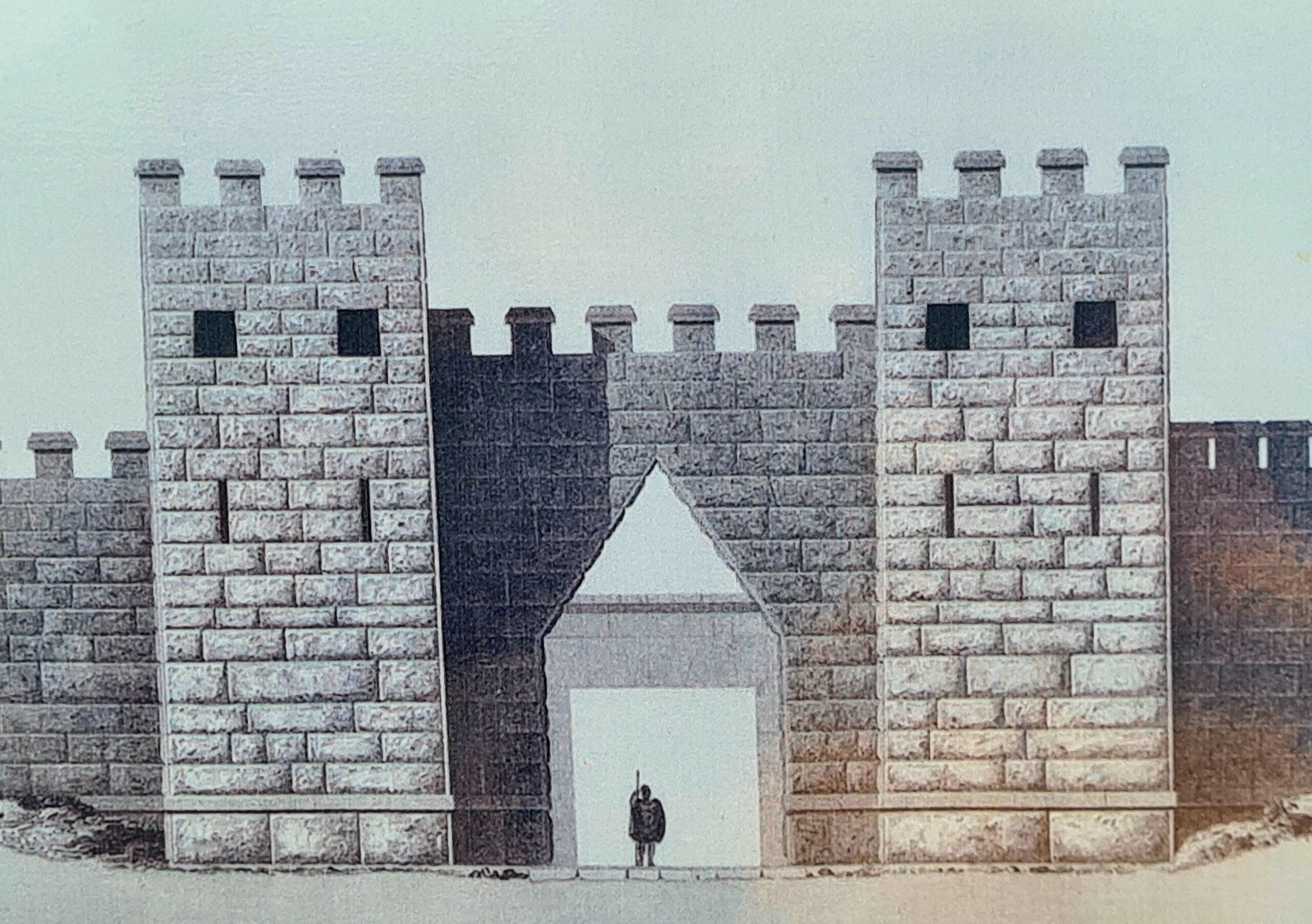 Von den Wehrtürmen gab es insgesamt 19 Stück. Die Stadtmauer und die Wehrtürme sind aus riesigen quaderförmigen Kalksteinen, teilweise ohne Mörtel, gemauert.