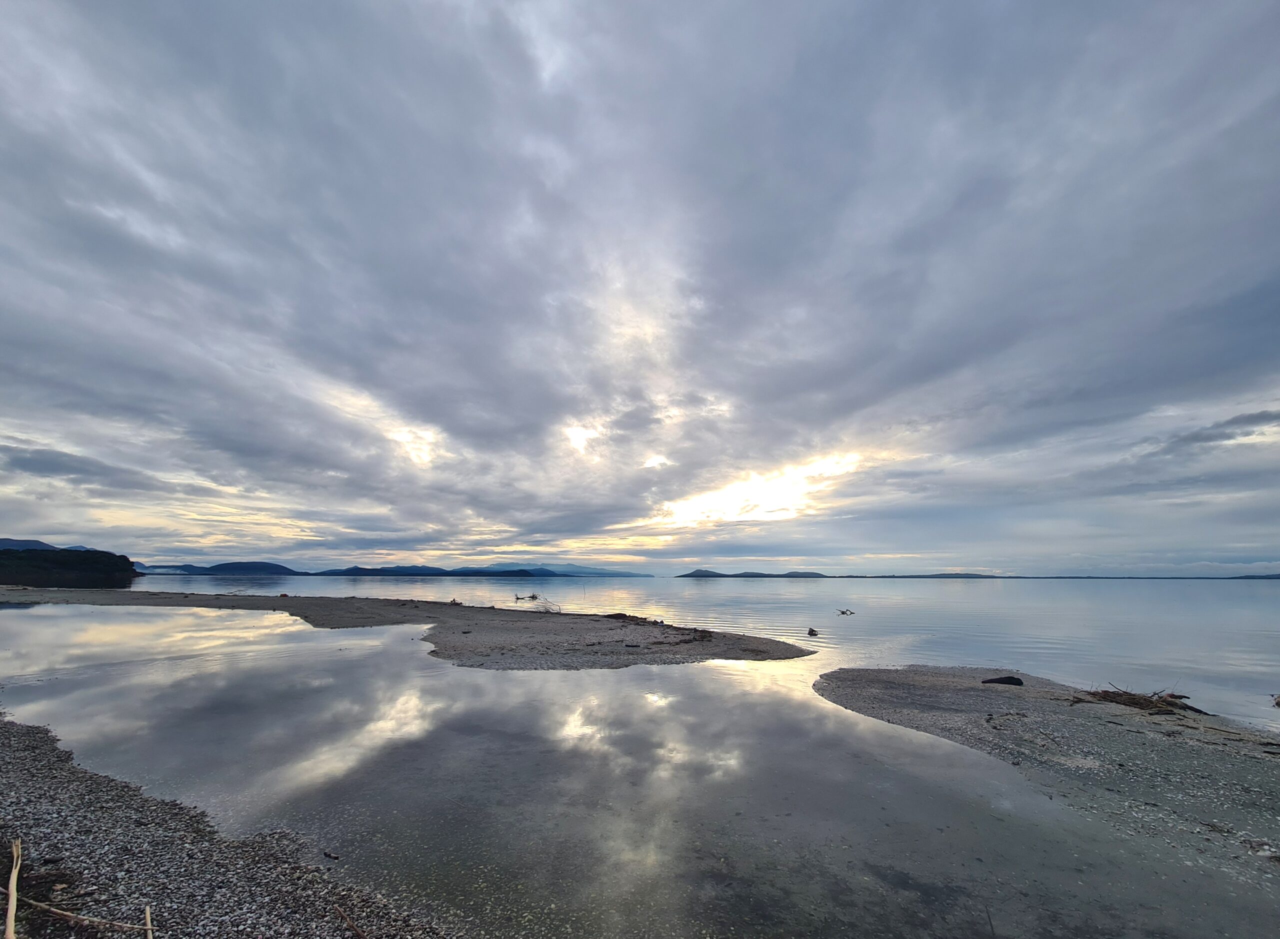 Zuerst laufen wir an den Fráchtis-Strand und wir sehen tatsächlich ein paar Sonnenstrahlen.