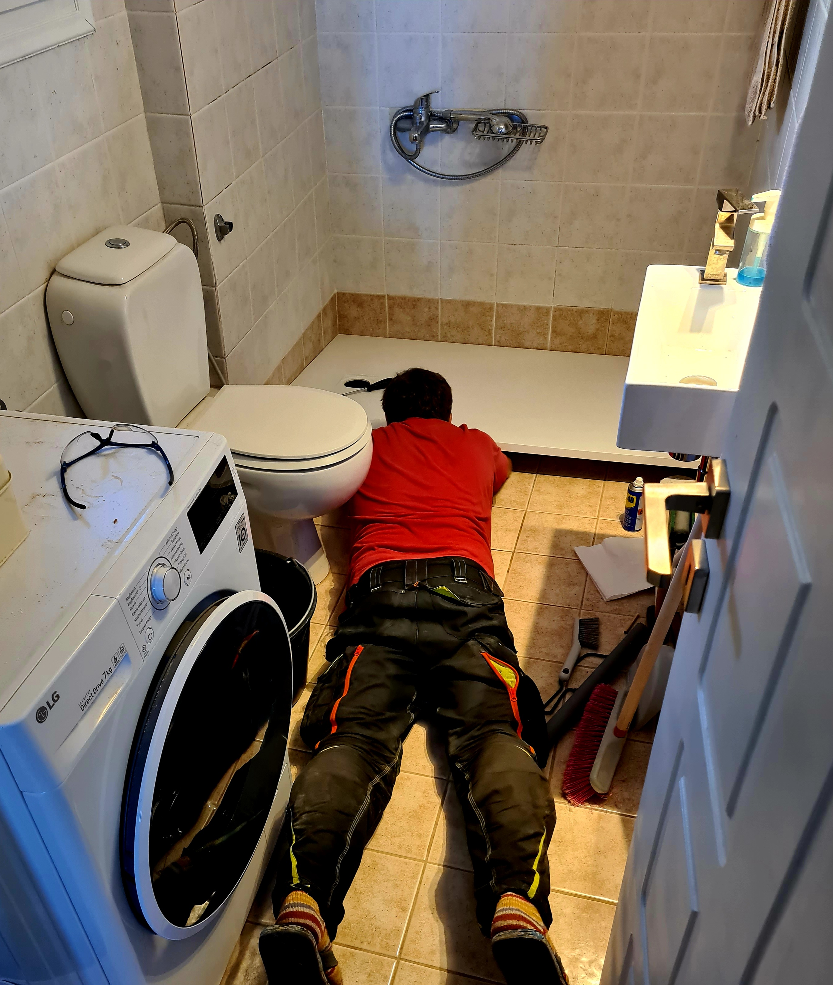 Es ist wieder wunderschöner Sonnenschein. Carmen verleiht der letzten Tür noch ein bisschen Glanz, macht große Wäsche und Uwe verlegt den Abfluss der Duschtasse.