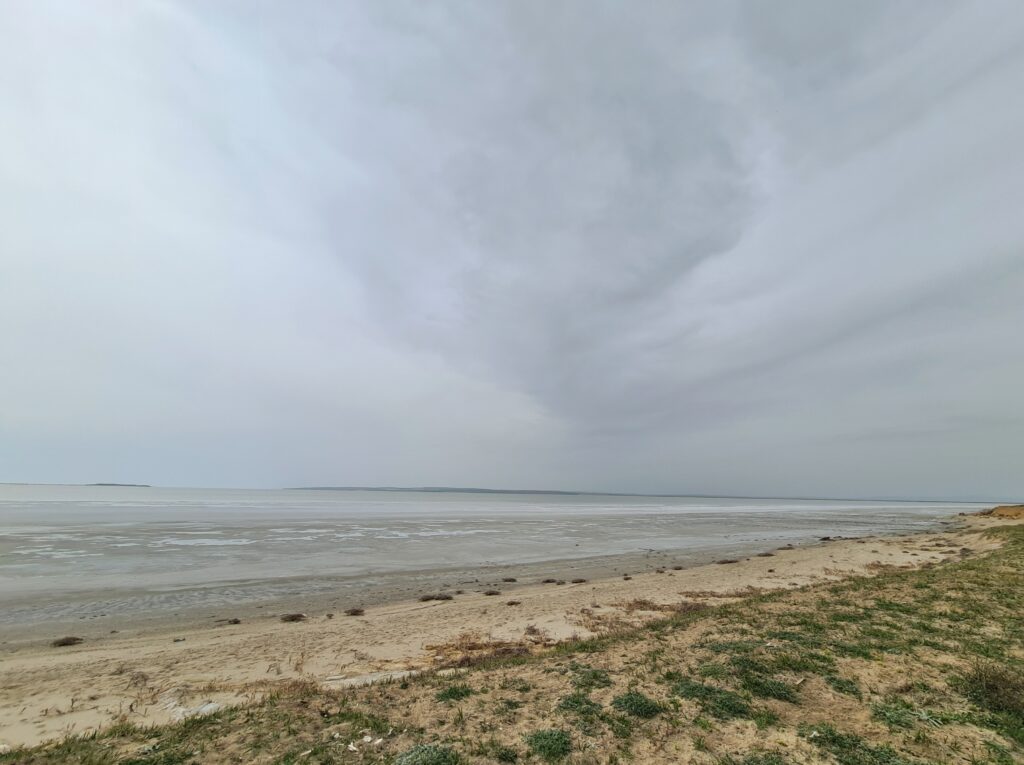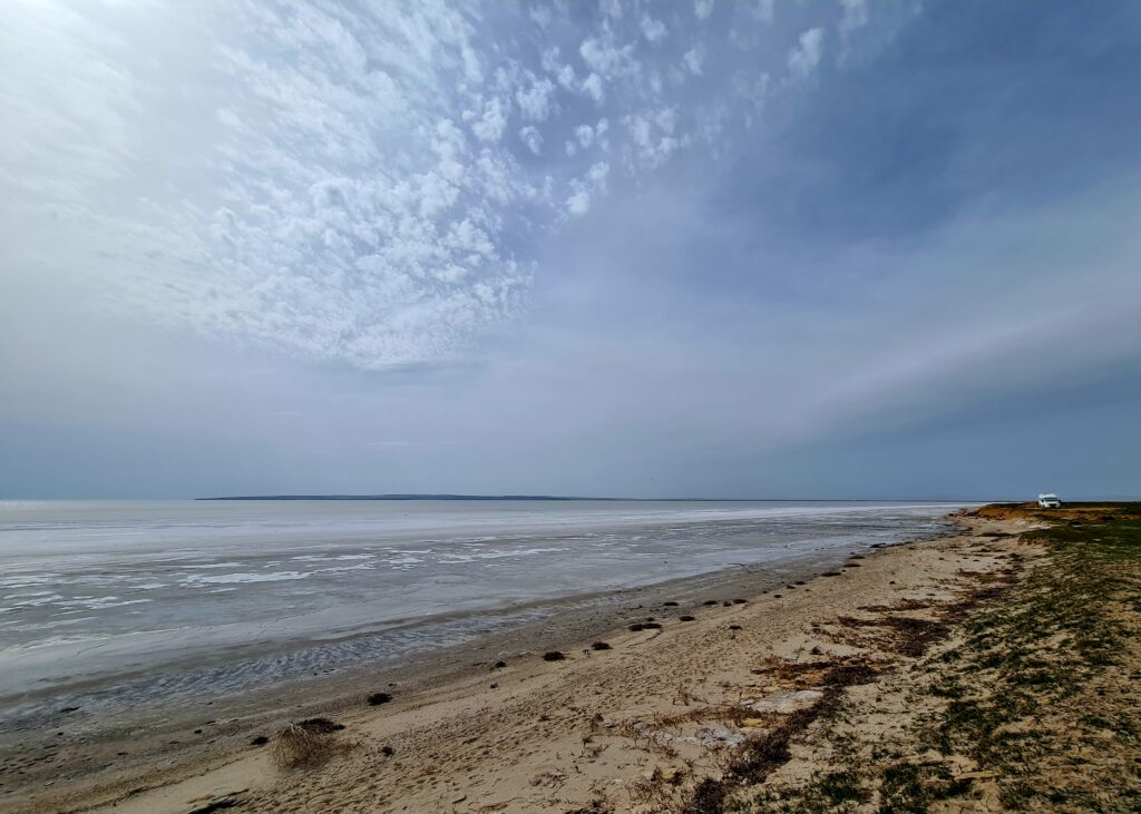Leider zieht sich der Himmel zu und wir können unseren Plan, den Salzsee mit dem Auto zu durchqueren nicht umsetzen. Also bleiben wir erstmal über Nacht.