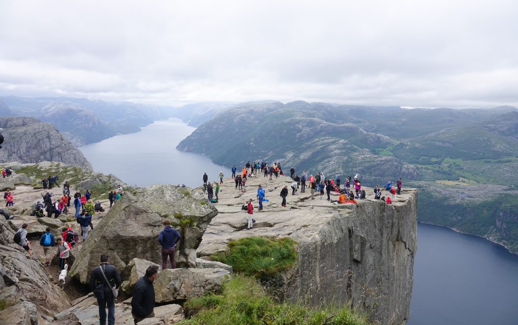 Anstrengende Wanderung zum Preikestolen (Predigerstuhl oder Kanzel). Sie ist zwar nur ca. 4 km lang, aber hat halt einiges an Höhenmetern. Der Weg besteht zu einem großen Teil aus unregelmäßigen Felsstufen. Man braucht für die 4 km etwa 2 Stunden und muss natürlich auch wieder zurück. Aber es lohnt sich, denn nicht nur die Aussicht von oben, sondern auch der gesamte Weg durch Hochmoore und zerklüftete Fellsenlandschaft ist beeindruckend.