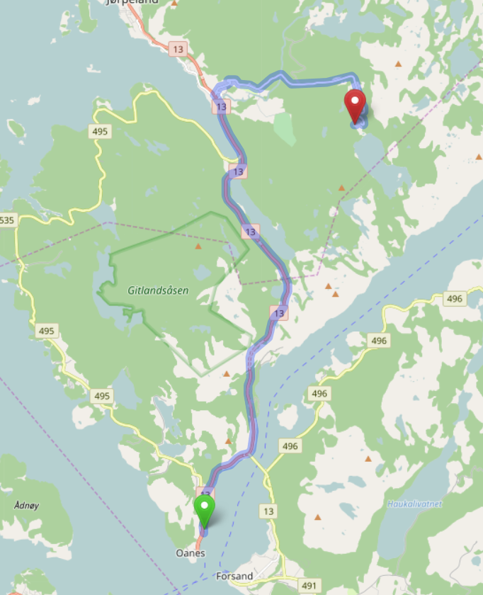 Ständig muss man hier Fjorde überqueren, weil die Verkehrsführung in den engen Tälern sehr schwierig ist. Die hier geht von Hjelmeland nach Nesvik als Straße Nummer 13.