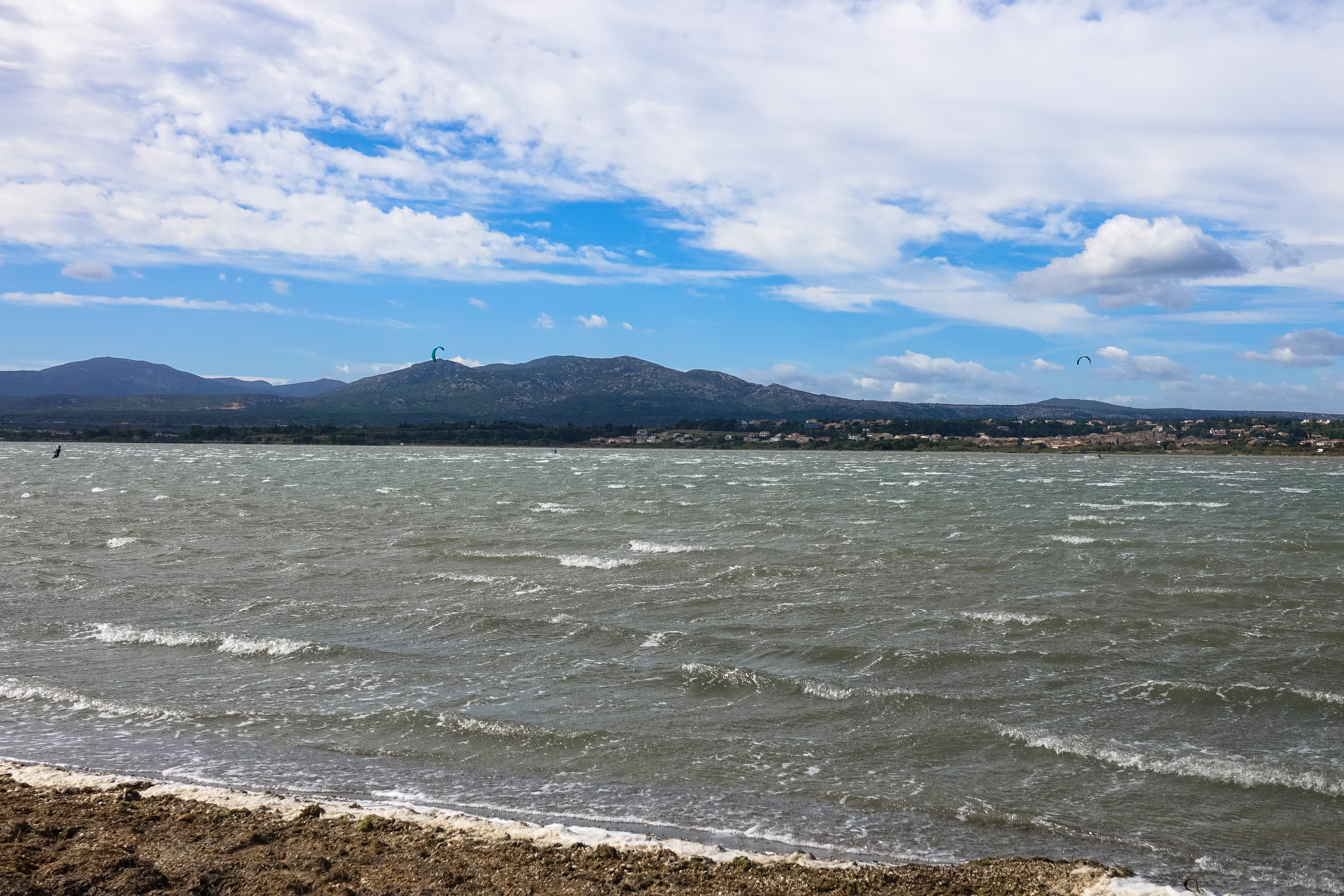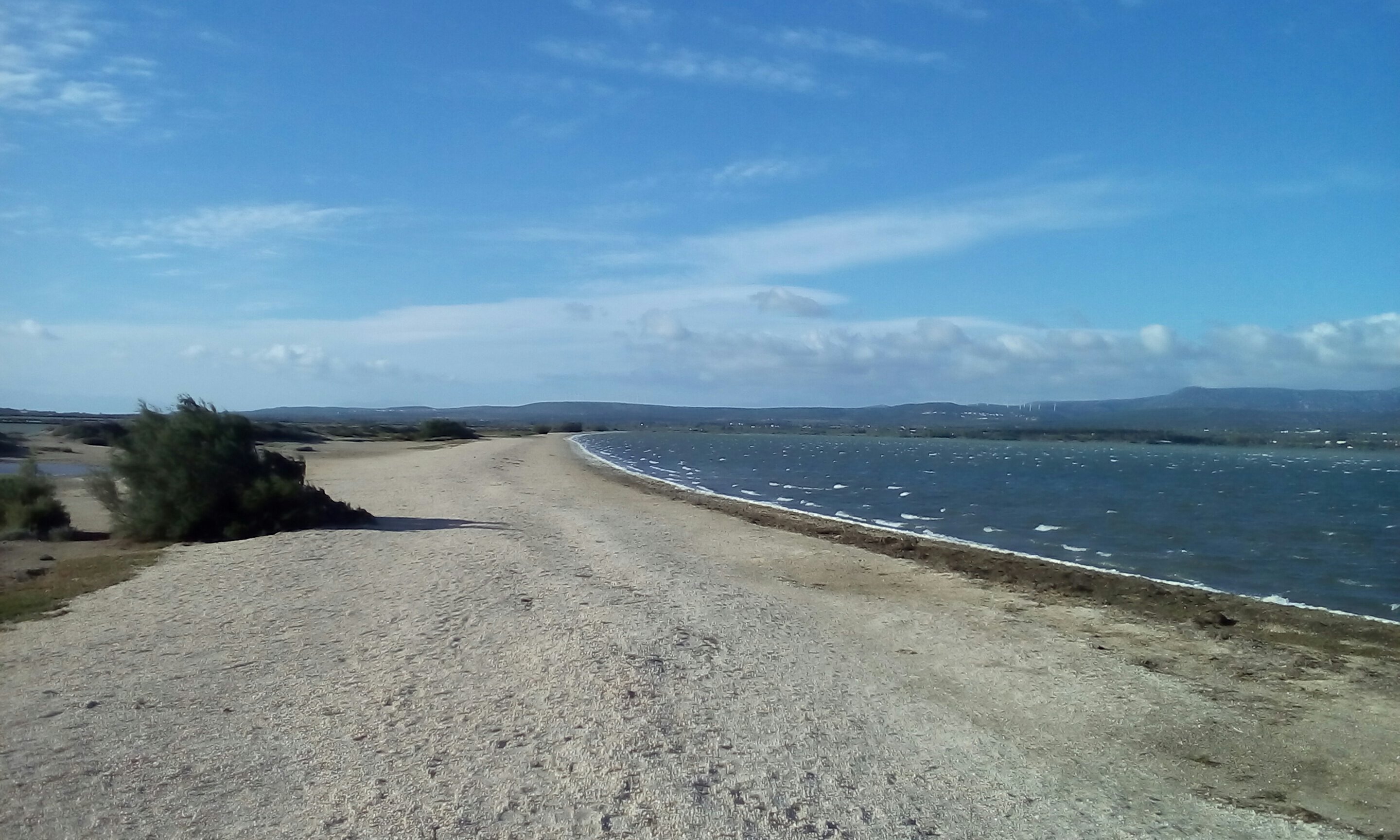 Nach einer ruhigen Nacht in Fitou sind wir heute schon wieder auf dem Sandarm und harren der Dinge, die da kommen. Es sieht gut aus, wieder ist Wind gemeldet und der Himmel ist blau. Was will man mehr? Und auf diesem Foto kann man jetzt auch gut erkennen, dass eine Straße zwischen Saline und See ist.
