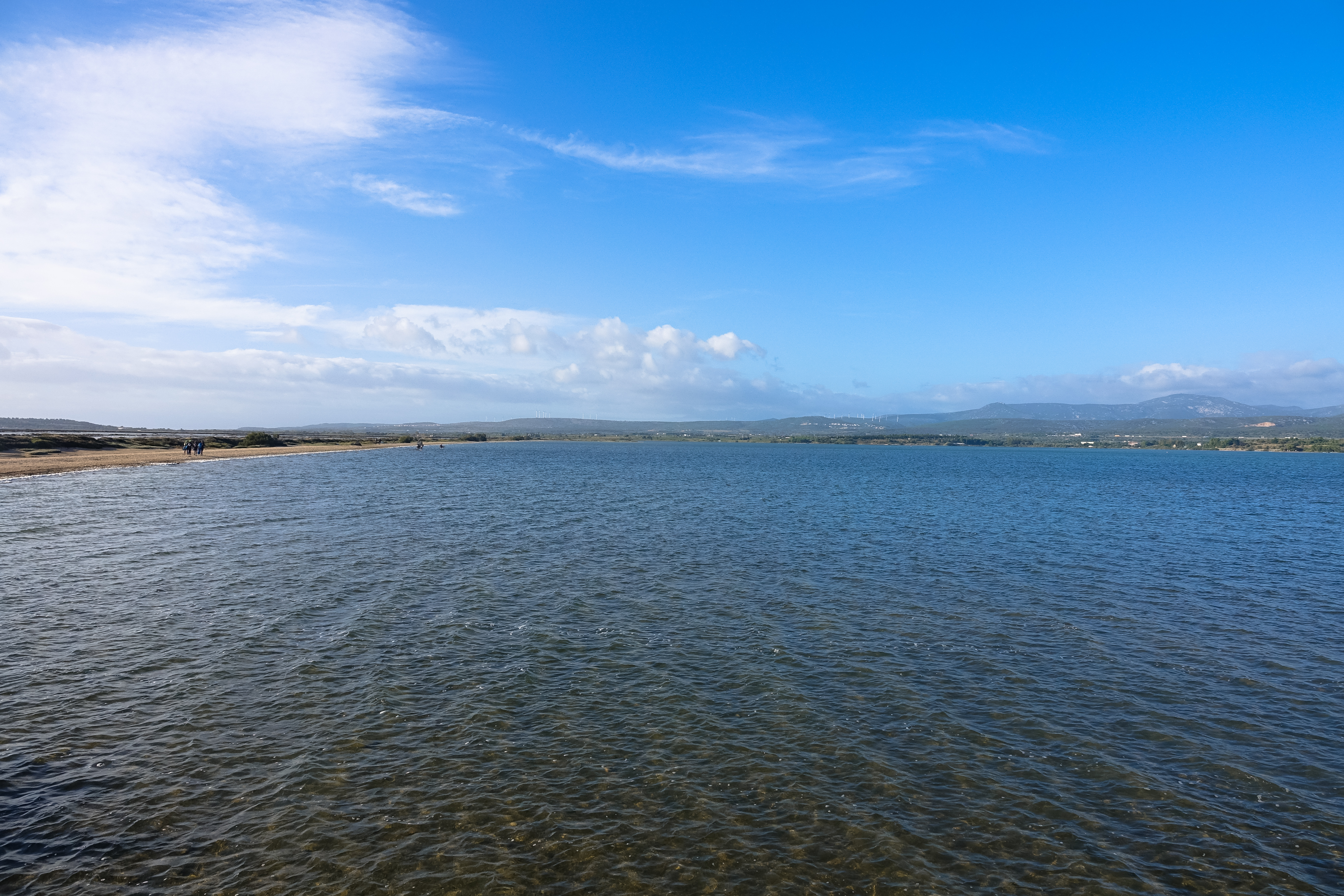 Man kann hier auf einem schmalen Sandarm stehen, der die Salinen vom Etang de la Palme abtrennt. Wir finden diesen Platz in der Mitte von Wasser großartig. Bei Wind wird man zwar ordentlich durchgepustet und Nichtsurfer finden diesen Platz ganz furchtbar, aber wir finden es genial diese Rundumsicht auf Wasser zu haben.