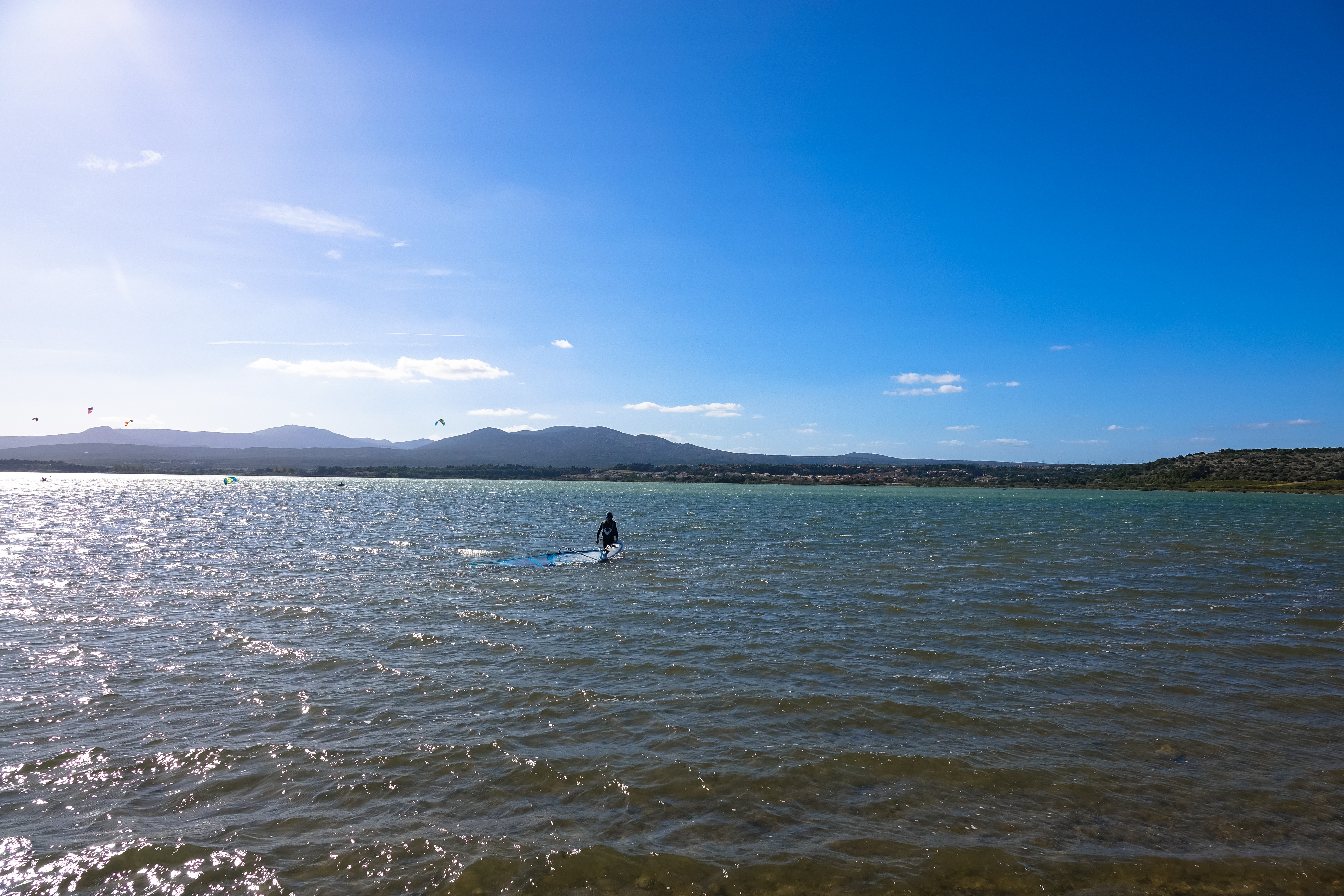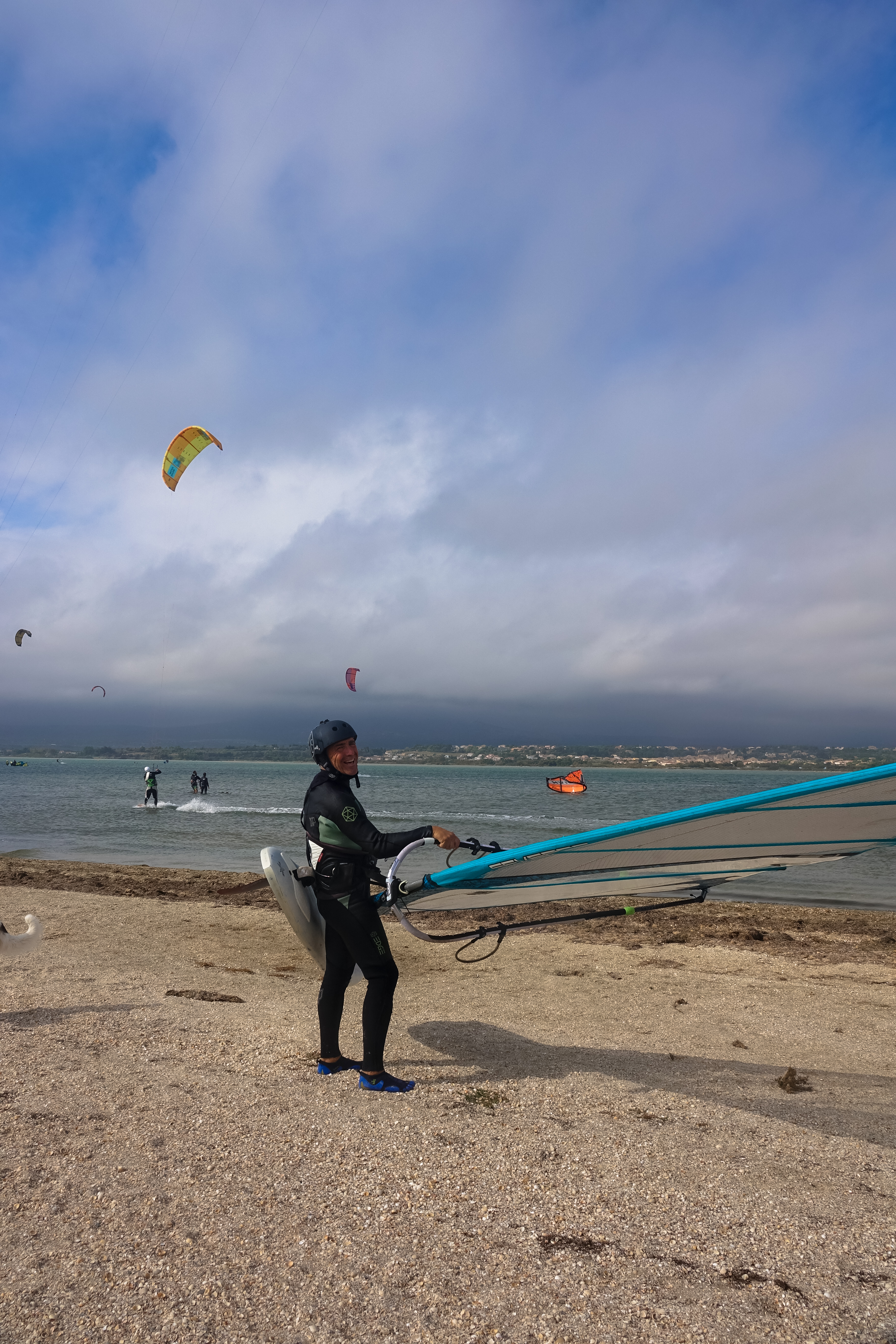 Carmen entschließt sich das 5.9er Segel vom Dach zu holen. Beim Abladen merkt sie aber schon, dass der Wind zulegt. Uwe hat zwar mindestens 5 Mal gemessen, aber wie gesagt, manche Tage sind einfach verflixt. Aber dann wird doch noch alles gut. Uwe hat Spaß mit dem 15er Kite und Carmen mit dem 5.3er Segel. Endlich einmal einfache Geleitbedingungen, bei denen man nicht durch starke Böen zum Aufmachen gezwungen wird oder einen Schleudersturz hinlegt. Später geht Carmen sogar mit dem 5.9er aufs Wasser und alles ist perfekt. Anschließend fahren wir noch ins Super U, weil wir weder Milch noch Brot an Bord haben und testen den Stellplatz in Villesèque des Corbierès.