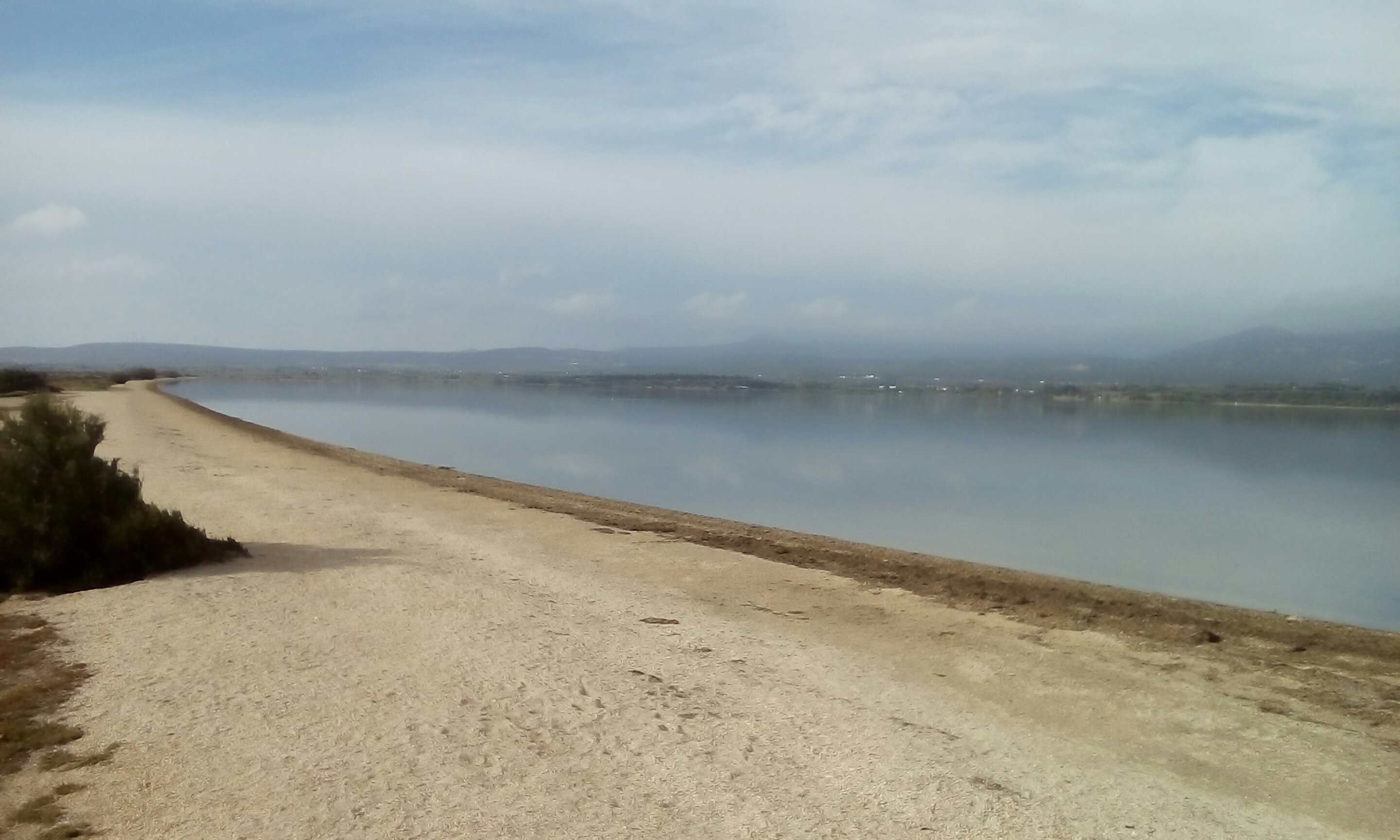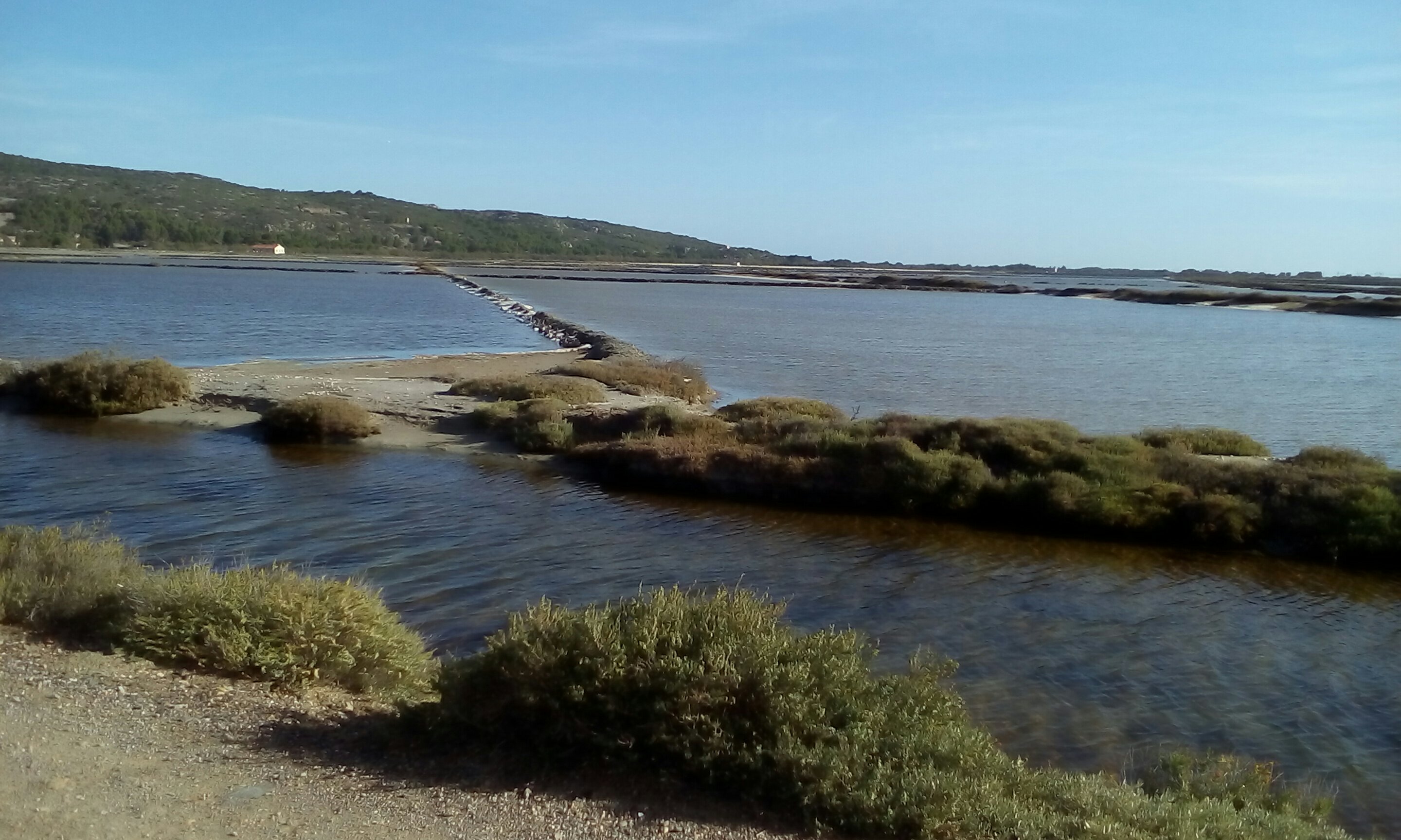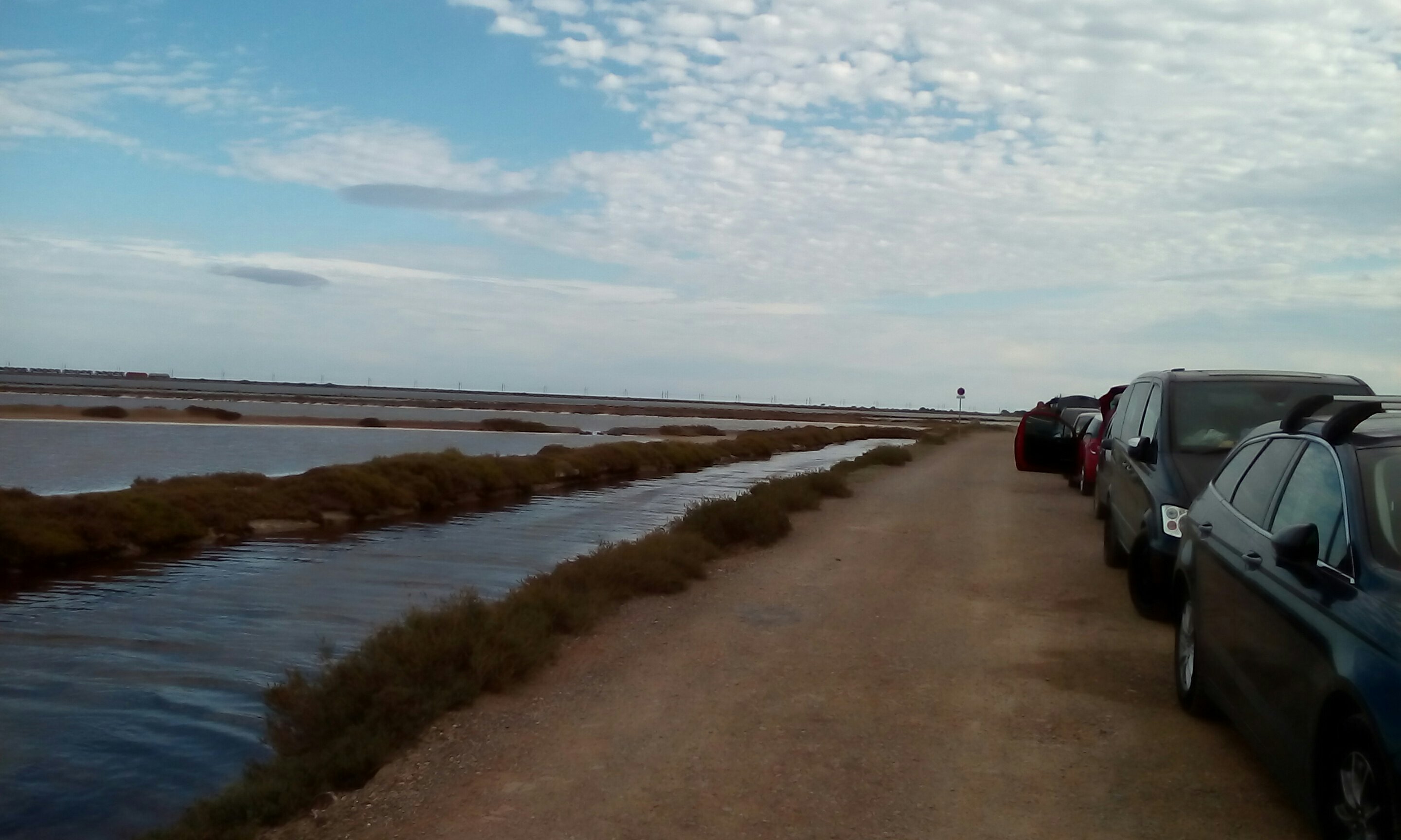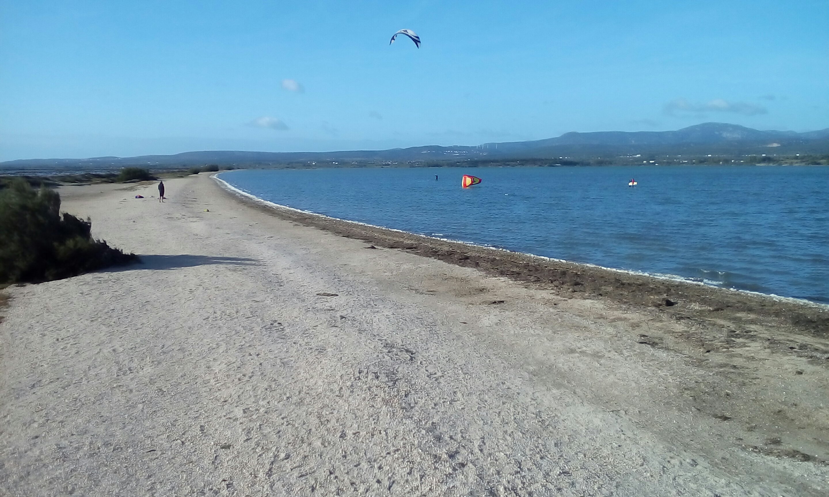 Nach einer ruhigen Nacht in Fitou sind wir heute schon wieder auf dem Sandarm und harren der Dinge, die da kommen. Es sieht gut aus, wieder ist Wind gemeldet und der Himmel ist blau. Was will man mehr? Und auf diesem Foto kann man jetzt auch gut erkennen, dass eine Straße zwischen Saline und See ist.
