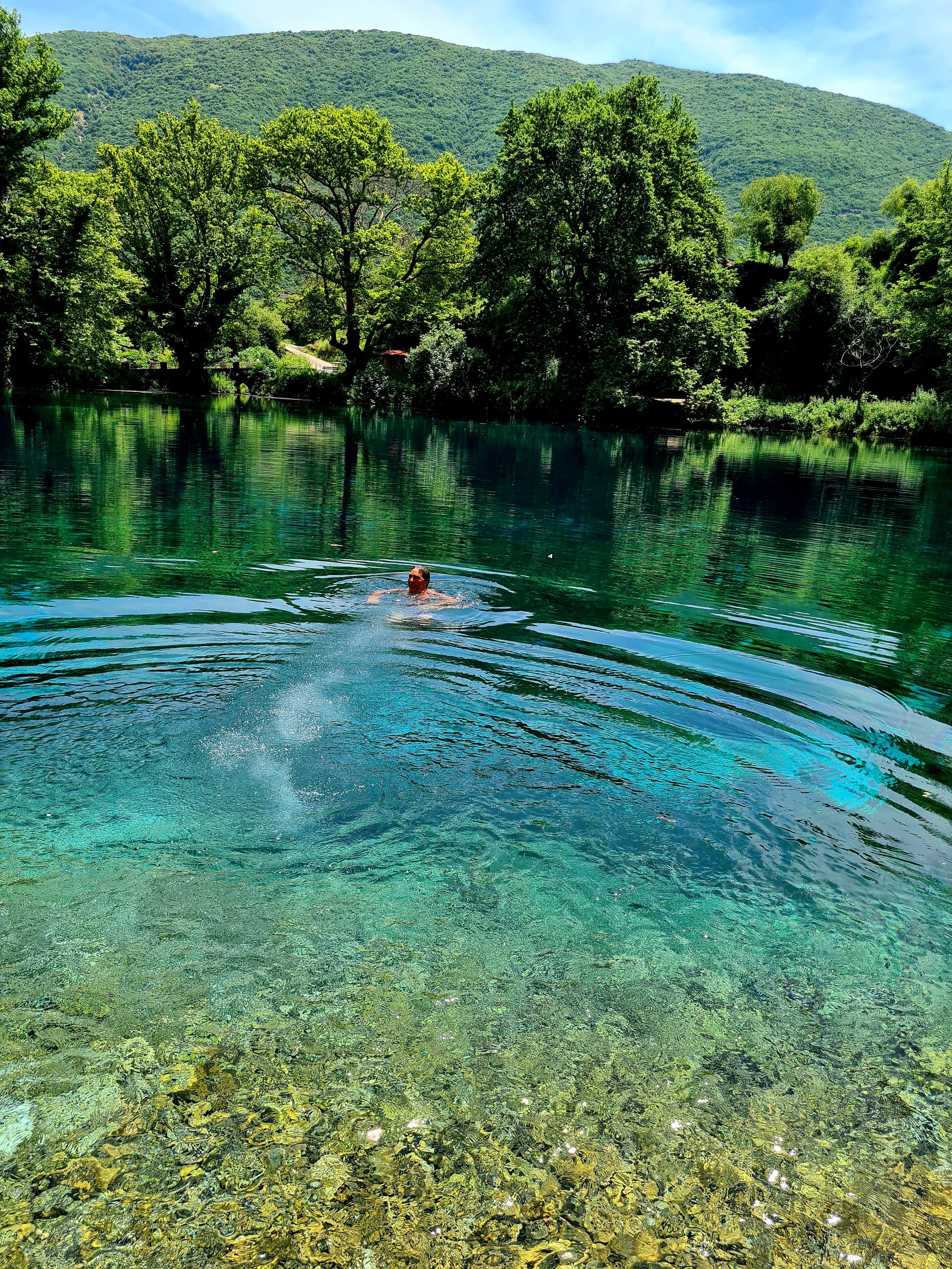 Uwe steht hier nicht im Meer, sondern in einem Quelltopf. Früher hat er sich noch komplett rein gelegt, er wird halt auch älter…… Das Wasser ist nämlich extrem kalt.