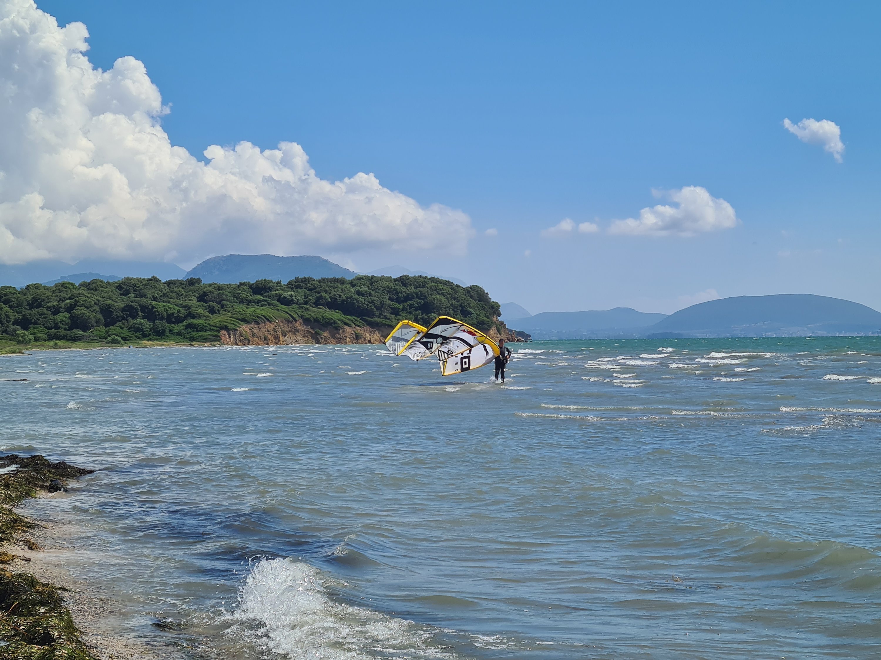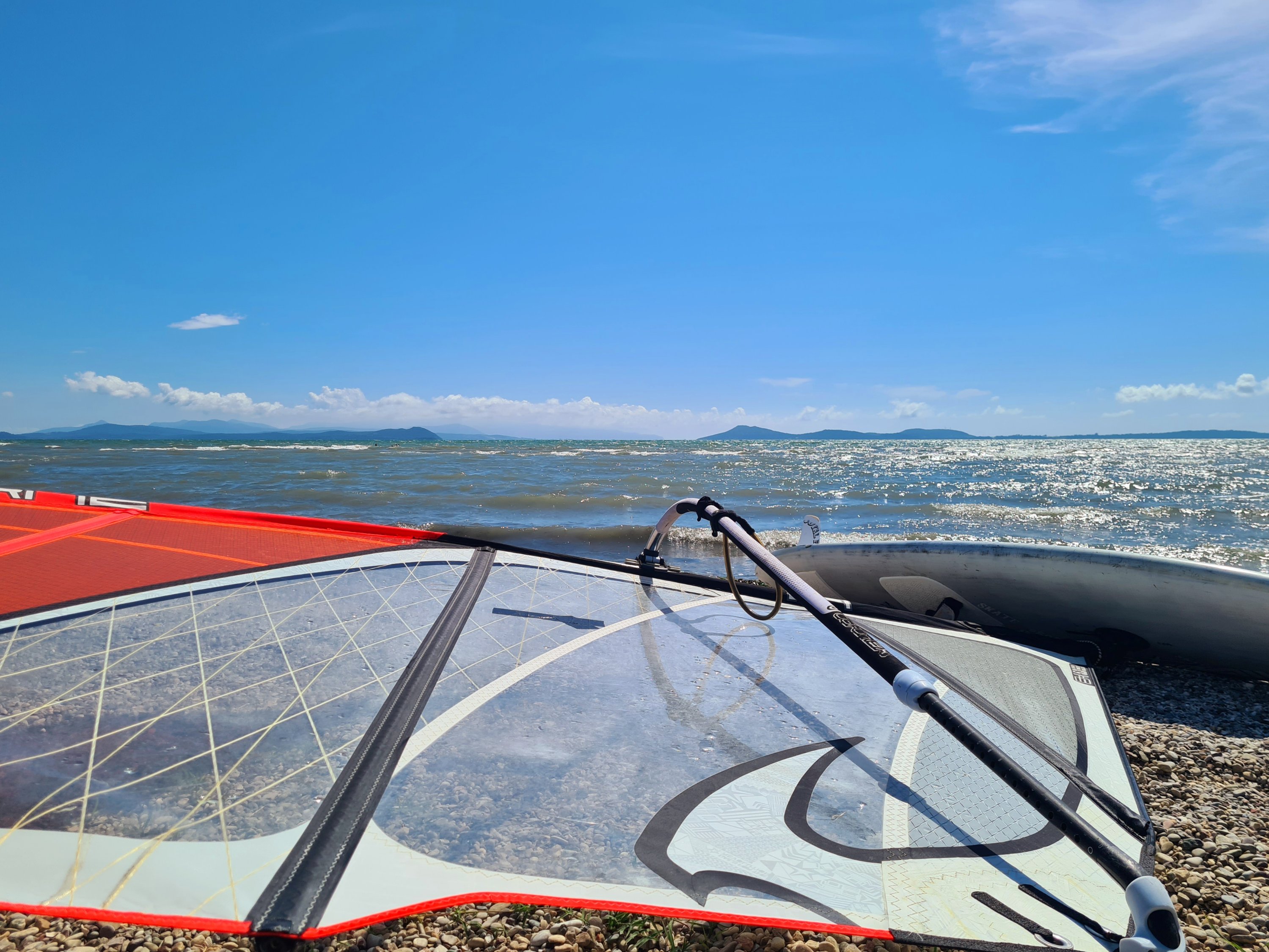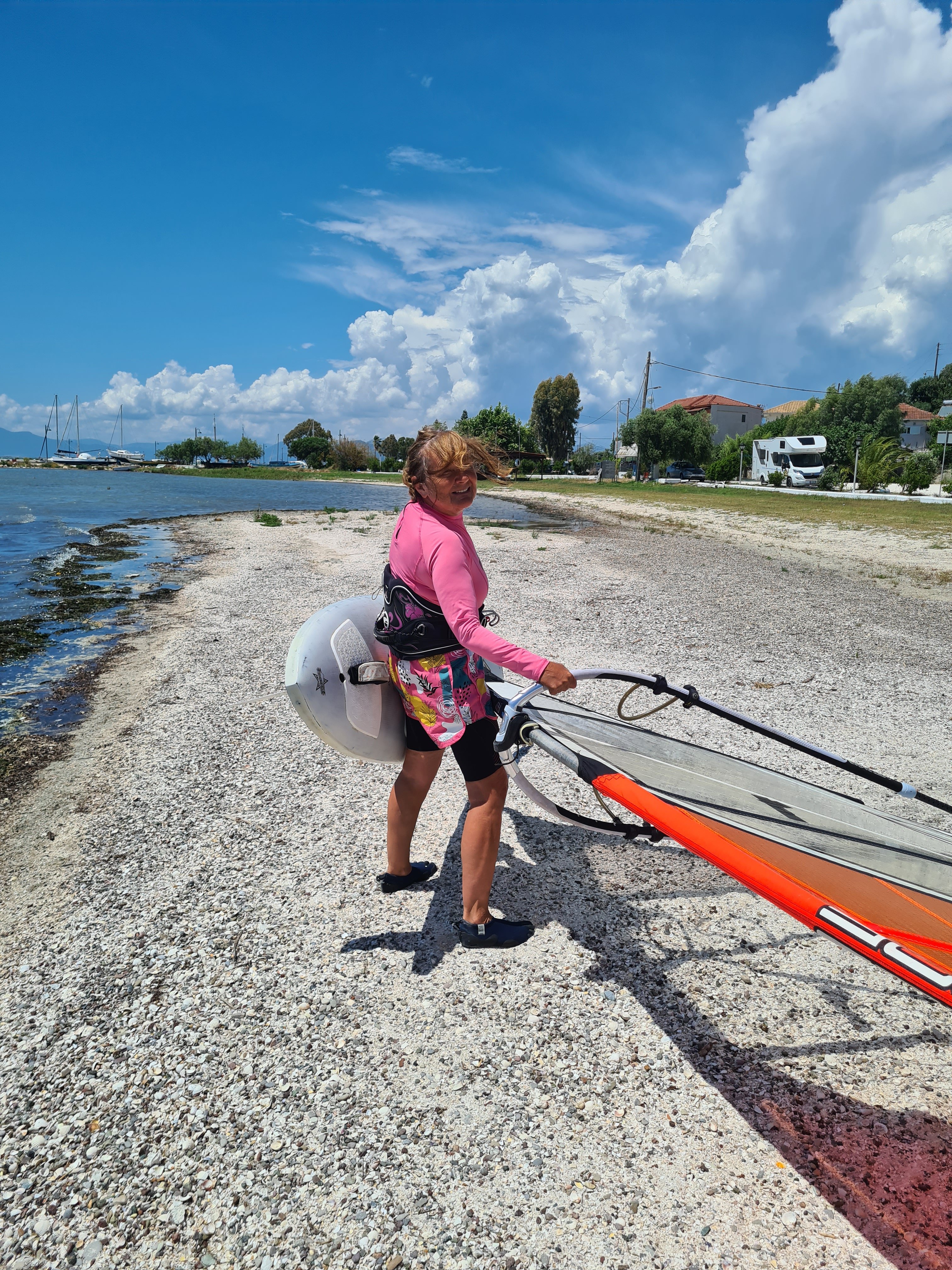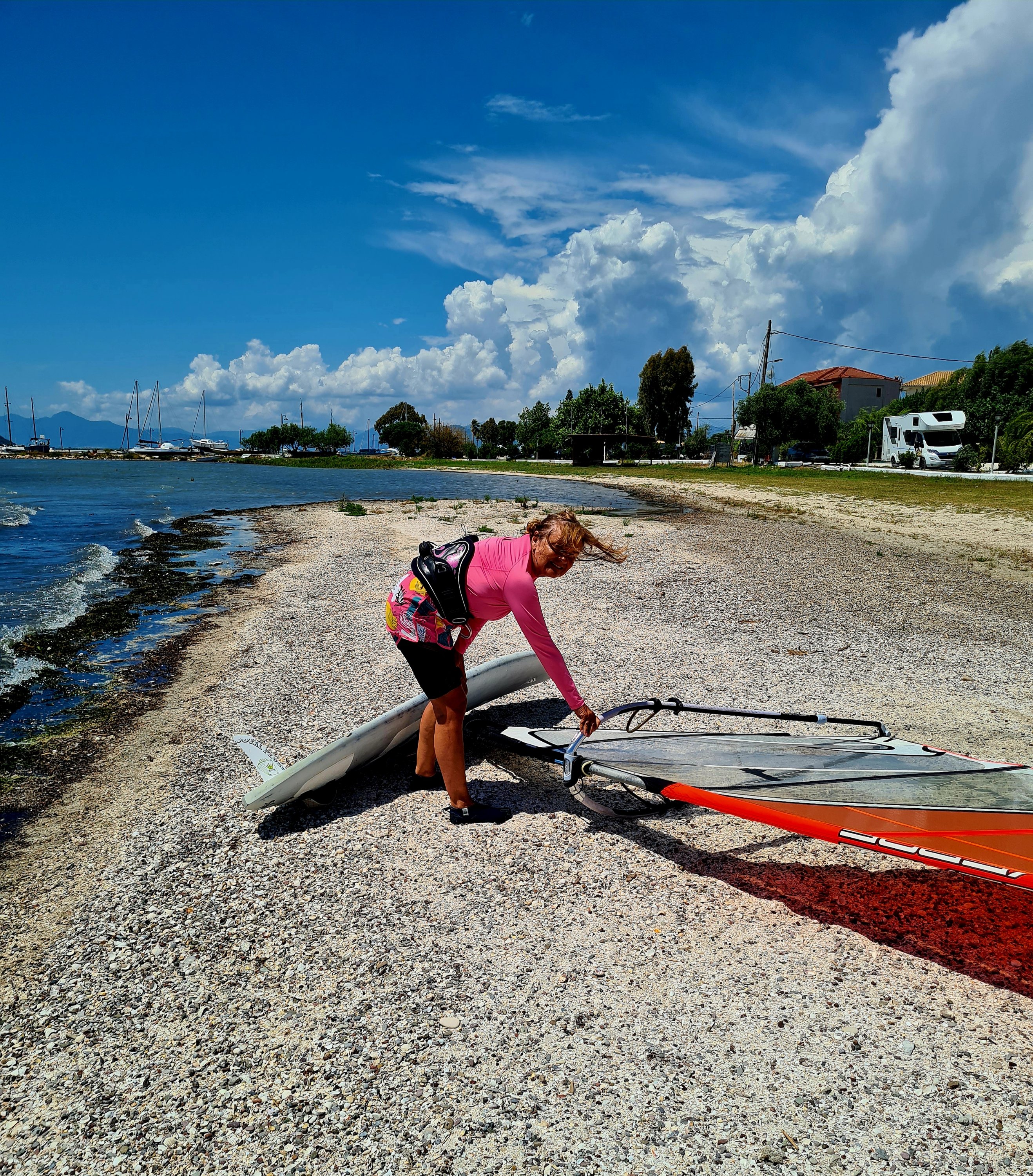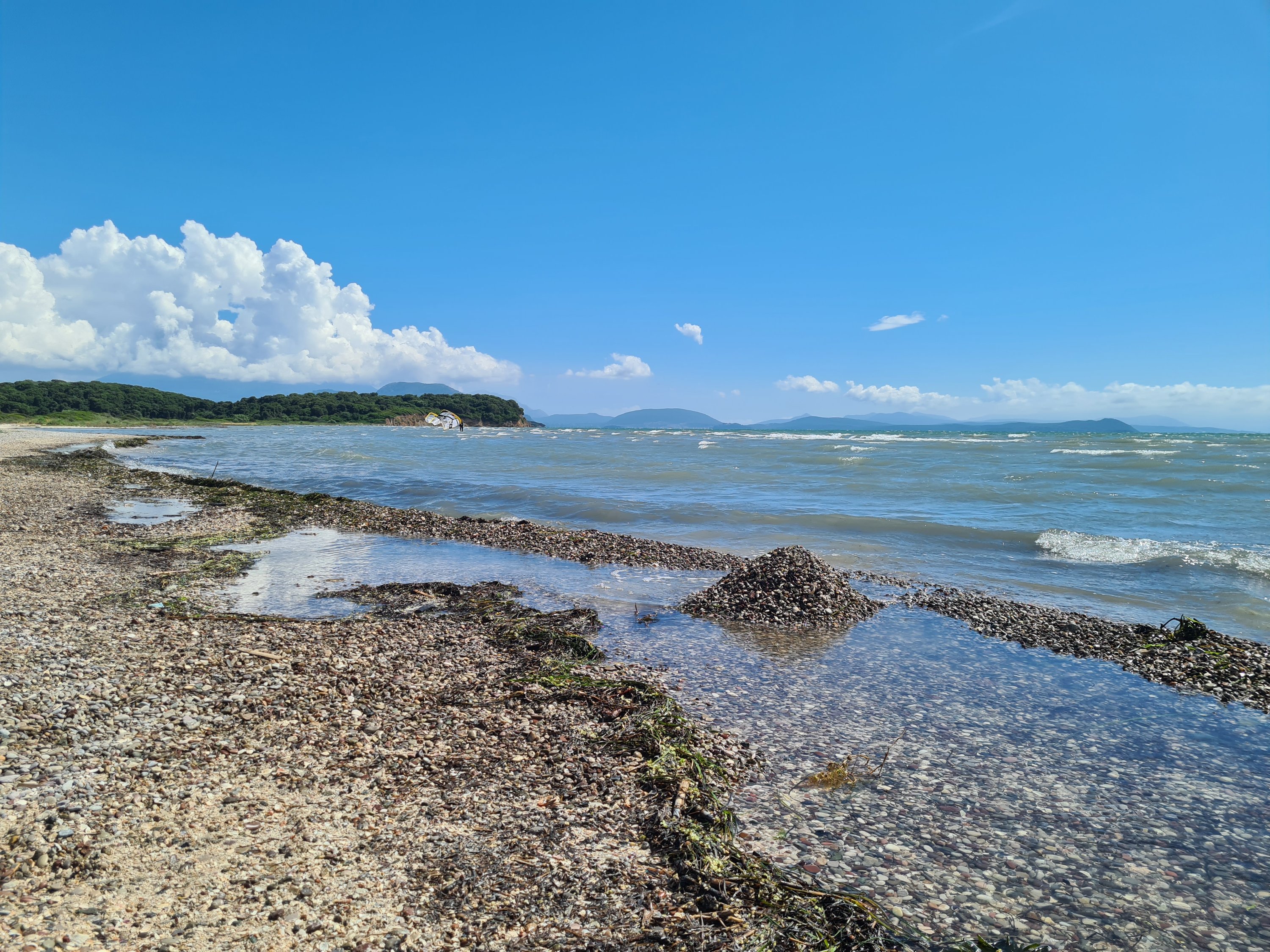 Hier in Koronisia schleicht sich immer die gleiche Routine ein: Morgens bis 9 Uhr schlafen, nach dem Frühstück mit Blick auf das Meer lesen, ein Bad zur Abkühlung nehmen und hoffen, dass sich am Mittag die Thermik durchsetzt. Wir informieren uns ja normalerweise über Windapps, aber hier in Koronisia ist keine Messstation und die kleine lokale Thermik wird von den umliegenden Messpunkten nicht erfasst. Hier zählt daher Erfahrung und Bauchgefühl.