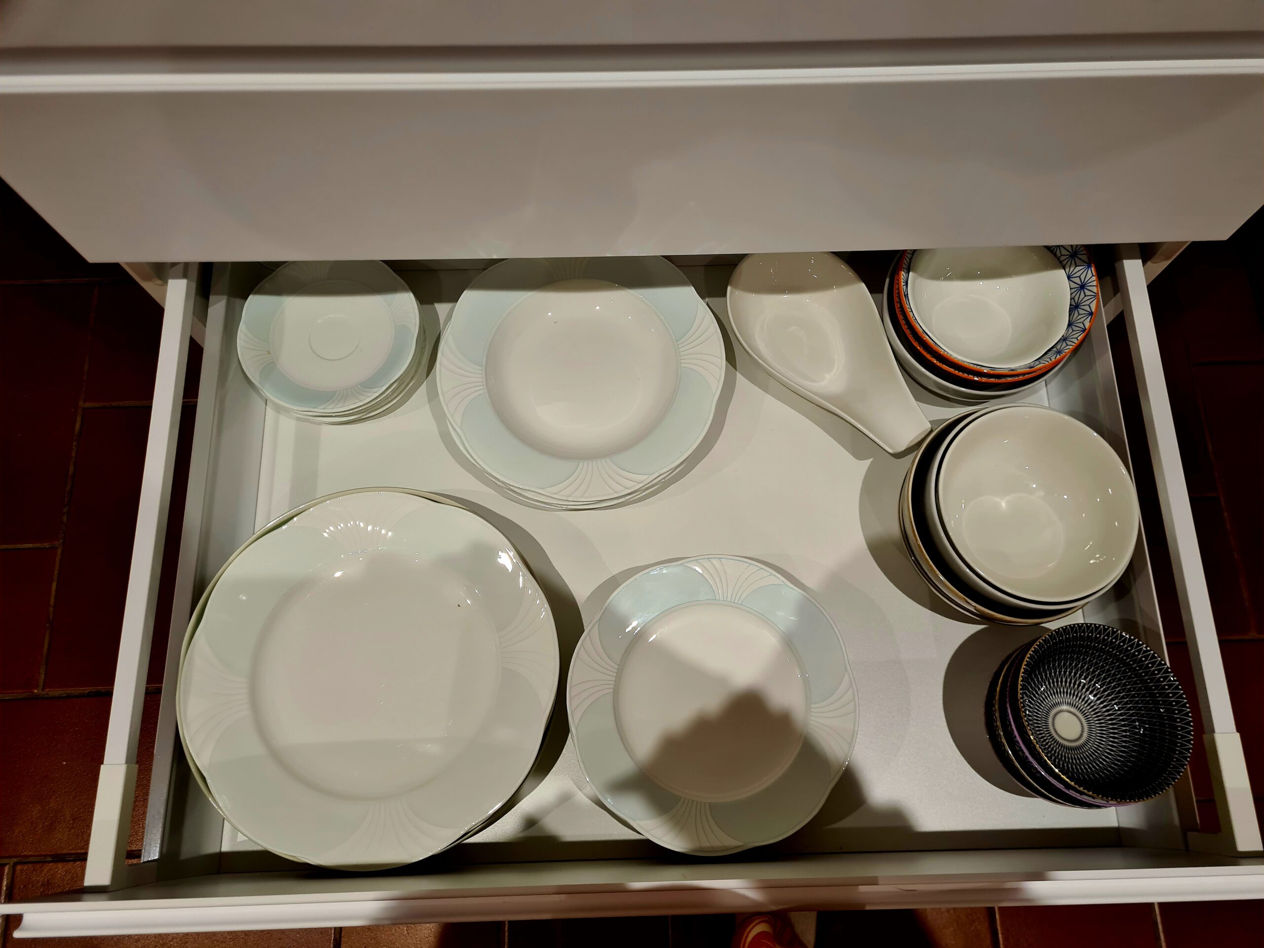 Weiße, schlichte Küchenmöbel und weiße Fliesen. Unsere Kinder werden die Hände über dem Kopf zusammenschlagen. Sie mögen diesen Zahnarztpraxis-Stil nicht. Aber uns gefällt es.