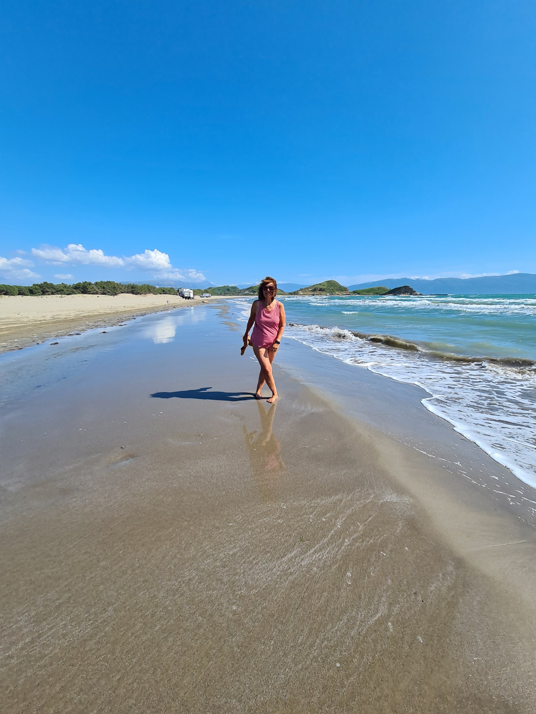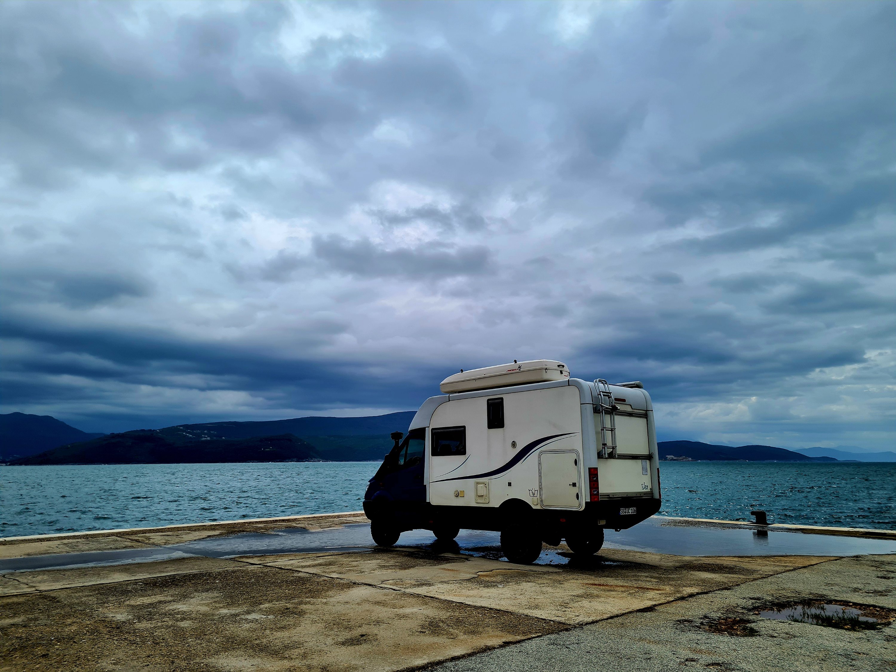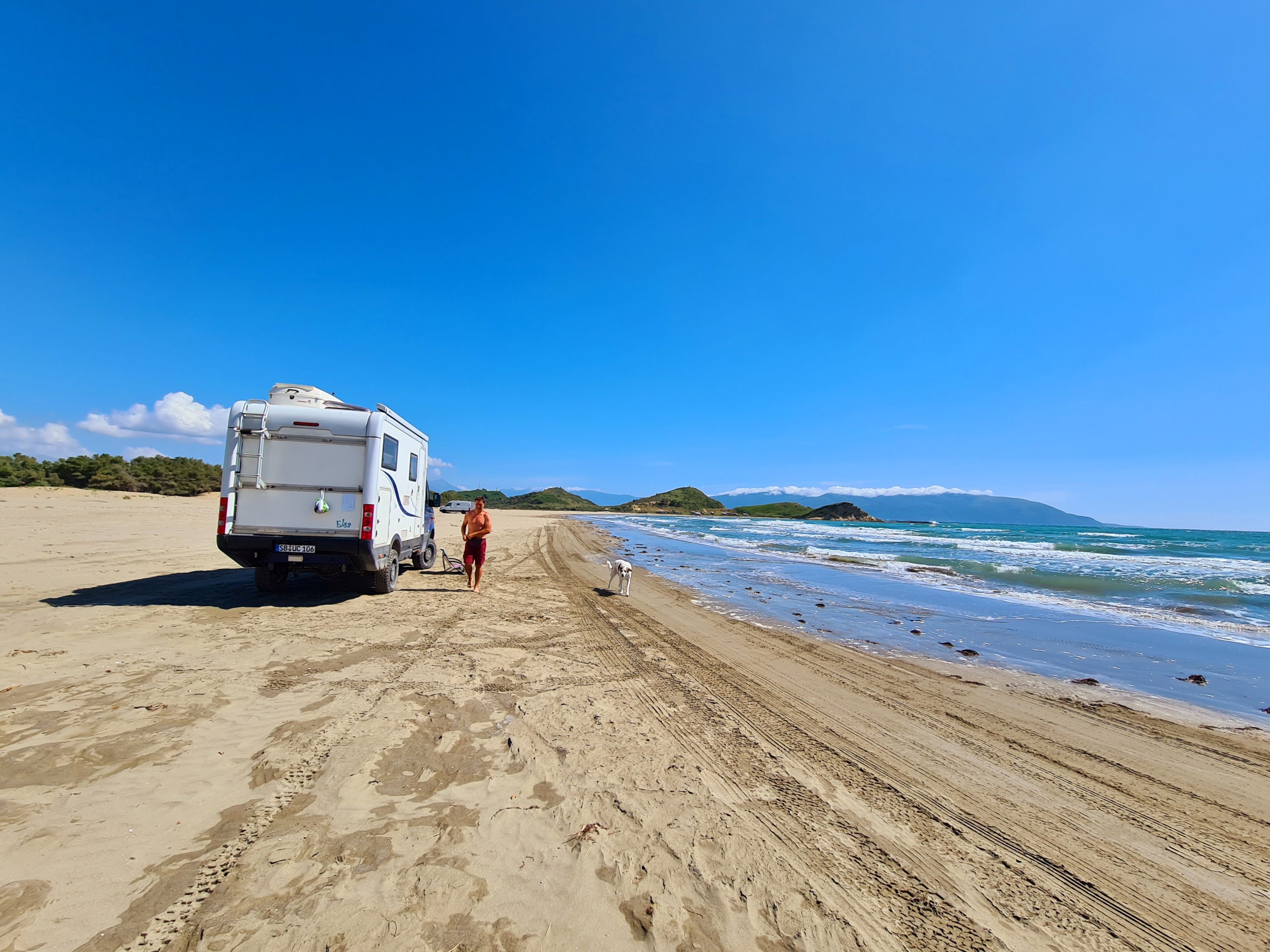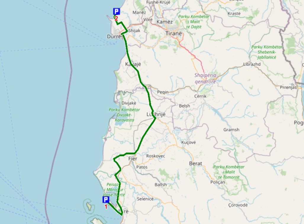 Bis zur Fähre sind es von unserem Campingplatz noch 20 km. Für diese Strecke muss man eine Stunde einplanen. Schlaglöcher gibt es schon noch auf diesem Streckenabschnitt, aber nur solche Löcher, die man langsam durchfahren kann. Außerdem gibt es eine Verbesserung beim albanischen Straßenbau. Es geht jetzt eine Person mit Schippe die Straße entlang und füllt in die tiefsten Löcher Erde ein. Aus welchem Grund immer nur kurze Teilstücke von 100 m neu geteert werden, erschließt sich uns nicht. Auf jeden Fall ist der Straßenbau vorangekommen. Vor 10 Jahren war es viel schlimmer. Das ist das einzige Schlagloch auf der ganzen Strecke, was mit Steinen „abgesichert“ ist.