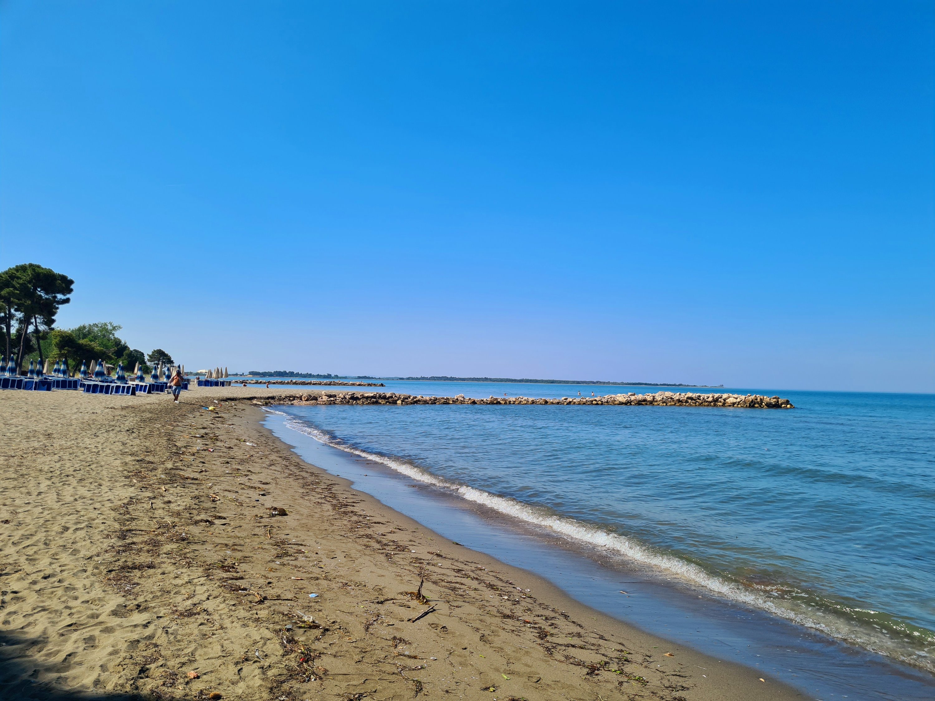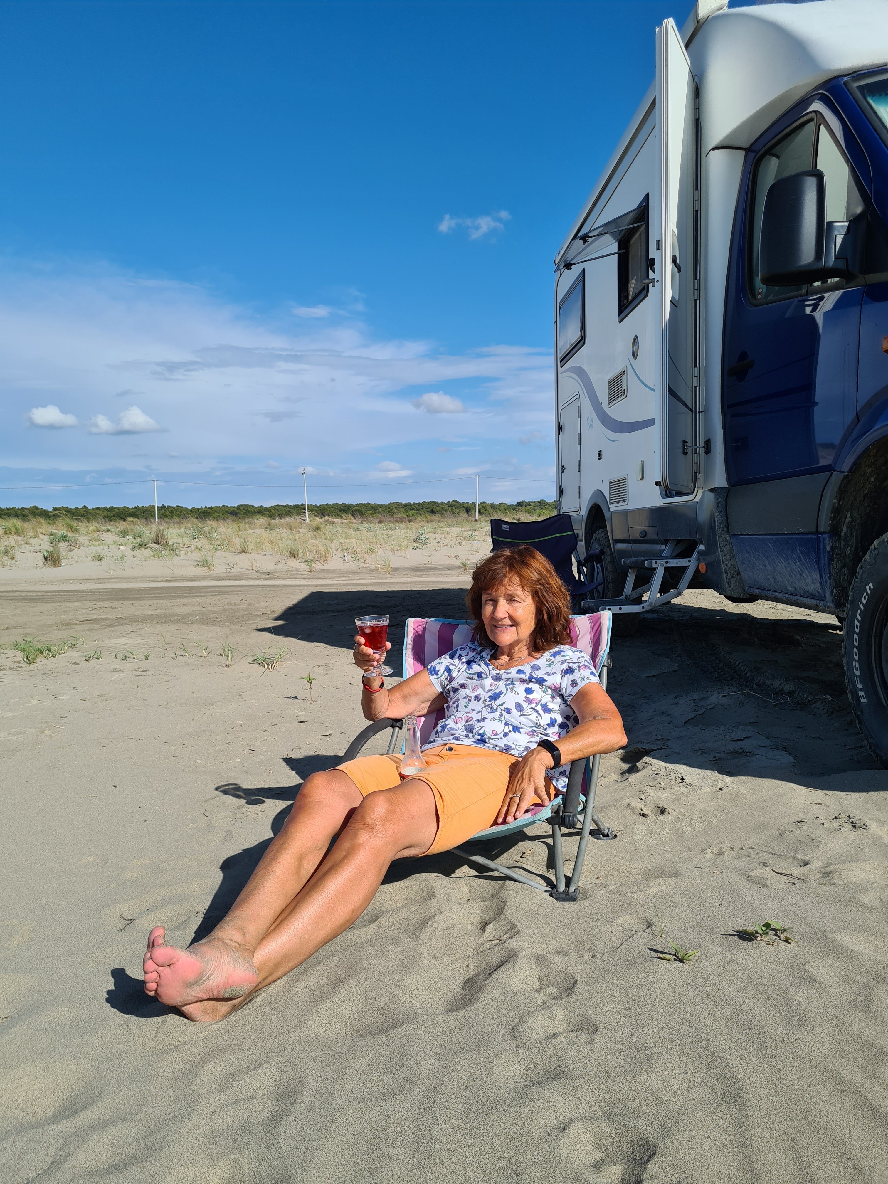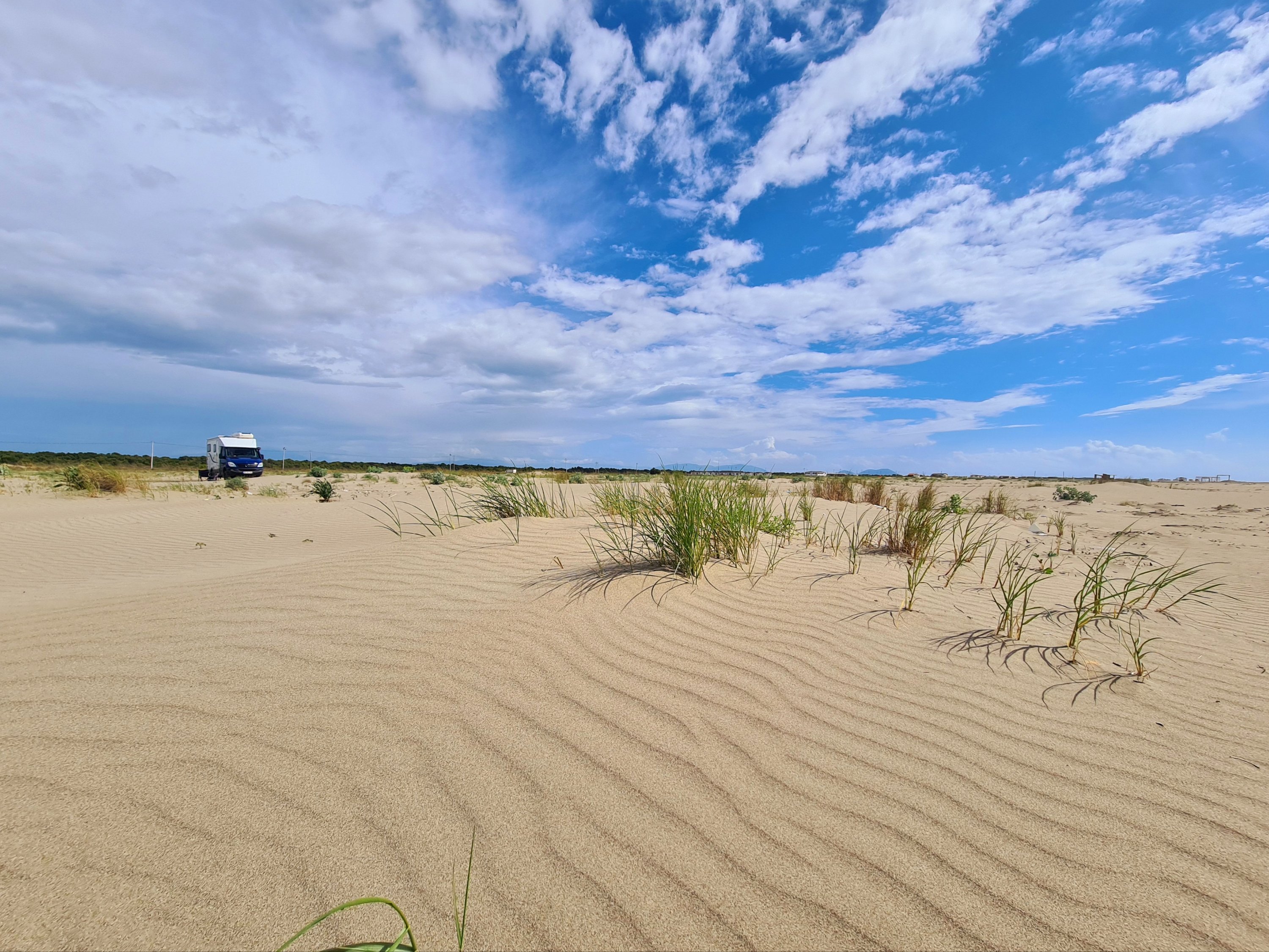 Bis zur Fähre sind es von unserem Campingplatz noch 20 km. Für diese Strecke muss man eine Stunde einplanen. Schlaglöcher gibt es schon noch auf diesem Streckenabschnitt, aber nur solche Löcher, die man langsam durchfahren kann. Außerdem gibt es eine Verbesserung beim albanischen Straßenbau. Es geht jetzt eine Person mit Schippe die Straße entlang und füllt in die tiefsten Löcher Erde ein. Aus welchem Grund immer nur kurze Teilstücke von 100 m neu geteert werden, erschließt sich uns nicht. Auf jeden Fall ist der Straßenbau vorangekommen. Vor 10 Jahren war es viel schlimmer. Das ist das einzige Schlagloch auf der ganzen Strecke, was mit Steinen „abgesichert“ ist.