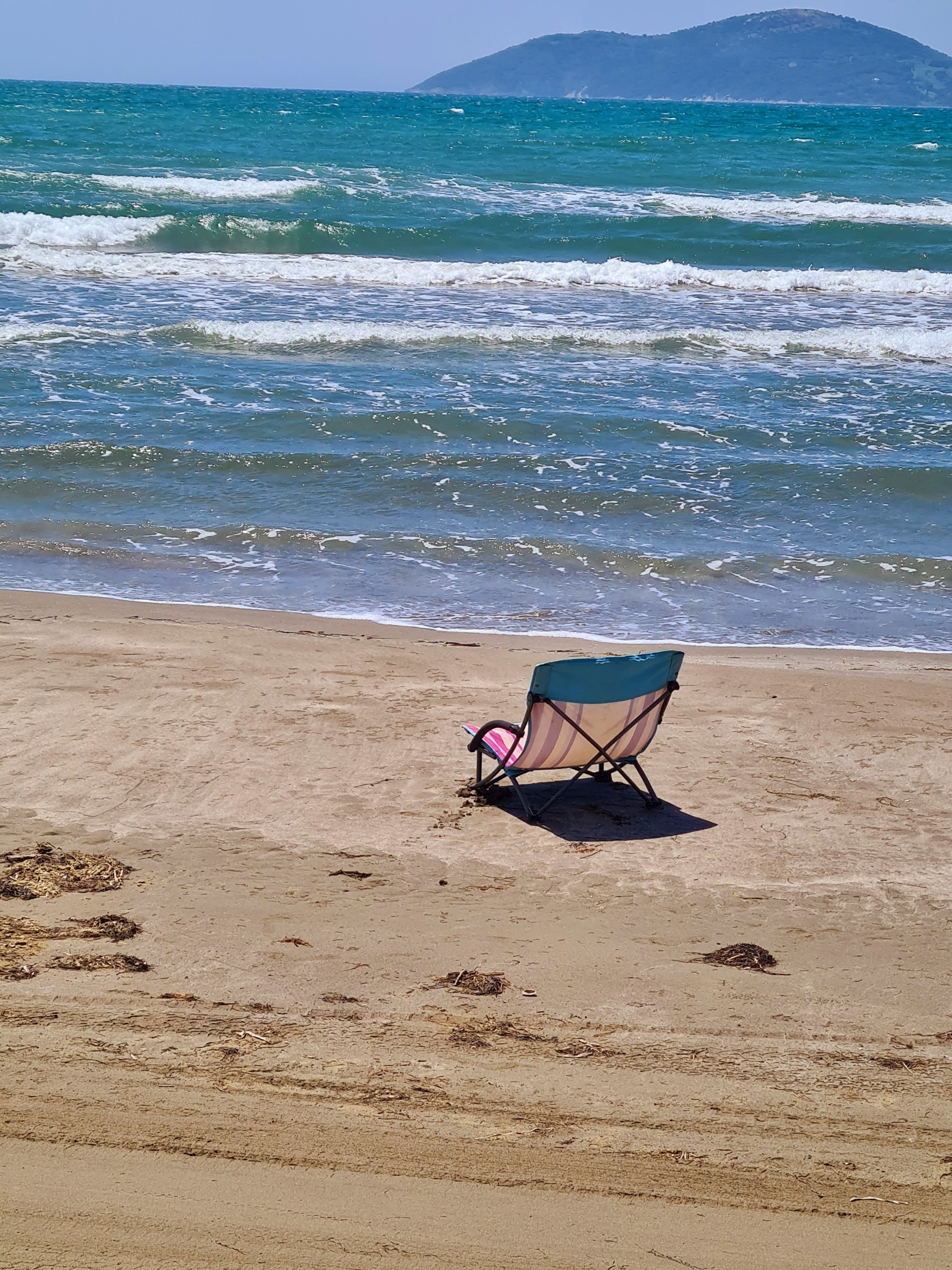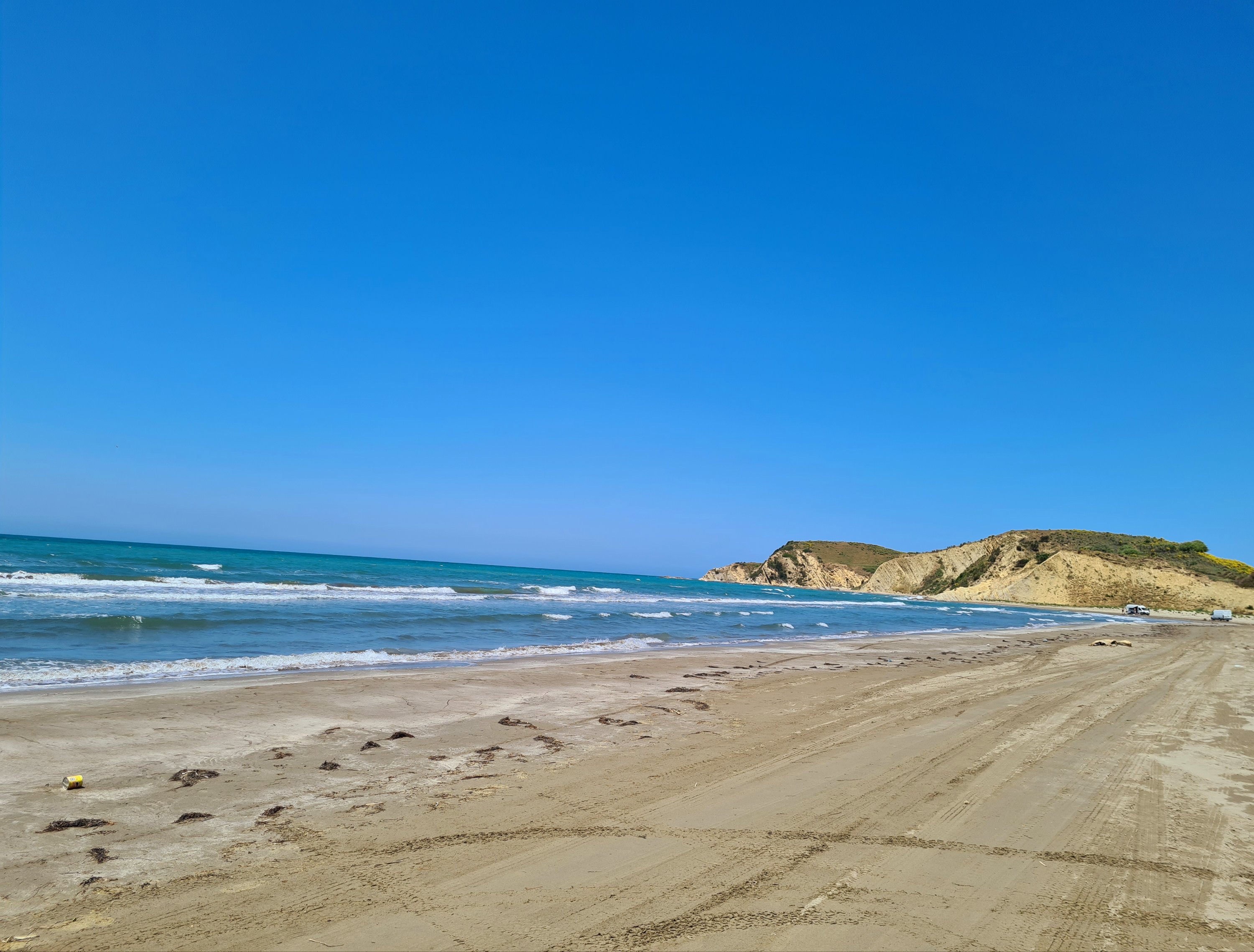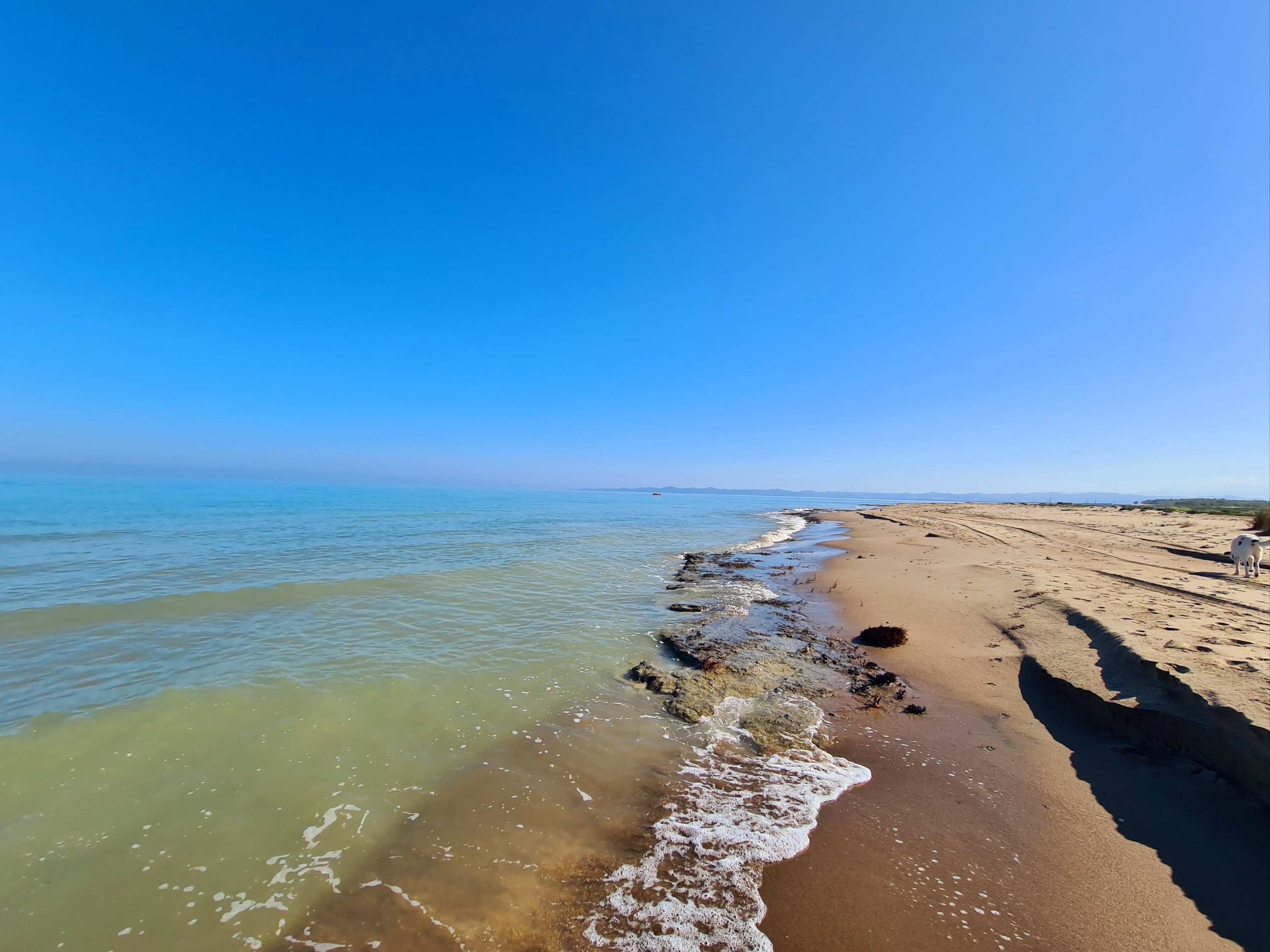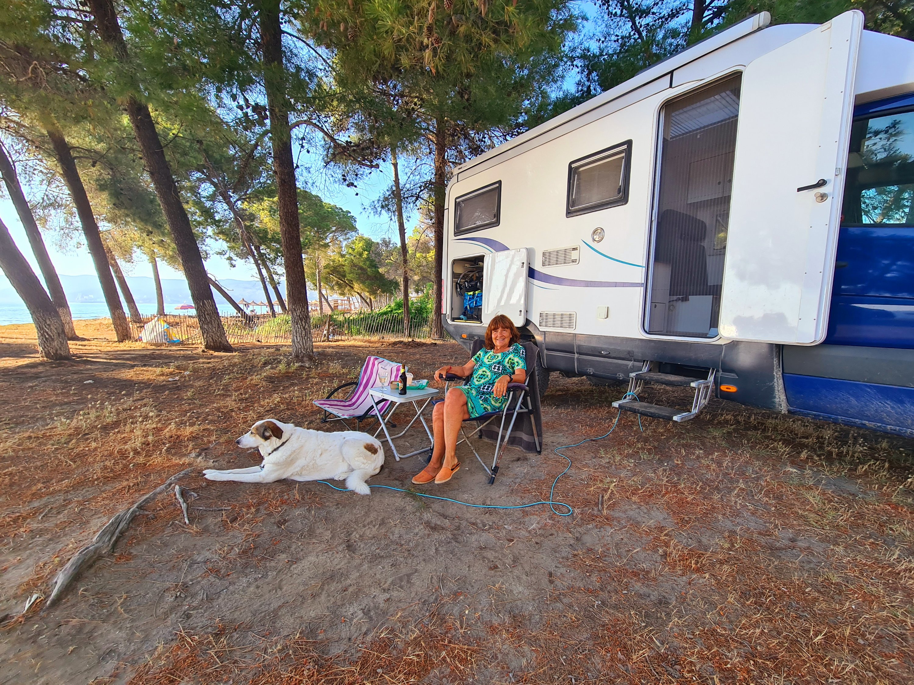 Bis zur Fähre sind es von unserem Campingplatz noch 20 km. Für diese Strecke muss man eine Stunde einplanen. Schlaglöcher gibt es schon noch auf diesem Streckenabschnitt, aber nur solche Löcher, die man langsam durchfahren kann. Außerdem gibt es eine Verbesserung beim albanischen Straßenbau. Es geht jetzt eine Person mit Schippe die Straße entlang und füllt in die tiefsten Löcher Erde ein. Aus welchem Grund immer nur kurze Teilstücke von 100 m neu geteert werden, erschließt sich uns nicht. Auf jeden Fall ist der Straßenbau vorangekommen. Vor 10 Jahren war es viel schlimmer. Das ist das einzige Schlagloch auf der ganzen Strecke, was mit Steinen „abgesichert“ ist.