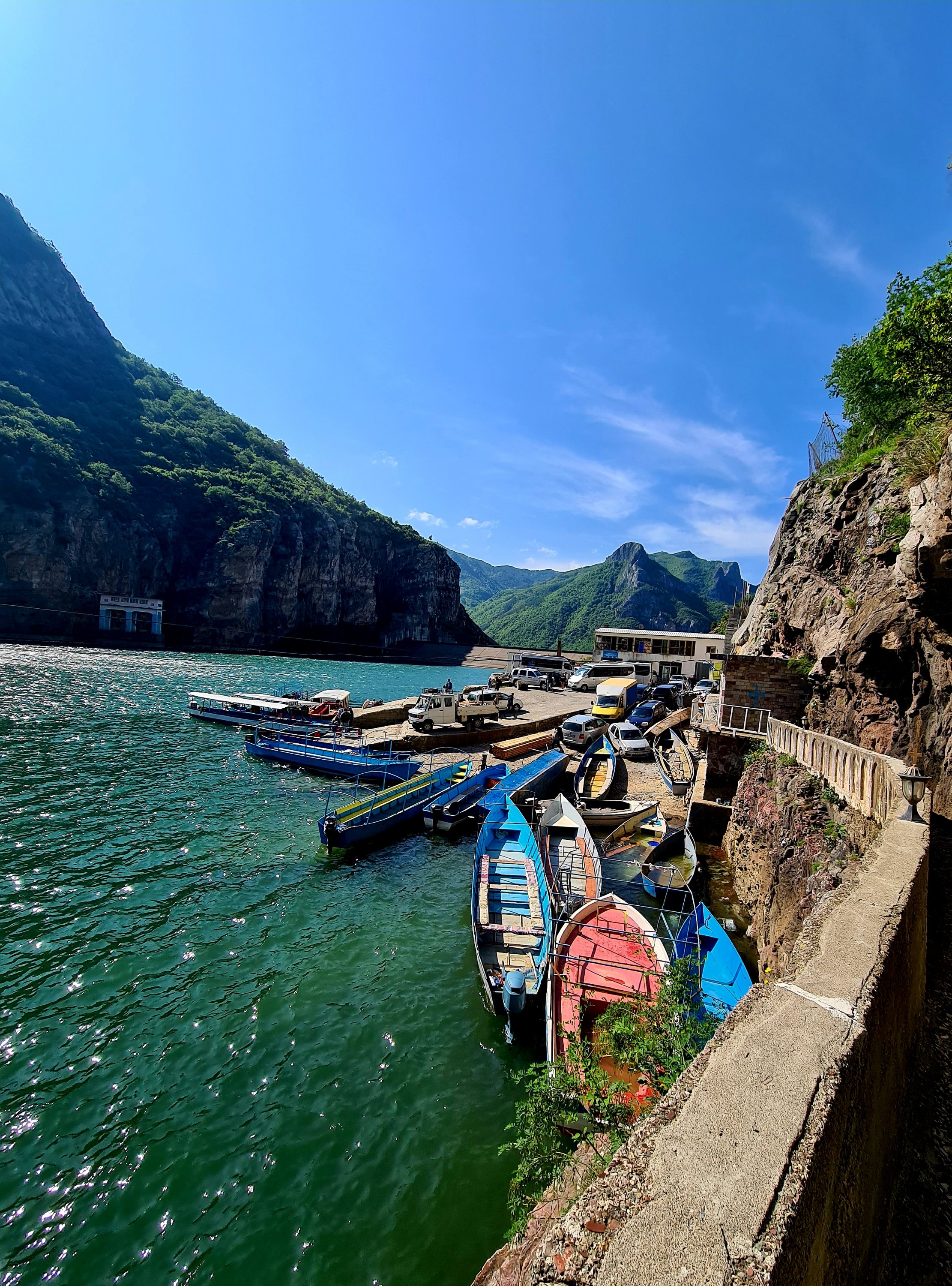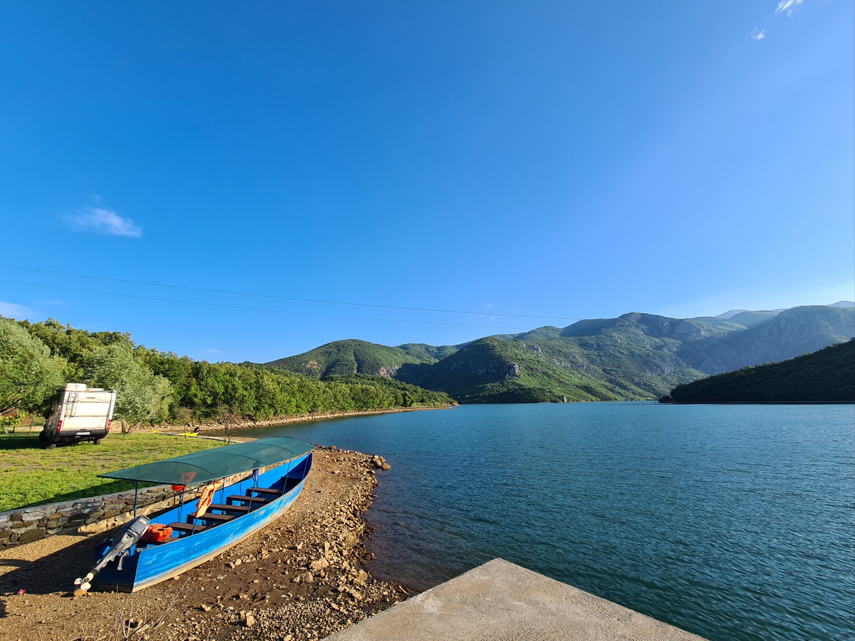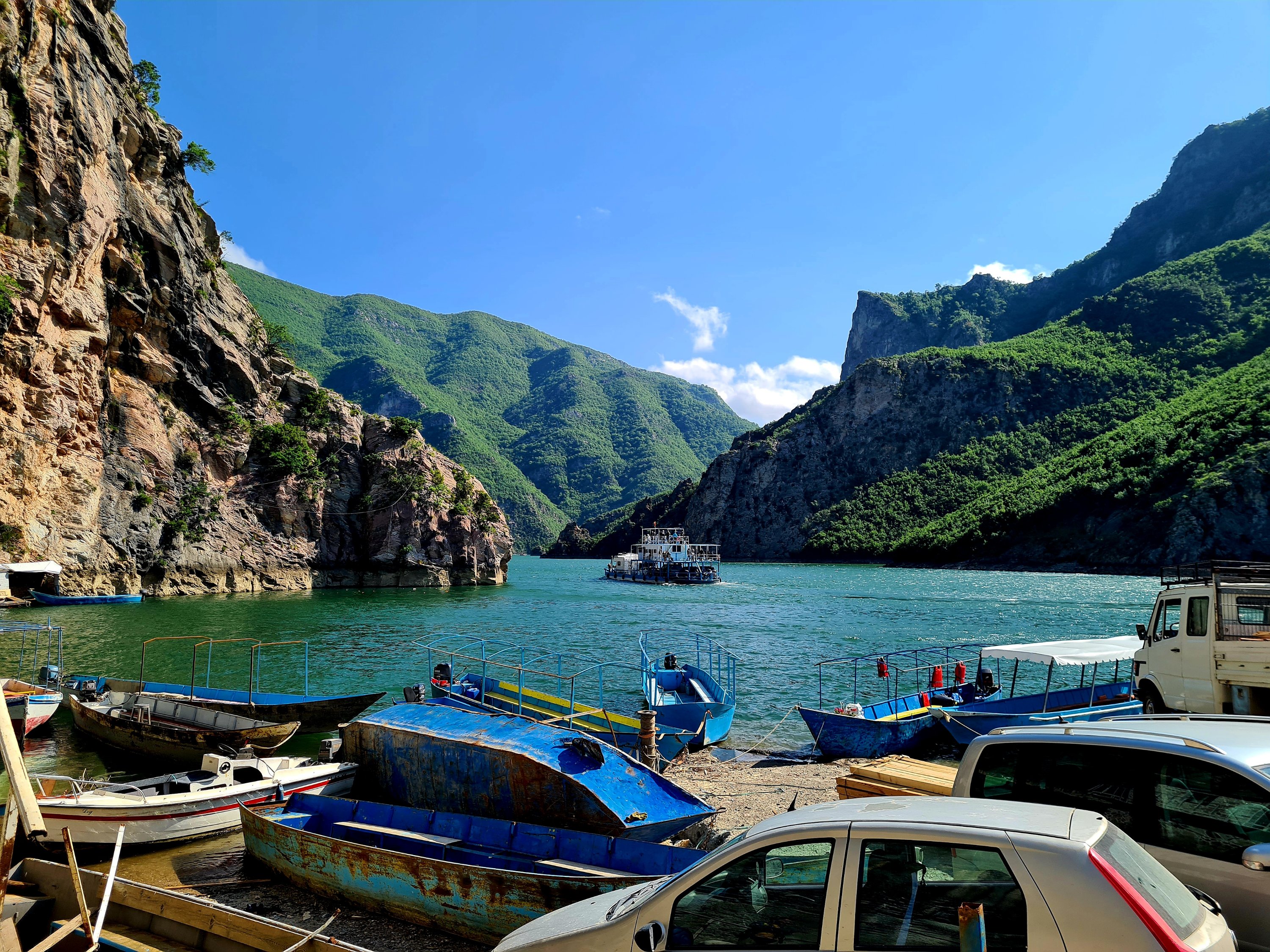 Die meisten Wohnmobilfahrer fahren mit der Fähre von Koman nach Fierze. Diese Route hat mitlerweile Kultstatus, aber wegen des schlechten Wetters im Valbona-Tal haben wir uns gegen diese Route entschieden. Wir hatten zuerst noch überlegt, Hin- und Rückfahrt als Fußgänger mit dieser Fähre zu buchen. 5 Stunden auf dem Wasser unter beengten Verhältnissen erschien uns allerdings dann doch zu lang. Im Internet haben wir uns Ausflüge mit kleineren Booten angesehen und uns schließlich zu einem Ausflug auf den Shala, einem Zufluß zum Koman See, entschieden.